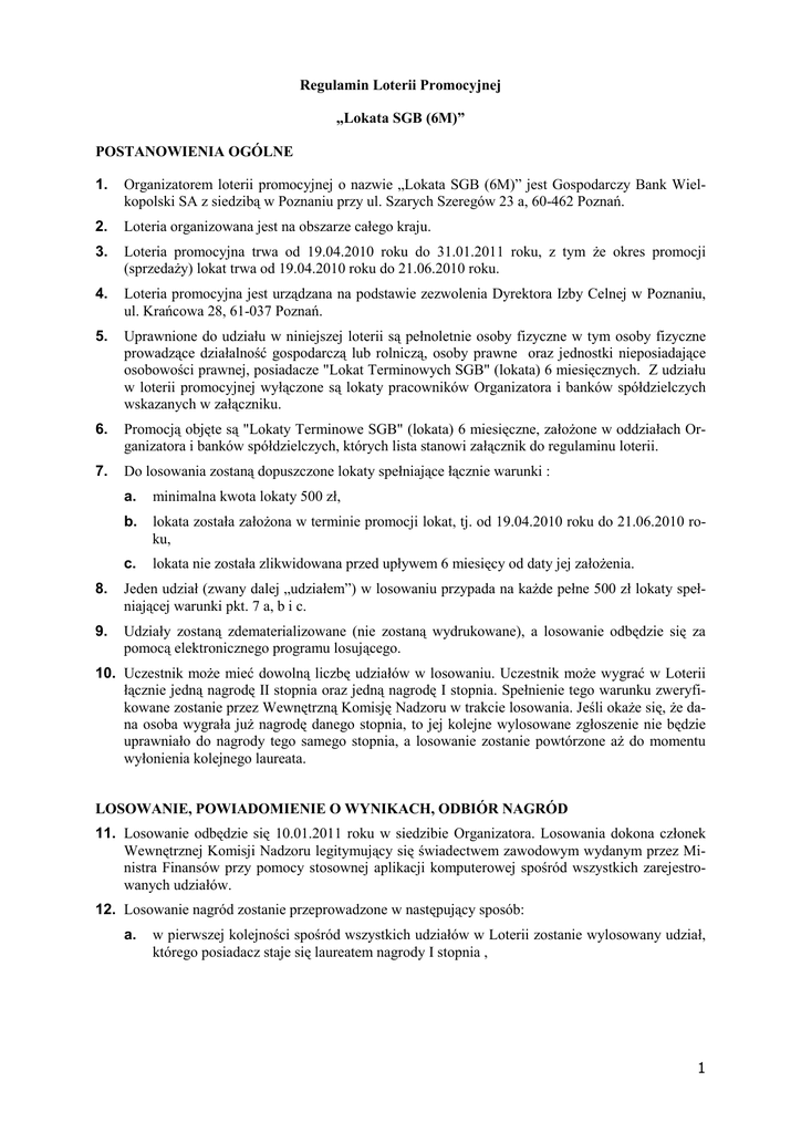 Regulamin Loterii Promocyjnej „Lokata SGB (6M)” POSTANOWIENIA OGÓLNE 1. Organizatorem loterii promocyjnej o nazwie „Lokata SGB (6M)” jest Gospodarczy Bank Wielkopolski SA z siedzibą w Poznaniu przy ul. Szarych Szeregów 23 a, 60-462 Poznań. 2. Loteria organizowana jest na obszarze całego kraju. 3. Loteria promocyjna trwa od 19.04.2010 roku do 31.01.2011 roku, z tym Ŝe okres promocji (sprzedaŜy) lokat trwa od 19.04.2010 roku do 21.06.2010 roku. 4. Loteria promocyjna jest urządzana na podstawie zezwolenia Dyrektora Izby Celnej w Poznaniu, ul. Krańcowa 28, 61-037 Poznań. 5. Uprawnione do udziału w niniejszej loterii są pełnoletnie osoby fizyczne w tym osoby fizyczne prowadzące działalność gospodarczą lub rolniczą, osoby prawne oraz jednostki nieposiadające osobowości prawnej, posiadacze "Lokat Terminowych SGB" (lokata) 6 miesięcznych. Z udziału w loterii promocyjnej wyłączone są lokaty pracowników Organizatora i banków spółdzielczych wskazanych w załączniku. 6. Promocją objęte są "Lokaty Terminowe SGB" (lokata) 6 miesięczne, załoŜone w oddziałach Organizatora i banków spółdzielczych, których lista stanowi załącznik do regulaminu loterii. 7. Do losowania zostaną dopuszczone lokaty spełniające łącznie warunki : a. minimalna kwota lokaty 500 zł, b. lokata została załoŜona w terminie promocji lokat, tj. od 19.04.2010 roku do 21.06.2010 roku, c. lokata nie została zlikwidowana przed upływem 6 miesięcy od daty jej załoŜenia. 8. Jeden udział (zwany dalej „udziałem”) w losowaniu przypada na kaŜde pełne 500 zł lokaty spełniającej warunki pkt. 7 a, b i c. 9. Udziały zostaną zdematerializowane (nie zostaną wydrukowane), a losowanie odbędzie się za pomocą elektronicznego programu losującego. 10. Uczestnik moŜe mieć dowolną liczbę udziałów w losowaniu. Uczestnik moŜe wygrać w Loterii łącznie jedną nagrodę II stopnia oraz jedną nagrodę I stopnia. Spełnienie tego warunku zweryfikowane zostanie przez Wewnętrzną Komisję Nadzoru w trakcie losowania. Jeśli okaŜe się, Ŝe dana osoba wygrała juŜ nagrodę danego stopnia, to jej kolejne wylosowane zgłoszenie nie będzie uprawniało do nagrody tego samego stopnia, a losowanie zostanie powtórzone aŜ do momentu wyłonienia kolejnego laureata. LOSOWANIE, POWIADOMIENIE O WYNIKACH, ODBIÓR NAGRÓD 11. Losowanie odbędzie się 10.01.2011 roku w siedzibie Organizatora. Losowania dokona członek Wewnętrznej Komisji Nadzoru legitymujący się świadectwem zawodowym wydanym przez Ministra Finansów przy pomocy stosownej aplikacji komputerowej spośród wszystkich zarejestrowanych udziałów. 12. Losowanie nagród zostanie przeprowadzone w następujący sposób: a. w pierwszej kolejności spośród wszystkich udziałów w Loterii zostanie wylosowany udział, którego posiadacz staje się laureatem nagrody I stopnia , 1 b. następnie zostaną rozlosowane nagrody II stopnia– spośród udziałów sporządzonych na podstawie lokat załoŜonych w danym banku. Rodzaj i ilość losowanych nagród II stopnia przypadających na dany bank określa załącznik do regulaminu loterii. Nagrody II stopnia będą losowane w kolejności od najbardziej do najmniej wartościowych. Łącznie zostanie rozlosowanych 608 nagród II stopnia. 13. Określenie rodzaju i wartości nagród: a. Nagroda I stopnia – samochód marki BMW X 1 o wartości rynkowej 117.572,00 zł brutto – 1 nagroda. W sytuacji, gdy Zwycięzcą nagrody I Stopnia zostanie Konsument (w rozumieniu Art. 221 Kodeksu Cywilnego), nagroda I stopnia składać się będzie z samochodu marki BMW o wartości 117.572,00 zł brutto oraz dodatkowej nagrody w postaci kwoty pienięŜnej w wysokości 13.064,00 zł, która nie podlega wypłacie na rzecz Laureata. Kwota ta zostanie przeznaczona na zapłatę podatku dochodowego od wygranej w Loterii. Łączna maksymalna wartość nagrody I stopnia uwzględniająca podatek wynosić będzie 130.636,00 zł brutto. Organizator nie przewidział dodatkowej nagrody w postaci kwoty pienięŜnej w sytuacji, kiedy Laureat nagrody I stopnia będzie zobowiązany do rozliczenia podatkowego wygranej nagrody na zasadach innych niŜ wskazane w art. 30 ustawy o podatku dochodowym od osób fizycznych (Ustawa z dnia 26 lipca 1991 r.; tekst jednolity Dz.U. z 2000 r. nr 14, poz 176, z późn. zm.) b. Nagrody II stopnia o łącznej wartości uwzględniającej podatek w wys. 729.368,00 zł brutto: i. Samochód osobowy marki Opel Corsa o wartości rynkowej 44.540,00 zł brutto – 4 nagrody. W sytuacji, gdy Zwycięzcą nagrody zostanie Konsument, nagroda składać się będzie z samochodu marki Opel Corsa o wartości 44.540,00 zł brutto oraz dodatkowej nagrody w postaci kwoty pienięŜnej w wysokości 4.949,00 zł, która nie podlega wypłacie na rzecz Laureata. Kwota ta zostanie przeznaczona na zapłatę podatku dochodowego od wygranej w Loterii. Łączna maksymalna wartość jednej nagrody uwzględniająca podatek wynosić będzie 49.489,00 zł brutto. Łączna wartość 4 nagród uwzględniająca podatek wynosić będzie 197.956,00 zł brutto. Organizator nie przewidział dodatkowej nagrody w postaci kwoty pienięŜnej w sytuacji, kiedy Laureat nagrody w postaci samochodu marki Opel Corsa będzie zobowiązany do rozliczenia podatkowego wygranej nagrody na zasadach innych niŜ wskazane w art. 30 ustawy o podatku dochodowym od osób fizycznych (Ustawa z dnia 26 lipca 1991 r.; tekst jednolity Dz.U. z 2000 r. nr 14, poz 176, z późn. zm.) ii. motorower - Romet 747 2T o wartości 3.399,00 zł brutto – 28 nagród. W sytuacji, gdy Zwycięzcą nagrody zostanie Konsument, nagroda składać się będzie z motoroweru o wartości 3.399,00 zł brutto oraz dodatkowej nagrody w postaci kwoty pienięŜnej w wysokości 378,00 zł, która nie podlega wypłacie na rzecz Laureata. Kwota ta zostanie przeznaczona na zapłatę podatku dochodowego od wygranej w Loterii. Łączna maksymalna wartość jednej nagrody uwzględni
