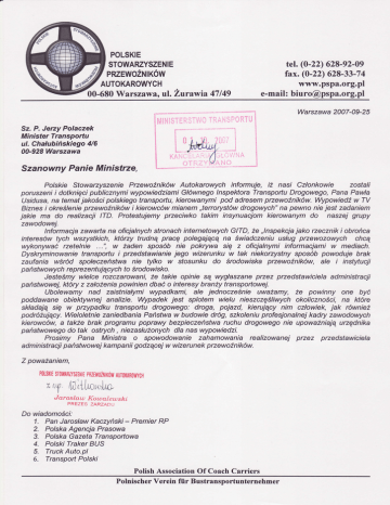 POLSKIE STOWAMYSZENIE PRZEWoŹNlKoW AUTOKAROWYCH 00-680Warszawa. ul. Zurawia 47149 tel. (0-22) 628-92-09 fax. (0-22) 628-33-74 www.pspa.org.pl e-mail:[email protected] Warszawa2007-09-25 Sz. P. Jerzy Polaczek Minister Transportu ul. Chałubińskiego 4/6 00-928Warszawa Szanowny Panie Mi nistrze, Polskie Stowarzyszenie PrzewoźnikÓwAutokarowych informuje, iż nasi Członkowie zostali poruszenii dotknięcipublicznymiwypowiedziamiGłownegolnspektoraTranspottuDrogowego,Pana Pawła Usidusa,na tematjakościpolskiego transportu,kierowanymipod adresemprzewoźników.Wypowiedźw TV przewoŹnikÓwi kierowcÓwmianem,,terrorystÓwdrogowych',na pewno nie jest zadaniem Biznes i określenie jakie ma do realizacji lTD. Protestujemyprzeciwko takim insynuacjom kierowanym do naszej grupy zawodowej. lnformacjazawartana oficjalnychstronachinternetovtychGlTD, że,,lnspekcjajako rzecznik i obrońca interesÓw tych wszystkich, ktorzy trudnq pracę polegajqcq na Świadczeniu usługprzewozowych chcq wykonywać rzetelnie .,, w iaden sposóÓ nie pokrywa się z oficjalnymi informacjami w mediach. Dyskryminowanietransportui pnedstawianiejego wizerunku w tak niekorzystny sposob powoduje brak zaufania wśrÓd społeczeństwa nie tylko w stosunku do środowiskapnewoźnikow, ale i instytucji pań stwov,ty ch reprezentujqcych to Ś rodowisko. przez przedstawicielaadministracji Jesteśmywielce rozczarowani,że takie opinie sq vvygłaszane państwowej,ktoryz założeniapowiniendbać o interesybranŻytransportowej. Ubolewamy nad zaistniałymi wypadkami, ale jednoczeŚnie uważamy, że powinny one być poddawane obiektywnej analizie' Wypadek 1'esf sp/ofem wielu nieszczęśliwychokoliczności,na ktÓre składajq s/ę W przypadku transportu drogowego: droga, pojazd, kierujqcy nim człowiek,jak rÓwnież podrÓżujqcy.WieloletniezaniedbaniaPaństwa w budowiedrog,szkoleniuprofesjonalnejkadry zawodowych kierowcÓw,a takżebrak programupoprawy bezpieczeństwaruchu drogowegonie upoważniajqurzędnika państwowegodo tak ostrych, niezasłużonychdla nas wypowiedzi' Prosimy Pana Ministra o spowodowanie zahamowania realizowanej przez przedstawiciela m i n i ad stracji państwowejkampanii godzqcej w wizerunek przewoŹnikow. Z powaŻaniem, PolsnE sT0lłlABiYsf E|'łlE PRZEl'tlollli|(Ów lulo|(nRowyctt r*tr I I \ L"p /LurtLt0udlć, Jaros ł'ausl{otualetp s ki PREZES ZARZADU Do wiadomości: 1' Pan Jarosław Kaczyński_ Premier RP 2. Polska Agencja Prasowa 3. Polska Gazeta Transportowa 4. PolskiTraker BUS 5. Truck Auto.pl 6. Transport Polski Polish Association Of Coach Carriers Polnischer Verein fiir Bustransportunternehmer