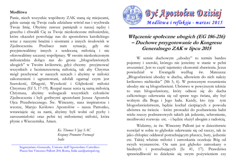 Modlitwa Panie, niech wszystkie wspólnoty ZAK staną się miejscami, gdzie uznaje się Twoje cuda zdziałane wśród nas i wychwala Twoje Imię. Obyśmy zawsze pamiętali o naszej nędzy i grzechu i chwalili Cię za Twoje nieskończone miłosierdzie, które okazałeś powołując nas do apostolstwa katolickiego wraz z naszymi braćmi i siostrami z innych środowisk w Zjednoczeniu. Przebacz nam sytuacje, gdy nie przyjmowaliśmy innych z serdeczną miłością i nie oferowaliśmy szczerej współpracy. W swoim nieskończonym miłosierdziu dołącz nas do grona „błogosławionych ubogich” w Twoim królestwie, gdyż chcemy przyjmować wszystkich z bezinteresowną miłością, tak aby Chrystus mógł przebywać w naszych sercach i abyśmy w miłości zakorzenieni i ugruntowani, zdołali ogarnąć czym jest Szerokość, Długość, Wysokość i Głębokość miłości Chrystusa (Ef 3, 17-19). Rozpal nasze serca tą samą miłością Chrystusa, abyśmy wzbogacali wszystkich członków Zjednoczenia i byli gorliwymi apostołami Jezusa Apostoła Ojca Przedwiecznego. Św. Wincenty, nasz inspiratorze i wzorze, Maryjo Królowo Apostołów – nasza Patronko, wstawiajcie się za nami, abyśmy byli wolni od pychy i zarozumiałości oraz pełni tej miłosiernej miłości, która płynie z Wieczernika. Amen. Ks. Thomas Vijay SAC Krajowy Promotor Formacji Indie ____________________________________________________ Segretariato Generale, Unione dell’Apostolato Cattolico Piazza San Vincenzo Pallotti 204, Roma, Italia [email protected] Włączenie społeczne ubogich (EG 186-216) – Duchowe przygotowanie do Kongresu Generalnego ZAK w lipcu 2015 W sensie duchowym „ubodzy” to termin bardzo pojemny i szeroki, którego nie jesteśmy w stanie w pełni zrozumieć. Jest to część tajemnicy ekonomii zbawienia. Jezus powiedział w Ewangelii według św. Mateusza: ,,Błogosławieni ubodzy w duchu, albowiem do nich należy królestwo niebieskie” (Mt 5, 6). W potocznym rozumieniu ubodzy nie są błogosławieni. Ubóstwo w powyższym tekście to stan błogosławiony, który odnosi się do ducha całkowitego oderwania się od spraw tego świata, aby być wolnym dla Boga i Jego ludu. Każdy, kto żyje tym błogosławieństwem, będzie kochał cierpiących z powodu ubóstwa na świecie - które prowadzi do pozbawienia ludzi wielu rzeczy podstawowych takich jak jedzenie, schronienie, możliwości rozwoju etc. - i będzie służył ubogim z radością. Widzimy, że św. Wincenty Pallotti już w dzieciństwie rozwijał w sobie to głębokie oderwanie się od rzeczy, tak że jako chłopiec oddawał potrzebującym płaszcz, buty, jedzenie etc. Takiej właśnie miłości i zatroskania oczekuje Bóg od swych wyznawców. On sam jest głęboko zatroskany o biednych i potrzebujących (Iz 41, 17). Prawdziwa sprawiedliwość to dzielenie się swym pożywieniem czy ubraniem z potrzebującymi (Iz 58, 7), a Bóg będzie błogosławił i umacniał ręce tych, którzy w taki sposób służą ubogim (Iz 58, 10-12). Miłość do ubogich będzie miarą zastosowaną na sądzie ostatecznym (Mt 25, 34-40). W ludzkim życiu są jeszcze inne wymiary ubóstwa. Jak czytamy w Rdz 4, 5 ofiara Kaina była marna i nie mogła być przyjęta przez Boga, gdyż Kain był zarozumiały i arogancki (Rdz 4,9). Chciał, by Bóg przyjął go na jego warunkach. Bóg pokazał Kainowi sposób na to, by i on stał się miłym w Jego oczach (Rdz 4, 7). Mimo to Kain nie tylko odrzucił miłość do brata i troskę o niego, ale nawet go zabił. A Bóg przychodzi do niego z wielkim zatroskaniem: ,,Gdzie jest brat twój, Abel? Cóżeś uczynił?” (Rdz 4, 9-10). Kain nie okazał wcale żalu z powodu swego czynu, ściągając na siebie Boży gniew. To jest ubóstwo tych, którzy mają za dużo, są egocentryczni i ciągle kieruje nimi żądza władzy, własnej chwały i majątku. Takich ludzi znajdujemy wszędzie i często z ich powodu inni pozbawiani są swych praw i spełnienia uzasadnionych potrzeb, a oni sami przyczyniają się do podtrzymywania niesprawiedliwych systemów społecznych i stosunków międzyludzkich. Zdarza się to w rodzinach, na plebaniach, we wspólnotach zakonnych, w organizacjach i pomiędzy narodami. Pallotti widział, że w jego czasach nawet w Kościele niektórzy zabiegają o własną chwałę pozostawiając ludzi z ich niedolą. Założył Zjednoczenie Apostolstwa Katolickiego, aby dać ludziom z różnych środowisk możliwość, by poczuli się jak w domu, pod opieką, aby pomóc w niesieniu radości i szczęścia wszystkim bez zaspokajania własnych zachcianek, a wszystko w jednym celu – na nieskończoną chwałę Bożą. Wiem, że wiele grup Zjednoczenia spośród tych, które spotkałem w różnych częściach świata, znalazło sposób, aby zbudować wspólnoty na wzór domu, złożone z ludzi z różnych środowisk. Jedno z moich wspomnień pochodzi z roku 2000, kiedy to z członkami ZAK w Berlinie chodziłem w zimną noc rozdając ciepłą zupę i koce biednym śpiącym na chodnikach. Inne znów wspomnienie mam z Kalikut w stanie Kerala w Indiach, gdzie członkowie ZAK uzbierali 3, 5 miliona rupii (ok. 49.500 €/56.000 USD) na budowę domu dla osób porzuconych. To są ludzie w Zjednoczeniu, którzy należą do „błogosławionych ubogich”. Kiedy członkowie ZAK odmawiają akceptacji czy współpracy z innymi członkami Zjednoczenia demonstrują coś z postawy Kaina i odsłaniają ubóstwo zjednoczeniowego ducha. Teksty do osobistej i/lub wspólnotowej refleksji: ,,Błogosławieni ubodzy w duchu, albowiem do nich należy królestwo niebieskie.” (Mt 5, 3) ,,Byłem głodny, a daliście mi jeść…” (Mt 25, 35-36) ,,Apostolstwo Katolickie jest powszechne dla ludzi ze wszystkich klas i polega na czynieniu wszystkiego, co każdy może i powinien czynić dla większej chwały Bożej oraz dla zbawienia naszego i naszych bliźnich.” (OOCC III, p. 143) Czy wszyscy ludzie we wspólnotach ZAK i na spotkaniach są mile wi
