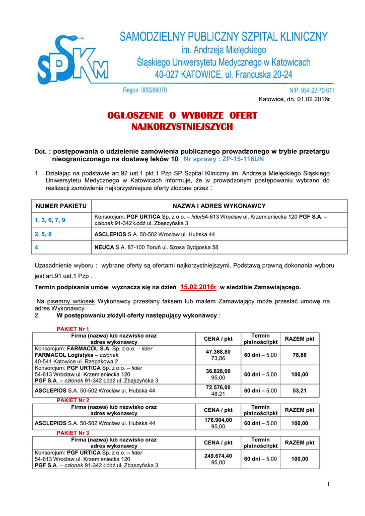 Katowice, dn. 01.02.2016r OGŁOSZENIE O WYBORZE OFERT NAJKORZYSTNIEJSZYCH Dot. : postępowania o udzielenie zamówienia publicznego prowadzonego w trybie przetargu nieograniczonego na dostawę leków 10 Nr sprawy : ZP-15-116UN 1. Działając na podstawie art.92 ust.1 pkt.1 Pzp SP Szpital Kliniczny im. Andrzeja Mielęckiego Śląskiego Uniwersytetu Medycznego w Katowicach informuje, że w prowadzonym postępowaniu wybrano do realizacji zamówienia najkorzystniejsze oferty złożone przez : NUMER PAKIETU NAZWA I ADRES WYKONAWCY 1, 3, 6, 7, 9 Konsorcjum: PGF URTICA Sp. z o.o. – lider54-613 Wrocław ul. Krzemieniecka 120 PGF S.A. – członek 91-342 Łódź ul. Zbąszyńska 3 2, 5, 8 ASCLEPIOS S.A. 50-502 Wrocław ul. Hubska 44 4 NEUCA S.A. 87-100 Toruń ul. Szosa Bydgoska 58 Uzasadnienie wyboru : wybrane oferty są ofertami najkorzystniejszymi. Podstawą prawną dokonania wyboru jest art.91 ust.1 Pzp . Termin podpisania umów wyznacza się na dzień 15.02.2016r w siedzibie Zamawiającego. Na pisemny wniosek Wykonawcy przesłany faksem lub mailem Zamawiający może przesłać umowę na adres Wykonawcy. 2. W postępowaniu złożyli oferty następujący wykonawcy : PAKIET Nr 1 Firma (nazwa) lub nazwisko oraz adres wykonawcy Konsorcjum: FARMACOL S.A. Sp. z o.o. – lider FARMACOL Logistyka – członek 40-541 Katowice ul. Rzepakowa 2 Konsorcjum: PGF URTICA Sp. z o.o. – lider 54-613 Wrocław ul. Krzemieniecka 120 PGF S.A. – członek 91-342 Łódź ul. Zbąszyńska 3 ASCLEPIOS S.A. 50-502 Wrocław ul. Hubska 44 PAKIET Nr 2 Firma (nazwa) lub nazwisko oraz adres wykonawcy ASCLEPIOS S.A. 50-502 Wrocław ul. Hubska 44 PAKIET Nr 3 Firma (nazwa) lub nazwisko oraz adres wykonawcy Konsorcjum: PGF URTICA Sp. z o.o. – lider 54-613 Wrocław ul. Krzemieniecka 120 PGF S.A. – członek 91-342 Łódź ul. Zbąszyńska 3 CENA / pkt Termin płatności/pkt RAZEM pkt 47.368,80 73,86 60 dni – 5,00 78,86 36.828,00 95,00 60 dni – 5,00 100,00 72.576,00 48,21 60 dni – 5,00 53,21 CENA / pkt Termin płatności/pkt RAZEM pkt 176.904,00 95,00 60 dni – 5,00 100,00 CENA / pkt Termin płatności/pkt RAZEM pkt 249.674,40 95,00 60 dni – 5,00 100,00 1 PAKIET Nr 4 Firma (nazwa) lub nazwisko oraz adres wykonawcy Konsorcjum: FARMACOL S.A. Sp. z o.o. – lider i FARMACOL Logistyka – członek 40-541 Katowice ul. Rzepakowa 2 SALUS International Sp. z o.o. 40-273 Katowice ul. Pułaskiego 9 NEUCA S.A. 87-100 Toruń ul. Szosa Bydgoska 58 Konsorcjum: PGF URTICA Sp. z o.o. – lider 54-613 Wrocław ul. Krzemieniecka 120 PGF S.A. – członek 91-342 Łódź ul. Zbąszyńska 3 PAKIET Nr 5 Firma (nazwa) lub nazwisko oraz adres wykonawcy ASCLEPIOS S.A. 50-502 Wrocław ul. Hubska 44 PAKIET Nr 6 Firma (nazwa) lub nazwisko oraz adres wykonawcy Konsorcjum: FARMACOL S.A. Sp. z o.o. – lider FARMACOL Logistyka – członek 40-541 Katowice ul. Rzepakowa 2 Konsorcjum: PGF URTICA Sp. z o.o. – lider 54-613 Wrocław ul. Krzemieniecka 120 PGF S.A. – członek 91-342 Łódź ul. Zbąszyńska 3 ASCLEPIOS S.A. 50-502 Wrocław ul. Hubska 44 PAKIET Nr 7 Firma (nazwa) lub nazwisko oraz adres wykonawcy Konsorcjum: PGF URTICA Sp. z o.o. – lider 54-613 Wrocław ul. Krzemieniecka 120 PGF S.A. – członek 91-342 Łódź ul. Zbąszyńska 3 PAKIET Nr 8 Firma (nazwa) lub nazwisko oraz adres wykonawcy SALUS International Sp. z o.o. 40-273 Katowice ul. Pułaskiego 9 Konsorcjum: PGF URTICA Sp. z o.o. – lider 54-613 Wrocław ul. Krzemieniecka 120 PGF S.A. – członek 91-342 Łódź ul. Zbąszyńska 3 ASCLEPIOS S.A. 50-502 Wrocław ul. Hubska 44 PAKIET Nr 9 Firma (nazwa) lub nazwisko oraz adres wykonawcy Konsorcjum: FARMACOL S.A. Sp. z o.o. – lider FARMACOL Logistyka – członek 40-541 Katowice ul. Rzepakowa 2 FRESENIUS Kabi Polska sp. z o.o. 02-305 Warszawa Al.Jerozolimskie 134 SALUS International Sp. z o.o. 40-273 Katowice ul. Pułaskiego 9 NEUCA S.A. 87-100 Toruń ul. Szosa Bydgoska 58 Konsorcjum: PGF URTICA Sp. z o.o. – lider 54-613 Wrocław ul. Krzemieniecka 120 PGF S.A. – członek 91-342 Łódź ul. Zbąszyńska 3 Termin płatności/pkt RAZEM pkt 161.963,71 92,52 161.222,40 92,95 157.741,34 95,00 60 dni – 5,00 97,52 60 dni – 5,00 97,95 60 dni – 5,00 100,00 161.676,00 92,69 60 dni – 5,00 97,69 CENA / pkt Termin płatności/pkt RAZEM pkt 64.638,00 95,00 60 dni- 5,00 100,00 CENA / pkt Termin płatności/pkt RAZEM pkt 493.516,80 93,55 60 dni – 5,00 98,55 486.000,00 95,00 60 dni – 5,00 100,00 549.989,57 83.98 60 dni – 5,00 88,98 CENA / pkt Termin płatności/pkt RAZEM pkt 874.735,20 95,00 60 dni – 5,00 100,00 CENA / pkt Termin płatności/pkt RAZEM pkt 105.640,20 77,70 60 dni – 5,00 82,70 88.128,00 93,14 60 dni – 5,00 98,14 86,400,00 95,00 60 dni – 5,00 100,00 CENA / pkt Termin płatności/pkt RAZEM pkt 39.128,40 93,40 60 dni – 5,00 98,40 47.973,60 73,68 40.824,00 86,58 39.085,20 90,43 60 dni – 5,00 78,68 60 dni – 5,00 91,58 60 dni – 5,00 95,43 37.206,00 95,00 60 dni – 5,00 100,00 CENA / pkt 3. Działając na podstawie art.92 ust.1 pkt.2 Pzp Zamawiający informuje, że w prowadzonym postępowaniu nie została odrzucona żadna oferta 4. Działając na podstawie art.92 ust.1 pkt.2 Pzp Zamawiający informuje, że w prowadzonym postępowaniu nie został wykluczony żaden wykonawca. 5. Środki ochrony prawnej : Od decyzji niniejszej przysługują wykonawcy środki ochrony prawnej określone w ustawie Prawo zamówień publicznych – dział VI „ Środki ochrony prawnej”. 2 UWAGA: Wybrany Wykonawca przed podpisaniem umowy zobowiązany jest do wniesienia ZABEZPIECZENIA NALEŻYTEGO WYKONANIA UMOWY w wysokości 5% ceny całkowitej brutto podanej w ofercie. Zabezpieczenie w formie pieniężnej należy przelać na konto nr 30 1130 1091 0003 9110 0620 0003 z adnotacją „ zabezpieczenie LEKI 10 ZP-15-116UN”. Potwierdzenie wpłacenia zabezpieczenia w gotówce należy przesłać faksem na numer: 32/259-16-71 lub mailem na adres [email protected] przed wyznaczonym terminem podpisania umowy. Oryginał potwierdzenie