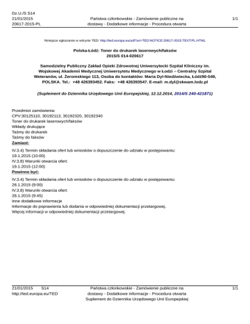 Dz.U./S S14 21/01/2015 20617-2015-PL Państwa członkowskie - Zamówienie publiczne na dostawy - Dodatkowe informacje - Procedura otwarta 1/1 Niniejsze ogłoszenie w witrynie TED: http://ted.europa.eu/udl?uri=TED:NOTICE:20617-2015:TEXT:PL:HTML Polska-Łódź: Toner do drukarek laserowych/faksów 2015/S 014-020617 Samodzielny Publiczny Zakład Opieki Zdrowotnej Uniwersytecki Szpital Kliniczny im. Wojskowej Akademii Medycznej Uniwersytetu Medycznego w Łodzi – Centralny Szpital Weteranów, ul. Żeromskiego 113, Osoba do kontaktów: Maria Dyl-Niedźwiecka, Łódź90-549, POLSKA. Tel.: +48 426393452. Faks: +48 426393547. E-mail: [email protected] (Suplement do Dziennika Urzędowego Unii Europejskiej, 12.12.2014, 2014/S 240-421871) Przedmiot zamówienia: CPV:30125110, 30192113, 30192320, 30192340 Toner do drukarek laserowych/faksów Wkłady drukujące Taśmy do drukarek Taśmy do faksów Zamiast: IV.3.4) Termin składania ofert lub wniosków o dopuszczenie do udziału w postępowaniu: 19.1.2015 (10:00) IV.3.8) Warunki otwarcia ofert: 19.1.2015 (12:00) Powinno być: IV.3.4) Termin składania ofert lub wniosków o dopuszczenie do udziału w postępowaniu: 28.1.2015 (9:00) IV.3.8) Warunki otwarcia ofert: 28.1.2015 (9:45) Inne dodatkowe informacje Informacje do poprawienia lub dodania w odpowiedniej dokumentacji przetargowej. Więcej informacji w odpowiedniej dokumentacji przetargowej. 21/01/2015 S14 http://ted.europa.eu/TED Państwa członkowskie - Zamówienie publiczne na dostawy - Dodatkowe informacje - Procedura otwarta Suplement do Dziennika Urzędowego Unii Europejskiej 1/1