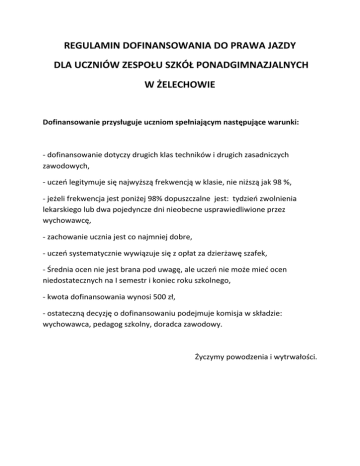 REGULAMIN DOFINANSOWANIA DO PRAWA JAZDY DLA UCZNIÓW ZESPOŁU SZKÓŁ PONADGIMNAZJALNYCH W ŻELECHOWIE Dofinansowanie przysługuje uczniom spełniającym następujące warunki: - dofinansowanie dotyczy drugich klas techników i drugich zasadniczych zawodowych, - uczeń legitymuje się najwyższą frekwencją w klasie, nie niższą jak 98 %, - jeżeli frekwencja jest poniżej 98% dopuszczalne jest: tydzień zwolnienia lekarskiego lub dwa pojedyncze dni nieobecne usprawiedliwione przez wychowawcę, - zachowanie ucznia jest co najmniej dobre, - uczeń systematycznie wywiązuje się z opłat za dzierżawę szafek, - Średnia ocen nie jest brana pod uwagę, ale uczeń nie może mieć ocen niedostatecznych na I semestr i koniec roku szkolnego, - kwota dofinansowania wynosi 500 zł, - ostateczną decyzję o dofinansowaniu podejmuje komisja w składzie: wychowawca, pedagog szkolny, doradca zawodowy. Życzymy powodzenia i wytrwałości.