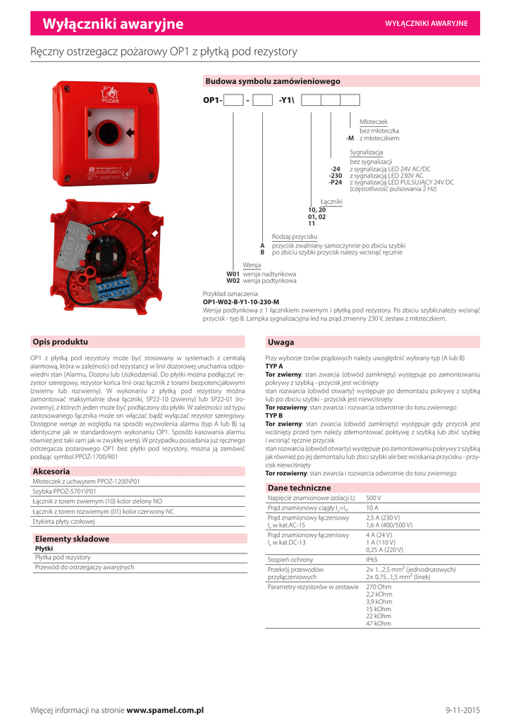Wyłączniki awaryjne WYŁĄCZNIKI AWARYJNE Ręczny ostrzegacz pożarowy OP1 z płytką pod rezystory Budowa symbolu zamówieniowego OP1- - -Y1\ Młoteczek bez młoteczka -M z młoteczkiem -24 -230 -P24 Sygnalizacja bez sygnalizacji z sygnalizacją LED 24V AC/DC z sygnalizacją LED 230V AC z sygnalizacją LED PULSUJĄCY 24V DC (częstotliwość pulsowania 2 Hz) Łączniki 10, 20 01, 02 11 A B Rodzaj przycisku przycisk zwalniany samoczynnie po zbiciu szybki po zbiciu szybki przycisk należy wcisnąć ręcznie Wersja W01 wersja nadtynkowa W02 wersja podtynkowa Przykład oznaczenia OP1-W02-B-Y1-10-230-M Wersja podtynkowa z 1 łącznikiem zwiernym i płytką pod rezystory. Po zbiciu szybki,należy wcisnąć przycisk - typ B. Lampka sygnalizacyjna led na prąd zmienny 230 V, zestaw z młoteczkiem. Opis produktu OP1 z płytką pod rezystory może być stosowany w systemach z centralą alarmową, która w zależności od rezystancji w linii dozorowej uruchamia odpowiedni stan (Alarmu, Dozoru lub Uszkodzenia). Do płytki można podłączyć rezystor szeregowy, rezystor końca linii oraz łącznik z torami bezpotencjałowymi (zwierny lub rozwierny). W wykonaniu z płytką pod rezystory można zamontować maksymalnie dwa łączniki, SP22-10 (zwierny) lub SP22-01 (rozwierny), z których jeden może być podłączony do płytki. W zależności od typu zastosowanego łącznika może on włączać bądź wyłączać rezystor szeregowy. Dostępne wersje ze względu na sposób wyzwolenia alarmu (typ A lub B) są identyczne jak w standardowym wykonaniu OP1. Sposób kasowania alarmu również jest taki sam jak w zwykłej wersji. W przypadku posiadania już ręcznego ostrzegacza pożarowego OP1 bez płytki pod rezystory, można ją zamówić podając symbol PPOŻ-1700/R01 Akcesoria Młoteczek z uchwytem PPOŻ-1200\P01 Szybka PPOŻ-5701\P01 Łącznik z torem zwiernym (10) kolor zielony NO Łącznik z torem rozwiernym (01) kolor czerwony NC Etykieta płyty czołowej Elementy składowe Płytki Płytka pod rezystory Przewód do ostrzegaczy awaryjnych Więcej informacji na stronie www.spamel.com.pl Uwaga Przy wyborze torów prądowych należy uwzględnić wybrany typ (A lub B) TYP A Tor zwierny: stan zwarcia (obwód zamknięty) występuje po zamontowaniu pokrywy z szybką - przycisk jest wciśnięty stan rozwarcia (obwód otwarty) występuje po demontażu pokrywy z szybką lub po zbiciu szybki - przycisk jest niewciśnięty Tor rozwierny: stan zwarcia i rozwarcia odwrotnie do toru zwiernego TYP B Tor zwierny: stan zwarcia (obwód zamknięty) występuje gdy przycisk jest wciśnięty przed tym należy zdemontować poktywę z szybką lub zbić szybkę i wcisnąć ręcznie przycisk stan rozwarcia (obwód otwarty) występuje po zamontowaniu pokrywy z szybką jak również po jej demontażu lub zbici szybki ale bez wciskania przycisku - przycisk niewciśnięty Tor rozwierny: stan zwarcia i rozwarcia odwrotnie do toru zwiernego Dane techniczne Napięcie znamionowe izolacji Ui Prąd znamionowy ciągły Iu=Ith Prąd znamionowy łączeniowy Ie w kat.AC-15 Prąd znamionowy łączeniowy Ie w kat.DC-13 Stopień ochrony Przekrój przewodów przyłączeniowych Parametry rezystorów w zestawie 500 V 10 A 2,5 A (230 V) 1,6 A (400/500 V) 4 A (24 V) 1 A (110 V) 0,25 A (220 V) IP65 2× 1...2,5 mm² (jednodrutowych) 2× 0,75...1,5 mm² (linek) 270 Ohm 2,2 kOhm 3,9 kOhm 15 kOhm 22 kOhm 47 kOhm 9-11-2015 Wyłączniki awaryjne WYŁĄCZNIKI AWARYJNE Wymiary wersja nadtynkowa wersja podtynkowa 113 35 59 Więcej informacji na stronie www.spamel.com.pl 9-11-2015