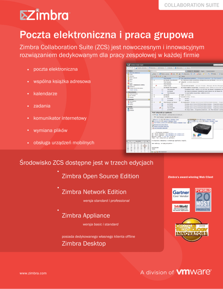 Poczta elektroniczna i praca grupowa Zimbra Collaboration Suite (ZCS) jest nowoczesnym i innowacyjnym rozwiązaniem dedykowanym dla pracy zespołowej w każdej firmie poczta elektroniczna wspólna książka adresowa kalendarze zadania komunikator internetowy wymiana plików obsługa urządzeń mobilnych Środowisko ZCS dostępne jest w trzech edycjach Zimbra Open Source Edition Zimbra Network Edition wersja standard i professional Zimbra Appliance wersja basic i standard posiada dedykowanego własnego klienta offline Zimbra Desktop PAKIET WSPÓŁPRACY Zimbra Collaboration Suite (ZCS) ZCS jest kompletną opensource’ową platformą poczty i pracy grupowej. Zarządza serwerami: poczty, kontaktów, kalendarza, zadań, dokumentów, wymianą plików, serwisami społecznościowymi, komunikatorami internetowymi oraz synchronizacją do różnych typów klientów i urządzeń mobilnych. Klient WWW: Bogaty, oparty na AJAX panel użytkownika z funkcjami przeciągnij, upuść, tagowaniem i widokiem konwersacji, identycznymi jak w aplikacjach Wszechstronne przeszukiwanie, także w treści załączników i poprzez zapisane foldery wyszukania Współpraca i wymiana informacji ze skrzynek pocztowych, list kontaktów, kalendarzy dokumentów, plików oraz zadań do wykonania ZIMBRA DESKTOP: Aplikacja umożliwia dostęp offline dla użytkowników Windows, Mac, Linux Współne zarządzanie kontami Gmail, AOL, Hotmail Yaho! Mail i innych kont POP/IMAP Synchronizacja Kontaktów i Kalendarzy Gmail i Yahoo! INNE PROGRAMY POCZTOWE: Synchronizacja MAPI z Outlook 2003/2010 z pełną delegacją uprawnień i dostępem offline Współne firmowe kalendarze z wymianą harmonogramów wolny/zajęty, w pełnej współpracy z Microsoft Exchange Natywna synchronizacja z aplikacjami Apple przez Zimbra iSync Connector oraz wsparcie dla CalDav Tworzenie współnych dokumentów wiki i zarządzanie plikami z pojedynczej aktówki (repozytoriów plików) Obsługa wszystkich klinetów POP3/IMAP4 Integracja z usługami firm trzecich - zimlety i dodatki aplikacji Twitter i Facebook ADMINISTRACJA: Zarządzanie serwerem z pełnej linii komend i opartej na AJAX Konsoli Administracyjnej Kreatory migracji z Exchange, Domino, Groupwise, oraz standardowa migracja MAPI Backup i odzyskiwanie danych w czasie rzeczywistym; natywne hierarchiczne zarządzanie powierzchnią (HSM) oraz wsparcie wysokiej dostępności (HA) / klastrowanie Wszechstronne przeszukiwanie między skrzynkami i odzyskiwanie kopii, nawet dla pojedynczego konta ZIMBRA MOBILE: Natywna synchronizacja z urządzeniami BlackBerry przez BlackBerry Connector (BES) Natywna synchronizacja “over-the-air” z urządzeniami iPhone, Windows Mobile, Palm i Smartphone Symbian Ustawienia polityk bezpieczeństwa dla urządzeń z uwzględnieniem kasowania danych w razie utraty urządzenia, wiadomości PIN i funkcji zarządzania dla kont użytkownika Bogaty, oparty na przeglądarce interfejs dla wiadomości e-mail, kontaktów, kalendarza i plików na wszytskich przeglądarkach xHTML WSPARCIE DLA WIELU URZĄDZEŃ I PLATFORM Zintegrowany silnik Anty-Spam, Anty-Virus oraz Usługa Katalogowa (LDAP, Active Directory) Otwarte usługi sieciowe, interfejsy API/REST ADMINISTRACJA WIELODOMENOWA I HOSTING: Pełne wsparcie dla nieograniczonej liczby klientów i delegowanie uprawnień administracyjnych m.in. dla dostawców usług internetowych Administracja oparta na rolach do tworzenia domen i ograniczonego dostępu dla administratorów w zależności od typu konta Kompletna identyfikacja graficzna oraz zarządzanie banerami wyświetlanymi przez klienta WWW Zarządzanie jakością usługi, wielkością powierzchni i polityką storage przez Class-of-Service (CoS) ul. Piękna 28/1, 60-591 Poznań tel/fax: (61) 822 11 87 http://www.intalio.pl [email protected] klient webowy , Symbian i inne