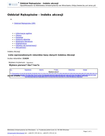 Oddział Rękopisów - Indeks akcesji Opublikowane na Biblioteka Uniwersytecka we Wrocławiu (http://www.bu.uni.wroc.pl) Oddział Rękopisów - Indeks akcesji in Oddział Rękopisów (OR) » » » » » » » » Informacje ogólne Zbiory Katalogi Historia zbiorów Wybrana literatura Digitalizacja Obiekty do konserwacji Aktualności Indeks Akcesji Lista wprowadzonych rekordów bazy danych Indeksu Akcesji liczba rekordów: 21629 Wybierz kryterium: Wybierz Lp. Sygnatura Has?o pierwsz?Opis liter? has?a Uwagi Sygnatura Has?o ? Opis Odsy?acz Uwagi Wybierz stron? << Poprzednia [1] [2] [3] [4] [5] [6] [7] [8] [9] [10] [11] [12] [13] [14] [15] [16] [17] [18] [19] [20] [21] [22] [23] [24] [25] [26] [27] [28] [29] [30] [31] [32] [33] [34] [35] [36] [37] [38] [39] [40] [41] [42] [43] [44] [45] [46] [47] [48] [49] [50] [51] [52] [53] [54] [55] [56] [57] [58] [59] [60] [61] [62] Adres źródła: http://www.bu.uni.wroc.pl/oddzialy/piasek/oddzial-rekopisow-indeks-akcesji [63] [64] [65] [66] [67] [68] [69] [70] [71] [72] [73] [74] [75] [76] [77] [78] [79] [80] [81] [82] [83] Biblioteka Uniwersytecka we Wrocławiu - ul. Fryderyka Joliot-Curie 12, 50-383 Wrocław Uniwersytet Wrocławski tel.: +48 071 375 20 11, +48 071 375 22 15 Page 1 of 1