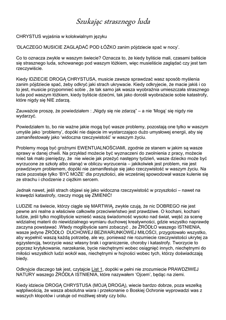Szukając strasznego luda CHRYSTUS wyjaśnia w kolokwialnym języku ‘DLACZEGO MUSICIE ZAGLĄDAĆ POD ŁÓŻKO zanim pójdziecie spać w nocy’. Co to oznacza zwykle w waszym świecie? Oznacza to, że kiedy byliście mali, czasami baliście się strasznego luda, schowanego pod waszym łóżkiem, więc musieliście zaglądać czy jest tam rzeczywiście. Kiedy IDZIECIE DROGĄ CHRYSTUSA, musicie zawsze sprawdzać wasz sposób myślenia zanim pójdziecie spać, żeby odkryć jaki strach ukrywacie. Kiedy odkryjecie, że macie jakiś i co to jest, musicie przypomnieć sobie , że tak samo jak wasza wyobraźnia umieszczała strasznego luda pod waszym łóżkiem, kiedy byliście dziećmi, tak jako dorośli wyobrażacie sobie katastrofy, które nigdy się NIE zdarzą. Zauważcie proszę, że powiedziałem : „Nigdy się nie zdarzą” – a nie ‘Mogą’ się nigdy nie wydarzyć. Powiedziałem to, bo nie ważne jakie mogą być wasze problemy, pozostają one tylko w waszym umyśle jako ‘problemy’, dopóki nie dajecie im wystarczająco dużo umysłowej energii, aby się zamanifestowały jako ‘widoczna rzeczywistość’ w waszym życiu. Problemy mogą być groźnymi EWENTUALNOŚCIAMI, zgodnie ze stanem w jakim są wasze sprawy w danej chwili. Na przykład możecie być wyznaczeni do zwolnienia z pracy, możecie mieć tak mało pieniędzy, że nie wiecie jak przeżyć następny tydzień, wasze dziecko może być wyrzucone ze szkoły albo stanąć w obliczu wyrzucenia – jakikolwiek jest problem, nie jest prawdziwym problemem, dopóki nie zamanifestuje się jako rzeczywistość w waszym życiu. Na razie pozostaje tylko ‘BYĆ MOŻE’ dla przyszłości, ale wcześniej spowodował wasze kulenie się ze strachu i chodzenie z ciężkim sercem. Jednak nawet, jeśli strach objawi się jako widoczna rzeczywistość w przyszłości – nawet na krawędzi katastrofy, rzeczy mogą się ZMIENIĆ! LUDZIE na świecie, którzy ciągle się MARTWIĄ, zwykle czują, że nic DOBREGO nie jest pewne ani realne a właściwie całkowite przeciwieństwo jest prawdziwe. O kochani, kochani ludzie, jeśli tylko moglibyście wznieść waszą świadomość wysoko nad świat, wejść za scenę widzialnej materii do niewidzialnego wymiaru duchowej kreatywności, gdzie wszystko naprawdę zaczyna powstawać .Wtedy moglibyście sami zobaczyć , że ŹRÓDŁO waszego ISTNIENIA, wasze jedyne ŹRÓDŁO DUCHOWEJ BEZWARUNKOWEJ MIŁOŚCI, przygotowało wszystko, aby wypełnić waszą każdą potrzebę, ale wy, ponieważ nie rozumiecie rzeczywistości ukrytej za egzystencją, tworzycie wasz własny brak i ograniczenie, choroby i katastrofy. Tworzycie to poprzez krytykowanie, narzekanie, bycie niechętnymi wobec osiągnięć innych, niechętnymi do miłości wszystkich ludzi wokół was, niechętnymi w hojności wobec tych, którzy doświadczają biedy. Odkryjcie dlaczego tak jest, czytajcie List 1, dopóki w pełni nie zrozumiecie PRAWDZIWEJ NATURY waszego ŹRÓDŁA ISTNIENIA, które nazywałem ‘Ojcem’, będąc na ziemi. Kiedy idziecie DROGĄ CHRYSTUSA (MOJĄ DROGĄ), wiecie bardzo dobrze, poza wszelką wątpliwością, że wasza absolutna wiara i przekonanie o Boskiej Ochronie wyprowadzi was z waszych kłopotów i uratuje od możliwej straty czy bólu. Żeby odkryć dlaczego ludzie, którzy naprawdę IDĄ DROGĄ CHRYSTUSA mogą posiadać taką wiarę i przekonanie, czytajcie Listy 5 i 6, dopóki nie zdacie sobie w pełni sprawy, że rzeczy, które widzicie, czujecie i dotykacie są w rzeczywistości tylko IMPULSAMI, uczynionymi widzialnymi poprzez działanie elektromagnetyzmu. Kiedy IDZIECIE DROGĄ CHRYSTUSA, wiecie również, tak jak ja wiedziałem, kiedy byłem na ziemi, że są rzeczy, przez które musicie przejść – ponieważ są naturalną konsekwencją czegoś, co robiliście w przeszłości. To jest rezultat czegoś, co robiliście – wraca teraz jako konieczna lekcja, która przynosi wam duchowy wzrost N z którego przychodzą duchowe błogosławieństwa. ALE N kiedy naprawdę idziecie drogą Chrystusa – akceptujecie lekcję bez oporu czy urazy, ponieważ PODOBNIE DO CHRYSTUSA, wy także WIECIE N że dostaniecie siłę i wewnętrzną wygodę, aby przejść przez lekcję z najmniejszą przykrością. Czytajcie List 3, w którym mówię o moim czasie na ziemi i kilku tygodniach przed moim ukrzyżowaniem. Zobaczycie, że ‘kontrola umysłu,’ w każdej okoliczności jest jedynym sposobem na zmierzenie się z życiem i pokonanie jego przeszkód.