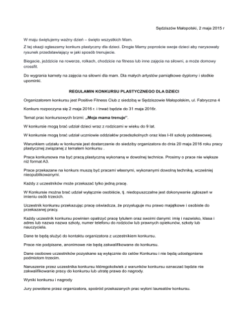 Sędziszów Małopolski, 2 maja 2015 r W maju świętujemy ważny dzień – święto wszystkich Mam. Z tej okazji ogłaszamy konkurs plastyczny dla dzieci. Drogie Mamy poproście swoje dzieci aby narysowały rysunek przedstawiający w jaki sposób trenujecie. Biegacie, jeździcie na rowerze, rolkach, chodzicie na fitness lub inne zajęcia na siłowni, a może domowy crossfit. Do wygrania karnety na zajęcia na siłowni dla mam. Dla małych artystów pamiątkowe dyplomy i słodkie upominki. REGULAMIN KONKURSU PLASTYCZNEGO DLA DZIECI Organizatorem konkursu jest Positive Fitness Club z siedzibą w Sędziszowie Małopolskim, ul. Fabryczna 4 Konkurs rozpoczyna się 2 maja 2016 r. i trwać będzie do 31 maja 2016r. Temat prac konkursowych brzmi: „Moja mama trenuje”. W konkursie mogą brać udział dzieci wraz z rodzicami w wieku do 9 lat. W konkursie mogą brać udział uczniowie oddziałów przedszkolnych oraz klas I-III szkoły podstawowej. Warunkiem udziału w konkursie jest dostarczenie do siedziby organizatora do dnia 20 maja 2016 roku pracy plastycznej związanej z tematem konkursu . Praca konkursowa ma być pracą plastyczną wykonaną w dowolnej technice. Prosimy o prace nie większe niż format A3. Prace przekazane na konkurs muszą być pracami własnymi, wykonanymi dowolną techniką, wcześniej nieopublikowanymi. Każdy z uczestników może przekazać tylko jedną pracę. W Konkursie można brać udział wyłącznie osobiście, tj. niedopuszczalne jest dokonywanie zgłoszeń w imieniu osób trzecich. Uczestnik konkursu przekazując pracę oświadcza, że przysługuje mu prawo majątkowe i osobiste do przekazanej pracy. Każdy uczestnik konkursu powinien opatrzyć pracę tytułem oraz swoimi danymi: imię i nazwisko, klasa i adres lub nazwa nazwa szkoły, numer telefonu do rodziców lub prawnych opiekunów, szkoły lub nauczyciela. Dane te będą służyć do kontaktu organizatora z uczestnikiem konkursu. Prace nie podpisane, anonimowe nie będą zakwalifikowane do konkursu. Dane osobowe uczestników pozyskane są wyłącznie do celów Konkursu i nie będą udostępniane podmiotom trzecim. Naruszenie przez uczestnika konkursu któregokolwiek z warunków konkursu oznaczać będzie nie zakwalifikowanie pracy do konkursu lub utratę prawa do nagrody. Wyniki konkursu i nagrody Jury powołane przez organizatora, spośród przekazanych prac wyłoni laureatów konkursu. Kryteria oceny prac: zgodność z tematyką, estetyka pracy i oryginalność. Ogłoszenie wyników konkursu nastąpi poprzez ogłoszenie na profilu facebook-owym klubu. Laureaci zostaną powiadomieni telefonicznie Planowany termin wręczenia nagród 24 maja 2016 r. Lista nagród 1. karnet na 10 zabiegów Body Shape 2. karnet na 10 zabiegów Roll Shape 3. karnet na 10 zabiegów Vibra Shape 4. karnet na siłownię. 5. karnet na 10 zajęć zajęcia grupowe. Autorzy nagrodzonych prac otrzymają dyplomy oraz słodkie upominki. Po 20 maja organizator udostępni prace konkursowe profilu facebookowym klubu. 3 prace, które do 31 maja zdobędą najwięcej polubień otrzymają klubowe gadżety – kubki dla mamy i małego artysty. Jury ma prawo do wytypowania dodatkowych nagród, jak i również prawo do nieprzyznania nagród. Decyzja jury, co do wskazania laureatów konkursu oraz przyznania im nagród jest ostateczna. Nagrody rzeczowe nie podlegają zamianie na inne nagrody rzeczowe, ani na ich równowartość pieniężną. Postanowienia końcowe: Przekazując pracę na konkurs, uczestnik zgadza się na ekspozycję pracy podczas spotkania oraz na opublikowanie fotografii prac na stronach internetowych Klubu. Autorzy zgadzają się na publikowanie zwycięskich prac i fotografii prac na wszelkich polach eksploatacji. Biorąc udział w konkursie, uczestnik akceptuje jego regulamin. Regulamin niniejszego konkursu będzie dostępny na profilu klubu oraz u nauczycieli plastyki/sztuki w uczestniczących w konkursie placówkach. Organizator zastrzega sobie prawo do: A) zmiany postanowień niniejszego regulaminu w przypadku zmian przepisów prawnych lub innych istotnych zdarzeń mających wpływ na organizowanie Konkursu. B) odstąpienia od organizowania konkursu bez podania przyczyny, C) nierozstrzygnięcia konkursu w przypadku zbyt małej ilości przekazanych prac, D) rozstrzygania w kwestiach nieuregulowanych postanowieniami regulaminu.
