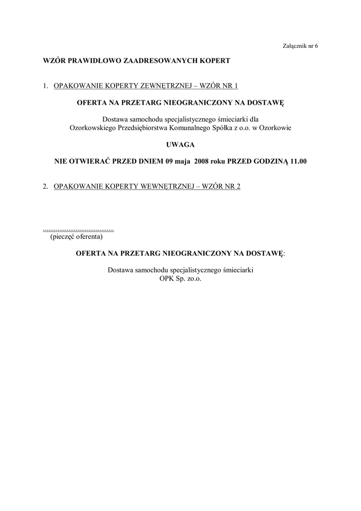 Załącznik nr 6 WZÓR PRAWIDŁOWO ZAADRESOWANYCH KOPERT 1. OPAKOWANIE KOPERTY ZEWNĘTRZNEJ – WZÓR NR 1 OFERTA NA PRZETARG NIEOGRANICZONY NA DOSTAWĘ Dostawa samochodu specjalistycznego śmieciarki dla Ozorkowskiego Przedsiębiorstwa Komunalnego Spółka z o.o. w Ozorkowie UWAGA NIE OTWIERAĆ PRZED DNIEM 09 maja 2008 roku PRZED GODZINĄ 11.00 2. OPAKOWANIE KOPERTY WEWNĘTRZNEJ – WZÓR NR 2 ....................................... (pieczęć oferenta) OFERTA NA PRZETARG NIEOGRANICZONY NA DOSTAWĘ: Dostawa samochodu specjalistycznego śmieciarki OPK Sp. zo.o.