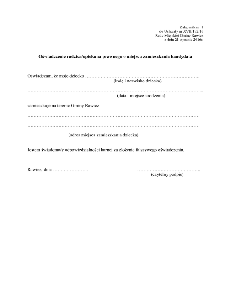 Załącznik nr 1 do Uchwały nr XVII/172/16 Rady Miejskiej Gminy Rawicz z dnia 21 stycznia 2016r. Oświadczenie rodzica/opiekuna prawnego o miejscu zamieszkania kandydata Oświadczam, że moje dziecko ……………………………………………………………….. (imię i nazwisko dziecka) …………………………………………………………………………………………………... (data i miejsce urodzenia) zamieszkuje na terenie Gminy Rawicz ………………………………………………………………………………………………… ………………………………………………………………………………………………… (adres miejsca zamieszkania dziecka) Jestem świadoma/y odpowiedzialności karnej za złożenie fałszywego oświadczenia. Rawicz, dnia ………………….. ………………………………….. (czytelny podpis)