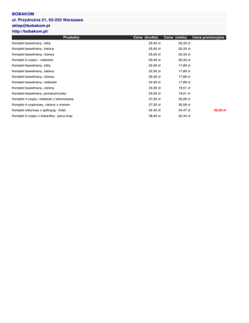 BOBAKOM ul. Przydrożna 21, 03-253 Warszawa [email protected] http://bobakom.pl/ Produkty Cena (brutto) Cena (netto) Komplet bawełniany, żółty 25,00 zł 20,33 zł Komplet bawełniany, zielony 25,00 zł 20,33 zł Komplet bawełniany, różowy 25,00 zł 20,33 zł Komplet 2 części - niebieski 25,00 zł 20,33 zł Komplet bawełniany, żółty 22,00 zł 17,89 zł Komplet bawełniany, zielony 22,00 zł 17,89 zł Komplet bawełniany, różowy 22,00 zł 17,89 zł Komplet bawełniany, niebieski 22,00 zł 17,89 zł Komplet bawełniany, zielony 24,00 zł 19,51 zł Komplet bawełniany, pomarańczowy 24,00 zł 19,51 zł Komplet 4 części, niebieski z lokomotywą 37,00 zł 30,08 zł Komplet 4-częściowy, zielony z misiem 37,00 zł 30,08 zł Komplet welurowy z aplikacją - fiolet 42,40 zł 34,47 zł Komplet 2 części z kokardką - jasny brąz 39,90 zł 32,44 zł Cena promocyjna 38,00 zł