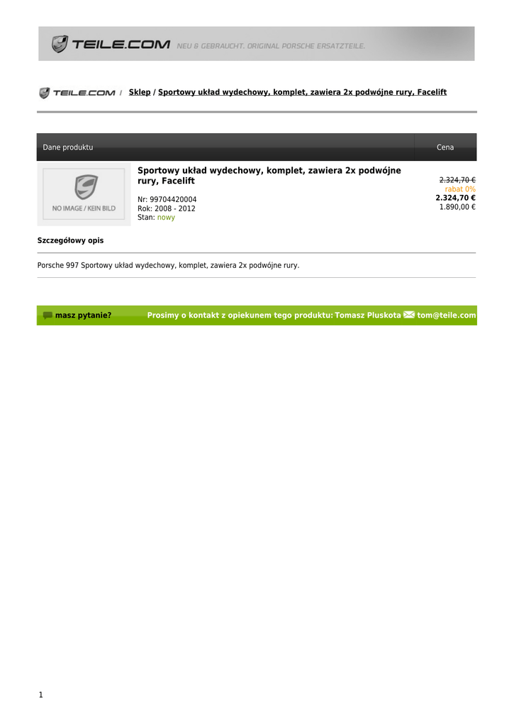 Sklep / Sportowy układ wydechowy, komplet, zawiera 2x podwójne rury, Facelift Dane produktu Cena Sportowy układ wydechowy, komplet, zawiera 2x podwójne rury, Facelift Nr: 99704420004 Rok: 2008 - 2012 Stan: nowy 2.324,70 € rabat 0% 2.324,70 € 1.890,00 € Szczegółowy opis Porsche 997 Sportowy układ wydechowy, komplet, zawiera 2x podwójne rury. masz pytanie? 1 Prosimy o kontakt z opiekunem tego produktu: Tomasz Pluskota [email protected]