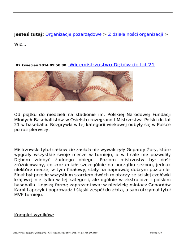 Jesteś tutaj: Organizacje pozarządowe > Z działalności organizacji > Wic... 07 kwiecień 2014 09:50:00 Wicemistrzostwo Dębów do lat 21 Od piątku do niedzieli na stadionie im. Polskiej Narodowej Fundacji Młodych Baseballistów w Osielsku rozegrano I Mistrzostwa Polski do lat 21 w baseballu. Rozgrywki w tej kategorii wiekowej odbyły się w Polsce po raz pierwszy. Mistrzowski tytuł całkowicie zasłużenie wywalczyły Gepardy Żory, które wygrały wszystkie swoje mecze w turnieju, a w finale nie pozwoliły Dębom zdobyć żadnego obiegu. Poziom mistrzostw był dość zróżnicowany, co zrozumiałe szczególnie na początku sezonu, jednak niektóre mecze, w tym finałowy, stały na naprawdę dobrym poziomie. Finał był przede wszystkim starciem dwóch miotaczy ze ścisłej czołówki krajowej nie tylko w tej kategorii, ale ogólnie w ekstralidze i polskim baseballu. Lepszą formę zaprezentował w niedzielę miotacz Gepardów Karol Lapczyk i poprowadził śląski zespół do złota, a sam otrzymał tytuł MVP turnieju. Komplet wyników: http://www.osielsko.pl/blog/12_175-wicemistrzostwo_debow_do_lat_21.html Strona 1/4 Grupa A: Dęby – Centaury 16:7 Yankees – Centaury 25:14 (7. r. przez przewagę 10 pkt.) Dęby – Yankees 22:0 (5. r. przez przewagę 20 pkt.) Kolejność: 1. Dęby Osielsko 2-0 2. Yankees Działdowo 1-1 3. Centaury Warszawa 0-2 Grupa B: Gepardy – Stal BiS 12:10 Stal BiS – KS Baseball 9:3 (5. r. zakończony z powodu zapadających ciemności) Gepardy – KS Baseball 17:2 (6. r. przez przewagę 15 pkt.) Kolejność: 1. Gepardy Żory 2-0 2. Stal Kutno 1-1 3. KSB Wrocław 0-2 Finały o miejsca: Gepardy – Dęby 3:0 (finał o I miejsce) (szczegóły) Stal – Yankees 10:0 (o III miejsce, 5. r. przez przewagę 10 pkt.) KSB – Centaury 18:4 (o V miejsce, 5. r. przez przewagę 15 pkt.) Końcowa kolejność I Mistrzostw Polski do lat 21 w baseballu: 1. 2. 3. 4. 5. 6. Gepardy Żory – mistrz Polski 2014, złoto Dęby Osielsko – wicemistrz Polski 2014, srebro Stal BiS Kutno – II wicemistrz Polski 2014, brąz Yankees Działdowo KS Baseball Wrocław Centaury Warszawa http://www.osielsko.pl/blog/12_175-wicemistrzostwo_debow_do_lat_21.html Strona 2/4 Nagrody indywidualne: MVP turnieju: Karol Lapczyk (Gepardy) – zwycięski miotacz w meczu finałowym, rekordowe 18 strajkautów w finale Najlepszy miotacz turnieju: Radosław Zajda (Dęby) – perfect game w meczu z Yankees Najlepszy pałkarz turnieju: Łukasz Tyman (Gepardy) Dęby Osielsko grały w I MP U-21 w następującym składzie: Paweł Sztejka, Radosław Zajda, Mateusz Gralak – miotacze oraz Marek Bebyn, Daniel Charchuła, Bruno Gajda, Łukasz Kłos, Szymon Listwoń, Juliusz Liwoch, Bartosz Maciejewski, Kacper Murawski, Jakub Niedziałkowski, Jakub Pochwała, Kacper Tyborowski, Jędrzej Walkowiak, Oskar Wąsik, Paweł Zagórski, Mikołaj Zera. W meczu Dęby – Yankees miotacz Dębów Radosław Zajda dokonał niesamowitej rzeczy: narzucił „Perfect Game”, co już samo w sobie jest unikalnym wyczynem, a do tego wszystkim 15 pałkarzom założył strajkauty!!! (mecz został zakończony już po 5 rundach ze względu na określoną regulaminem przewagę 20 pkt.) 5 zmian x 3 pałkarzy = 15 pałkarzy i 15 strajkautów! Poza łapaczem, obrona Dębów była całkowicie… bezrobotna w tym meczu. Yankees to wprawdzie Iligowiec, ale pokonali młodzież mistrza Polski Centaurów Warszawa! (szczegóły). Perfect Game to największy wyczyn indywidualny w baseballu. Oznacza, że żaden pałkarz nie został wpuszczony na bazę w jakikolwiek sposób – ilu pałkarzy, tyle autów. Zajda w dodatku wszystkich pałkarzy wyautował na strajki, co jeszcze podnosi rangę tego wyczynu. Choć trudno porównywać polski baseball z MLB, to jednak dla pewnego wyobrażenia podam, że w sięgającej XIX wieku historii MLB, przy ok. 2500 meczach granych rocznie w 30-zespołowej lidze, zdarzyły się do tej pory 23 (dwadzieścia trzy!) perfect games! http://www.osielsko.pl/blog/12_175-wicemistrzostwo_debow_do_lat_21.html Strona 3/4 Objaśnienia podstawowych skrótów w załącznikach: R – obiegi (pkty) ER – obiegi z winy miotacza RBI lub BI – asysty punktowe H – hity (wybicia) BB – bazy darmo SO lub K – strajkauty P - A - E – outy-asysty-błędy w obronie Umpires – sędziowie T – czas gry /J.Kaźmierczak/ drukuj Wróć http://www.osielsko.pl/blog/12_175-wicemistrzostwo_debow_do_lat_21.html Powered by TCPDF (www.tcpdf.org) Strona 4/4