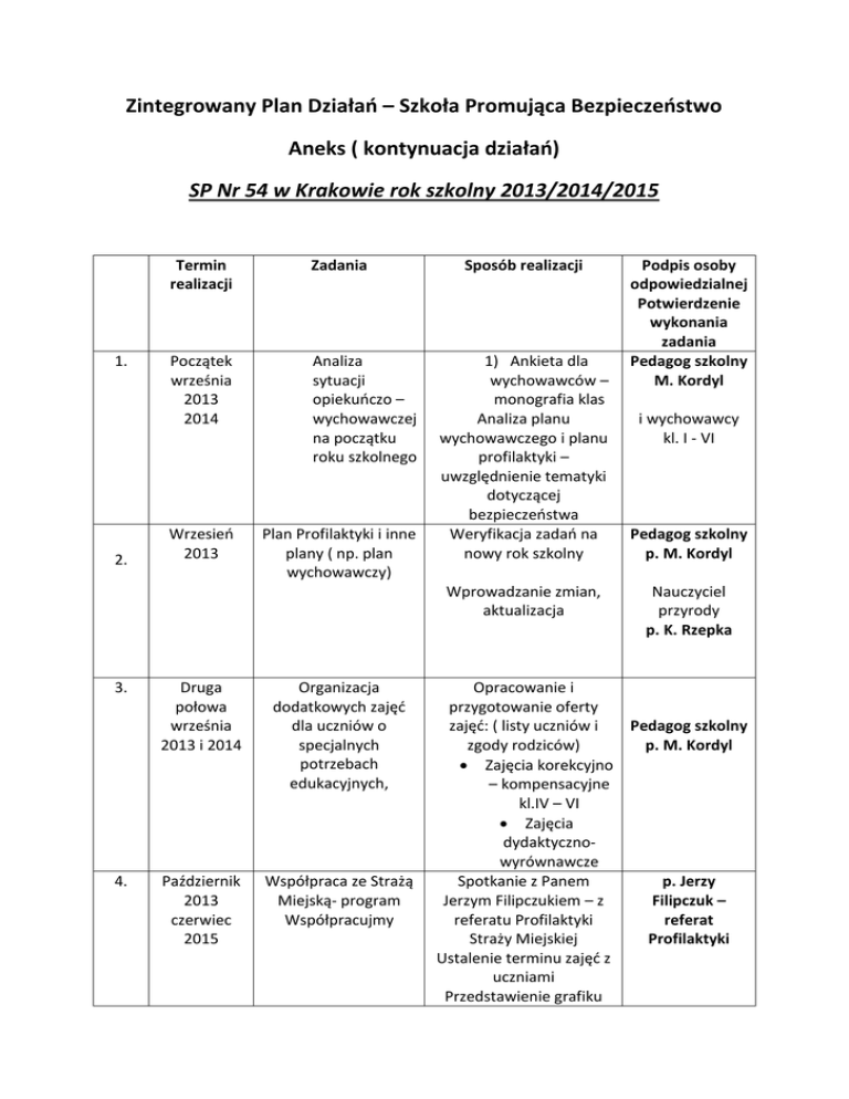 Zintegrowany Plan Działań – Szkoła Promująca Bezpieczeństwo Aneks ( kontynuacja działań) SP Nr 54 w Krakowie rok szkolny 2013/2014/2015 1. 2. Termin realizacji Zadania Początek września 2013 2014 Analiza sytuacji opiekuńczo – wychowawczej na początku roku szkolnego Wrzesień 2013 Plan Profilaktyki i inne plany ( np. plan wychowawczy) Sposób realizacji 1) Ankieta dla wychowawców – monografia klas Analiza planu wychowawczego i planu profilaktyki – uwzględnienie tematyki dotyczącej bezpieczeństwa Weryfikacja zadań na nowy rok szkolny Wprowadzanie zmian, aktualizacja 3. Druga połowa września 2013 i 2014 Organizacja dodatkowych zajęć dla uczniów o specjalnych potrzebach edukacyjnych, 4. Październik 2013 czerwiec 2015 Współpraca ze Strażą Miejską- program Współpracujmy Podpis osoby odpowiedzialnej Potwierdzenie wykonania zadania Pedagog szkolny M. Kordyl i wychowawcy kl. I - VI Pedagog szkolny p. M. Kordyl Nauczyciel przyrody p. K. Rzepka Opracowanie i przygotowanie oferty zajęć: ( listy uczniów i Pedagog szkolny zgody rodziców) p. M. Kordyl Zajęcia korekcyjno – kompensacyjne kl.IV – VI Zajęcia dydaktycznowyrównawcze Spotkanie z Panem p. Jerzy Jerzym Filipczukiem – z Filipczuk – referatu Profilaktyki referat Straży Miejskiej Profilaktyki Ustalenie terminu zajęć z uczniami Przedstawienie grafiku 5. Wrzesień 2013Czerwiec 2014 czerwiec 2015 6. Cały rok szkolny 2013/2015 7. Cały rok szkolny 2013/2014 Współpraca z Radą DzielnicyVIIIorganizacja konkursów, zajęć z zakresu Profilaktyki dla Rodziców i uczniów Współpraca z Klubem Osiedlowym w Kostrzu Udział w programie „Szkoła Współpracy” spotkań nauczycielom Zorganizowanie zajęć dla ucz. kl. I – III na temat bezpiecznej drogi do szkoły przy użyciu zestawu Autochodzik. Zapoznanie z zadaniami Straży Miejskiej Przygotowanie do udziału w konkursie „Prawo i MY” dla ucz. kl. VI Współpraca z Patrolem Szkolnym Udział w konkursie „ Bezpiecznie w szkole, w domu i na ulicy” – czerwiec 2014, czerwiec 2015 Przew. RD VIII Udział w zajęciach profilaktycznych – zajęcia dramowe – teatr profilaktyczny kl. IV - VI P. Małgorzata Kuchnia – kierownik DK Kostrze - szkolenia i warsztaty - spotkania z przedstawicielami Rodziców i uczniów - poprawa bezpieczeństwa i uatrakcyjnienie przerw dla uczniów ( inicjatywy rodziców i uczniów) – Zmniejszenie hałasu na korytarzach i agresji rówieśniczej ( organizacja czasu wolnego) - wyjścia na przerwy na parking – „ kolorowy parking” – rysowanie kolorową kredą, gry w klasy itp. - kącik czytelniczy korytarz Dyrektor Szkoły p. Renata Nowak Pedagog M. Kordyl skarbnik Rady Rodziców p. Monika Karolczuk aktywny przedstawiciel rodziców – p. M. Matysik Przewodnicząca Szkoły – G. Górka Przedstawicielka uczniów M. Kędzierska 8. Rok 2014/2015 Udział w programie konkurs „Baw się i ucz – świetlica przyjazna uczniom” Rok szkolny 2014/2015 Udział w programie – projekcje – Fundacji ad Vocem – „ Pomoc dziecku krzywdzonemu” Cały rok szkolny 2013/2014 Przeciwdziałanie agresji i przemocy w szkole – opracowanie procedur postępowania interwencyjnego 2014/2015 - realizacja zadań – Bezpieczny Internet – kl. I Pedagog – III – Fundacja Dzieci M. Kordyl Niczyje - Zdrowie na talerzu – Nauczyciel zajęcia warsztatowe przyrody p. K. Rzepka - szkolenia, warsztaty Pedagog M. - Przygotowanie Kordyl informacji dla rodziców w formie ulotek i materiałów umieszczanych w zakładce pedagog - certyfikat „ Umiejętność rozpoznawania i reagowania na dramat dziecka krzywdzonego – najskuteczniejszym przeciwdziałaniem przemocy wobec dzieci” Opracowanie podczas zespołów wychowawczych systemu konsekwencji wobec ucznia łamiącego regulamin i stwarzającego problemy wychowawcze Przypominanie i omawianie zagadnień dotyczących bezpieczeństwa Przew. Zespołu kl. I – III p. A. Luty Przew. Zespołu kl. IV – VI D. Jabłońska Pedagog M. Kordyl oraz założeń programu ZPB Procedury interwencyjne Procedura Niebieskiej Karty – udział w zespołach interdyscyplinarnych w MOPS 9. Kwiecień Maj 2014 i 2015 Unikanie zagrożeń 10. rok szkolny 2013/2014/ 2015 Bezpieczeństwo w budynku szkolnym – sale lekcyjne - boisko szkolne Wprowadzenie i przypominanie o obowiązku reagowania na krzywdę dzieci Udział w zespołach interdyscyplinarny ch dotyczących naszych uczniów Zorganizowanie warsztatów dla klas VI i V - zabezpieczenie drobnych dodatków w klasach przy tablicach - zakup nowego sprzętu do klas – ławki z okrągłymi brzegami do sali 7 – klasa VI - zakup gier ( piłkarzy ki, labirynty) na korytarz szkolny - zakup miękkich siedzisk na korytarz i gruszki relaksacyjnej do świetlicy - zebranie funduszy na zabezpieczenie boiska szkolnego – podwyższenie siatki – zakup materiałów – realizacja maj – czerwiec 2015 Pedagog M. Kordyl Koordynator ds. przemocy w rodzinie MOPS p. M. Karcz Przedstawiciele Policji – zespół ds. prewencji p. Dyr. Renata Nowak Zaprojektowanie i wykonanie planszy gry w klasy na korytarz – kwiecień 2015 Koordynator działań ze strony rodziców p. Agnieszka Gębalska Pełnienie aktywnych dyżurów przez nauczycieli i pracowników szkoły w szatni i na korytarzach ( weryfikowanie grafika wg potrzeb) P. Ewa Siejkowska – odpowiedzialna za grafik Skrupulatne weryfikowanie wejść i do budynku szkoły ( domofon, sprawdzanie tożsamości osób) p. Aldona Machno ( sekretarz Szkoły) P. Barbara Giermek ( woźna) 11. Cały rok szkolny 2013/ 2014/2015 Programy zdrowotne 1. Uzależnienia – lekcje wychowawcze – „Znajdź właściwe rozwiązanie” 2. Zdrowe odżywianie 3. Trzymaj formę Nauczyciel przyrody p. K. Rzepka