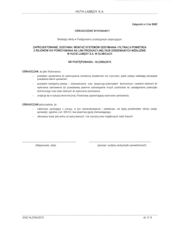 HUTA ŁABĘDY S.A. Załącznik nr 2 do SIWZ OŚWIADCZENIE WYKONAWCY Składając ofertę w Postępowaniu przetargowym obejmującym: ZAPROJEKTOWANIE, DOSTAWA I MONTAŻ SYSTEMÓW ODDYMIANIA I FILTRACJI POWIETRZA Z REJONÓW ICH POWSTAWANIA NA LINII PRODUKCYJNEJ RUR ZGRZEWANYCH WZDŁUŻNIE W HUCIE ŁABĘDY S.A. W GLIWICACH NR POSTĘPOWANIA· HŁJ2/Nlb/2015 OŚWIADCZAM, że jako Wykonawca: posiadam uprawnienia do wykonywania określonej działalności lub czynności, jeżeli ustawy nakładają obowiązek posiadania takich uprawnień; posiadam niezbędną wiedzę i doświadczenie oraz dysponuję potencjałem technicznym i osobami zdolnymi do wykonania zamówienia lub przedstawię pisemne zobowiązanie innych podmiotów do udostępnienia potencjału technicznego oraz osób zdolnych do wykonania zamówienia. znajduję się w sytuacji ekonomicznej i finansowej zapewniającej wykonanie zamówienia; OŚWIADCZAM jednocześnie, że: należności wynikające z umowy, w tym odszkodowawcze i odsetkowe, nie będą przedmiotem obrotu (cesja, sprzedaż), zgodnie z art. 509 KC, bez pisemnej zgody Zamawiającego, oferowany towar jest wolny od wad prawnych i nie narusza praw majątkowych osób trzecich. (Miejscowość, data) SIWZ HU2/Nlb/2015 (pieczęć i podpisy osoby/osób upoważnionych) str. 8/8