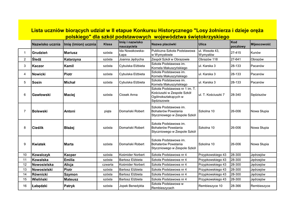 Lista uczniów biorących udział w II etapue Konkursu Historycznego "Losy żołnierza i dzieje oręża polskiego" dla szkół podstawowych województwa świętokrzyskiego Nazwisko ucznia Imię (imion) ucznia Klasa 1 Grudzień Mariusz szósta 2 Śledź Katarzyna szósta Imię i nazwisko nauczyciela Ida NowakowskaŁapa Joanna Jędrycha 3 Kaczor Kamil szósta Cybulska Elżbieta 4 Nowicki Piotr szósta Cybulska Elżbieta 5 Sosin Michał szósta Cybulska Elżbieta 6 Gawłowski Maciej szósta Ciosek Anna 7 Bolewski Antoni piąta Domański Robert 8 Cieślik Błażej szósta 9 Kwiatek Marta 10 15 Kowalczyk Kowalska Nowosielska Nowosielski Równicki Wieliński Kacper Emilia Alicja Piotr Szymon Mateusz 16 Łabędzki Patryk 11 12 13 14 Kod pocztowy Mijescowość 27-415 Kunów 27-641 Obrazów ul. Karska 3 28-133 Pacanów ul. Karska 3 28-133 Pacanów ul. Karska 3 28-133 Pacanów ul. T. Kościuszki 7 28-340 Sędziszów Szkoła Podstawowa im. Szkolna 10 Bohaterów Powstania Styczniowego w Zespole Szkół 26-006 Nowa Słupia Domański Robert Szkoła Podstawowa im. Szkolna 10 Bohaterów Powstania Styczniowego w Zespole Szkół 26-006 Nowa Słupia szósta Domański Robert Szkoła Podstawowa im. Szkolna 10 Bohaterów Powstania Styczniowego w Zespole Szkół 26-006 Nowa Słupia szósta Kośmider Norbert Szkoła Podstawowa nr 4 Przypkowskiego 43 28-300 Jędrzejów szósta Bartosz Elżbieta Szkoła Podstawowa nr 4 Przypkowskiego 43 28-300 Jędrzejów czwarta Kośmider Norbert Szkoła Podstawowa nr 4 Przypkowskiego 43 28-300 Jędrzejów szósta Bartosz Elżbieta Szkoła Podstawowa nr 4 Przypkowskiego 43 28-300 Jędrzejów szósta Bartosz Elżbieta Szkoła Podstawowa nr 4 Przypkowskiego 43 28-300 Jędrzejów szósta Bartosz Elżbieta Przypkowskiego 43 28-300 Jędrzejów szósta Jopek Benedykta Szkoła Podstawowa nr 4 Szkoła Podstawowa w Rembieszycach Rembieszyce 10 28-366 Rembieszyce Nazwa placówki Ulica Publiczna Szkoła Podstawowa w Wymysłowie Zespół Szkół w Obrazowie Szkoła Podstawowa im. Kornela Makuszyńskiego Szkoła Podstawowa im. Kornela Makuszyńskiego Szkoła Podstawowa im. Kornela Makuszyńskiego Szkoła Podstawowa nr 1 im. T. Kościuszki w Zespole Szkół Ogólnokształcących w Sędziszowie ul. Wesoła 43, Wymysłów Obrazów 118 szósta Otoliński Adam 17 Rysiak Jan 18 Ozdoba Kacper 19 Trelińska Gabriela Maria szósta Łukawska Renata 20 Kwiecień Anita szósta Górski Leszek 21 Kopacz Marcin Adam szósta Ewa Góźdź 22 Pindral Maciej piąta Ewa Góźdź 23 BARTOS AMELIA JULIA szósta Jacek Kościński 24 HUDOBSKI MICHAŁ TOMASZ szósta Jacek Kościński piąta Gawłowicz Krystyna Samorządowy Zespół Szkół Nr 1 w Opatowie Zespół Szkół - Publiczna Szkoła Podstawowa im. Papieża Jana Pawła II i Publiczne Gimnazjum w Czajkowie Szkoła Podstawowa im. Stefana Żeromskiego w Chmielniku Szkoła Podstawowa im. Stefana Żeromskiego w Chmielniku filia w Zreczu Dużym Zespół Szkół Samorządowych Szkoła Podstawowa im. Jana Pawła II w Bielinach, Gimnazjum Jana Pawła II w Bielinach Zespół Szkół Samorządowych Szkoła Podstawowa im. Jana Pawła II w Bielinach, Gimnazjum Jana Pawła II w Bielinach Zespół Placówek Oświatowych nr 1 Zespół Placówek Oświatowych nr 1 Ćmielowska 2 27-500 Opatów Czajków Południowy 28 - 200 133 Czajków Południowy Szkolna 7 26-020 Chmielnik Zrecze Duże 22 26-020 Chmielnik Partyzantów 17 26-004 Bieliny Partyzantów 17 26-004 Bieliny Partyzantów 24 29-100 WŁOSZCZOWA Partyzantów 24 29-100 WŁOSZCZOWA