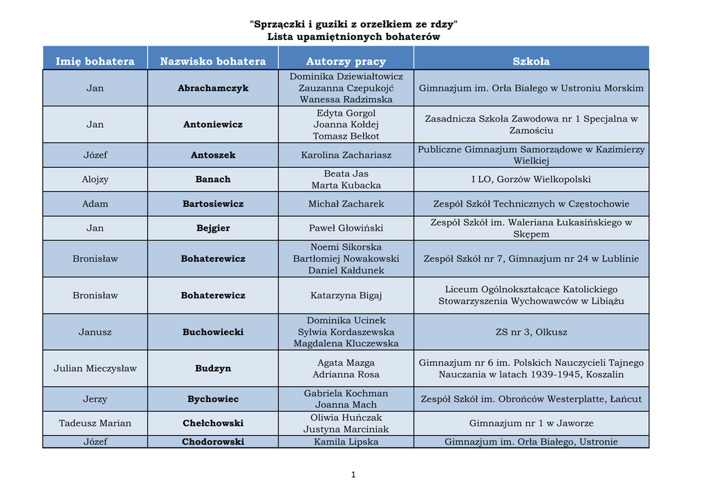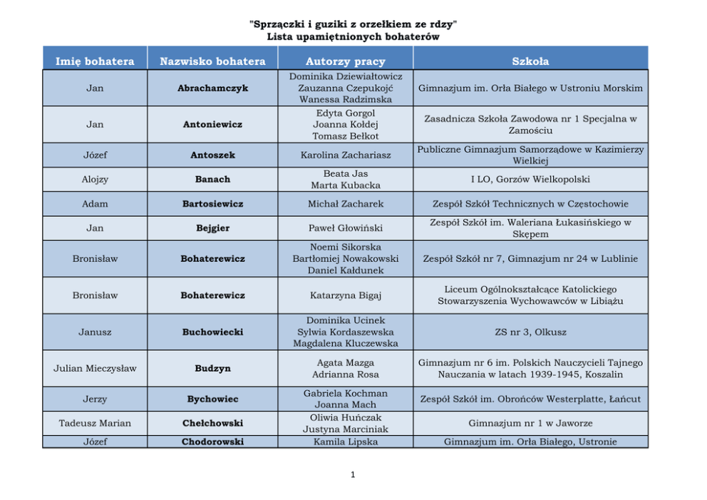 "Sprzączki i guziki z orzełkiem ze rdzy" Lista upamiętnionych bohaterów Imię bohatera Nazwisko bohatera Autorzy pracy Dominika Dziewiałtowicz Zauzanna Czepukojć Wanessa Radzimska Edyta Gorgol Joanna Kołdej Tomasz Bełkot Szkoła Jan Abrachamczyk Jan Antoniewicz Józef Antoszek Karolina Zachariasz Publiczne Gimnazjum Samorządowe w Kazimierzy Wielkiej Alojzy Banach Beata Jas Marta Kubacka I LO, Gorzów Wielkopolski Adam Bartosiewicz Michał Zacharek Zespół Szkół Technicznych w Częstochowie Jan Bejgier Paweł Głowiński Zespół Szkół im. Waleriana Łukasińskiego w Skępem Bronisław Bohaterewicz Noemi Sikorska Bartłomiej Nowakowski Daniel Kałdunek Zespół Szkół nr 7, Gimnazjum nr 24 w Lublinie Bronisław Bohaterewicz Katarzyna Bigaj Liceum Ogólnokształcące Katolickiego Stowarzyszenia Wychowawców w Libiążu Janusz Buchowiecki Dominika Ucinek Sylwia Kordaszewska Magdalena Kluczewska ZS nr 3, Olkusz Julian Mieczysław Budzyn Agata Mazga Adrianna Rosa Gimnazjum nr 6 im. Polskich Nauczycieli Tajnego Nauczania w latach 1939-1945, Koszalin Jerzy Bychowiec Tadeusz Marian Chełchowski Józef Chodorowski Gabriela Kochman Joanna Mach Oliwia Huńczak Justyna Marciniak Kamila Lipska 1 Gimnazjum im. Orła Białego w Ustroniu Morskim Zasadnicza Szkoła Zawodowa nr 1 Specjalna w Zamościu Zespół Szkół im. Obrońców Westerplatte, Łańcut Gimnazjum nr 1 w Jaworze Gimnazjum im. Orła Białego, Ustronie "Sprzączki i guziki z orzełkiem ze rdzy" Lista upamiętnionych bohaterów Józef Czemerajda Joanna Budzik Natalia Jarosik Gimnazjum nr 6 im. Polskich Nauczycieli Tajnego Nauczania w latach 1939-1945 w Koszalinie Ignacy Dąbrowski Karolina Mazurek Andrzej Szulc Adam Krzepkowski Gimnazjum im. Św. Jadwigi Królowej w Kielcach Stanisław Franciszek Dąbrowski Magdalena Baran Sylwia Sokolska Zespół Szkół Budowlano-Geodezyjnych im. Stefana Władysława Bryły w Białymstoku Aleksander Dubiel Maciej Krzewicki Tomasz Tkaczyk Radosław Foland Gimnazjum nr 6 im. Polskich Nauczycieli Tajnego Nauczania w latach 1939-1945 w Koszalinie Bolesław Eggers Ewa Zajączkowska Zespół Szkół Ponadgimnazjalnych nr 18 w Łodzi Fischer Bednarz Karolina Jakub Jaworski Patrycja Kmiecik Natalia Kruszka Jakub Saltarski ZS Gastronomicznych , Kraków Jan Gałęziewski Joanna Styszko Maja Jankowska Jakub Turczyn Józef Gigel-Melechowicz Michał Brzeziński Aleksander Gnatowski Maciek Niedziałkowski Andrzej Stankiewicz I LO, Gorzów Wielkopolski Henryk Gorzechowski Weronika Kolmaga ZSO nr1 Gimnazjum nr 34, Łódź Bronisław Stefan Groń Faustyna Serafin Publiczne Gimnazjum im. Jana Pawła II w Iwkowej Stanisław Haller 1. Łukasz Lidzba 2. Joanna Nowińska 1. Zespół Szkół nr 1 we Wrocławiu 2. Zespół Szkół Plastycznych we Wrocławiu Karol 2 Gimnazjum nr 6 im. Polskich Nauczycieli Tajnego Nauczania w latach 1939-1945, Koszalin Zespól szkół nr 2 im. Noblistów Polskich, Choszczno "Sprzączki i guziki z orzełkiem ze rdzy" Lista upamiętnionych bohaterów Jan Herduś Anna Kurek Gimnazjum w Lisiej Górze Jan Jankowski Joanna Płotka Emilia Serwińska I Liceum Ogólnokształcące im. Bolesława Krzywoustego w Nakle nad Notecią Józef Jaroń Eliza Maj Kornelia Kozak Monika Banaś ZS Publiczne Gimnazjum nr 2 w Staszowie Antoni Jędrzejczyk Jeremi Dobrzański Józef Kominek Piotr Promiński Gimnazjum w Zespole Szkół Ogólnokształcących w Jeleniej Górze Gimnazjum nr 2 w Gryfinie Kazimierz Korzyński Maria Kolacka Maciej Jedliński Gimnazjum nr 6 im. Polskich Nauczycieli Tajnego Nauczania w latach 1939-1945, Koszalin Zygmunt Maria Stanisław Kurnatowski-Mielżyński Sandra Lewandowska Monika Rozpłoch I Liceum Ogólnokształcące im. Bolesława Krzywoustego w Nakle nad Notecią Janina Lewandowska Paula Frankowska Sylwia Proć Gimnazjum nr 9, Gorzów Wielkopolski Janina Lewandowska Joanna Grabowska Zespół Placówek Oświatowych Publiczne Gimnazjum w Górkach Noteckich Janina Lewandowska Janina Lewandowska Matjos Gebreselassie Aleksanda Daniel Ewa Bielak Izabela Lipska Justyna Kałdus Wincenty Liśkiewicz Ewelina Metrycka Tadeusz Łuczak Sylwia Sztokinier Barbara Różalska 3 I LO, Gorzów Wielkopolski Gimnazjum im Orła Białego, Ustronie Morskie Gimnazjum nr 1 im. Kazimierza Wielkiego w Radoszycach Liceum Ogólnokształcące w Piasecznie im. I Dywizji Kościuszkowskiej "Sprzączki i guziki z orzełkiem ze rdzy" Lista upamiętnionych bohaterów Jan Łysakowski Martyna Bajsarowicz Olga Nawrot Maciej Głowniak Joanna Misiura Aleksandra Misiura Józef Marcinkiewicz Tomasz Paszek Zespół Szkół Technicznych i Licealnych, Czechowice-Dziedzice Stanisław Mazur Ilona Olszowa Żaneta Woźniakiewicz Patrycja Zatorska Aleksandra Skrzypek Gimnazjum nr 1 w Jaworze Marian Miżołębski Aleksandra Czerniakiewicz Katarzyna Kryk Zespół Szkół nr 7, Gimnazjum nr 24 w Lublinie Antoni Nawratil Patrykl Szklarz Damazy Olszewski Emilia Foks Sylwia Szlósarczyk Marlena Dąbrowska Emilia Batko Patrycja Staniszewska Stanisław Pazgan Wacław Piasecki Stefan Podkówka Maciej Krzewicki Tomasz Tkaczyk Leon Postawka Zuzanna Kletschka Tadeusz Prauss Zuzanna Balicka Przybylak Aleksandra Grochowska Maja Jankowska Joanna Styszko Stanisław 4 Gimnazjum im. Mieszka I, Cedynia Zespół Szkół w Rabce Zdroju Zespół Szkół im. Waleriana Łukasińskiego w Skępem II Liceum Ogólnokształcące przy Zespole Szkół Ponadgimnazjalnych w Myślenicach I LO, Szczecin Gimnazjum nr 6 im. Polskich Nauczycieli Tajnego Nauczania w latach 1939-1945, Koszalin Publiczne Gimnazjum Samorządowe w Kazimierzy Wielkiej Gimnazjum nr 1 im. hm. Zygmunta Imbierowicza w Słubicach I Liceum Ogólnokształcące im. Stanisława Dubois w Koszalinie "Sprzączki i guziki z orzełkiem ze rdzy" Lista upamiętnionych bohaterów Józef Rejdych Katarzyna Paw V Liceum Ogólnokształcące im. Augusta Witkowskiego, Kraków Joachim Schreer Zuzanna Stanuch Zespół Szkół nr 7, Gimnazjum nr 24 w Lublinie Henryk Stanisław Skoniecki Monika Przerwa Aleksander