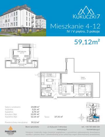 Mieszkanie 4-12 IV i V piętro, 3 pokoje 59,12m² KORYTARZ (IIp) 6,47 m² SYPIALNIA (IIp) 12,14 m TARAS 27,31 m² ŁAZIENKA 3,21m ² SALON Z ANEKSEM 23,08m ² Salon z aneksem: Łazienka: Sypialnia: Korytarz (IIp): Sypialnia (IIp): 23,08 m² 3,21 m² 6,74 m² 13,95 m² 12,14 m² Powierzchnia mieszkalna: 59,12 m² Biuro sprzedaży Taras: SYPIALNIA 6,74 m² 27,31 m² ul. Kukuczki 7, Wrocław www.pcg.pl tel.: +48 785 888 148 [email protected] Niniejsze materiały mają charakter poglądowy, a przedmiot zobowiązania dewelopera wynika z umowy stron i zatwierdzonej przez właściwy organ dokumentacji projektowej