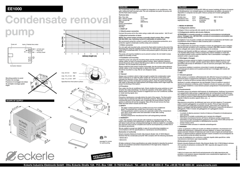 Condensate removal pump ITALIANO The condensate pump EE 1000 is suitable for integration in air conditioners- mini split, ceiling and wall mounted units. The unit comprises two parts: the pump unit and the float switch module. La pompa di estrazione condensa EE 1000 può essere installata all’interno di impianti di climatizzazione, con minisplit oppure con attrezzature da soffitto o da parete. Il dispositivo è composto da due parti: il blocco pompa ed il modulo galleggiante. Technical data: Dati tecnici: Max. flow rate: Max. delivery height: Max. suction lift: Voltage: Power consumption: Operation Standby 10 l/h 10 m head 1.5 m 230V/50 Hz Portata max.: 10 l/h Prevalenza max.: 10 m Aspirazione max.: 1,5 m 8W 1W 1. MESSA IN SERVIZIO 1. START UP 1.1 Electric power connection Connect the pump unit to the mains using a cable with cross-section 3x0.75 mm2. 1.2 Electrical connection of alarm NOTE: The control system includes a normally closed contact. Max. voltage 230 VAC/VDC, max. switching current 8 A admissible at resistive load. We recommend using this contact to switch off low-temperature production, as a protection against condensate overflow (relay and contactor). 1.3 Water connection For mini split wall-mounted units, connect the float switch module to the end of the discharge pipe using the supplied piece of hose. For other types, connect to the side outlet of the condensate tank. For suction and pressure pipes to the pump, use an NW6 hose. Mounting position to avoid Position de montage Posizione di montaggio da evitare Te vermijden montage opstellingen 8W Specified from the buttom surface Ø7 m 9m 3 2.3 Cleaning Preventive maintenance: annually before the start of the season. The float switch module may be cleaned only with non-alcoholic products. Always ensure before commencing work on the system and, in particular, the pump section, that the system is switched off and de-energized. Take off the lid and remove the float. Clean the float switch module and the float. SCOPE OF SUPPLY 3 77 82 m mm m 39 mm m m 7,5 3. SAFETY - - - - - The alarm contact prevents any overflow (cut-out of air conditioner) Note!! The potential-free contact has to be wired in any case! Thermal protection switch in pump unit, automatic switch-off at temperature over 100°C at the piston drive and automatic re-start after cooling Grounded pump Housing components manufactured from self-extinguishing materials 4. WARRANTY 62 mm 1 year. This warranty covers all parts with material or manufacturing faults. The buyer’s only remedy is the replacement or repair of the defective parts. In no case can labour costs and any consequential damage be cited as a basis for a complaint. Any returned units must be complete and must be accompanied by a written list of the defects ascertained. We are unable to accept any liability in case of nonconforming installation or noncompliance with the specifications or maintenance recommendations. Declaration of conformity Eckerle Industrie-Elektronik GmbH, Otto-Eckerle-Straße 12A, D-76316 Malsch declares that the condensate pump EE 1000 complies with the following standards: • EN 60 335-1 Ø 8 • EN 55 015 mm All data contained in these specifications are solely intended to describe the product and do not constitute warranted characteristics in the legal sense. Subject to technical change. 2x ATTENZIONE: Il comando prevede un contatto di commutazione normalmente chiuso. Voltaggio max. 230 VAC/VDC, corrente di commutazione ammissibile max. 8 A con carico ohmico. Consigliamo l’uso di questo contatto per interrompere la produzione del freddo e per la protezione contro il trabocco della condensa (relé e contattore). 1.3 Collegamento idraulico Nei condizionatori da parete tipo minisplit il modulo del galleggiante viene collegato alla fine del tubo di scarico con il manicotto a corredo. Sulle altre versioni il modulo viene collegato allo scarico laterale del serbatoio di condensa. Installare la pompa usando le cinghie e la gomma adesiva doppia faccia in modo proteggerla contro contatti. Lasciare spazio libero attorno al blocco pompa, per permettere alla pompa di raffreddare in caso di esercizio prolungato. Non isolare il blocco pompa. Pour water into the air conditioner tank. Check whether the pump switches on and off when the water rises/drops. To check the operation of the alarm switch, keep adding water until the alarm function is triggered (cut-out of air conditioner, audible or visual warning signal, etc.) m 1.2 Collegamento elettrico del circuito d’allarme 1.4 Montaggio e fissaggio 2.2 Procedure .0 m Collegare il blocco pompa alla rete usando cavi di sezione 3x0,75 mm2. Install the pump unit using the mounting straps and the double-sided adhesive cellular rubber so that it is protected against contact. Allow sufficient clearance around the pump unit to ensure that the pump is able to cool down after prolonged operation. Do not insulate the pump block. Always use a container which is high enough to contain the condensation water which continues to run after the alarm switch-off. The arrow on the pump unit indicates the direction of flow. Check whether the hoses are connected properly. Before start-up of the condensate conveying system, clean the system thoroughly with water to eliminate any metal splinters and foreign bodies which might impair the proper functioning of the system. max. 14 ± 2 mm OFF 1.1 Collegamento elettrico 1.4 Installation and mounting 2.1 General max. 18 ± 2 mm ON 8W 1W Utilizzare tubi flessibili da DN6 per realizzare i collegamenti idraulici di aspirazione e di mandata della pompa. Il blocco pompa deve essere installato in modo tale da risultare protetto contro scariche elettriche. Non è ammissibile il montaggio in ambienti umidi o esposti al gelo. 2. USE Alarm 230 V / 50 Hz The pump unit must be installed so as to prevent contact. Do not install in areas subject to humidity or frost. Always install the float switch module horizontally. Use the double-