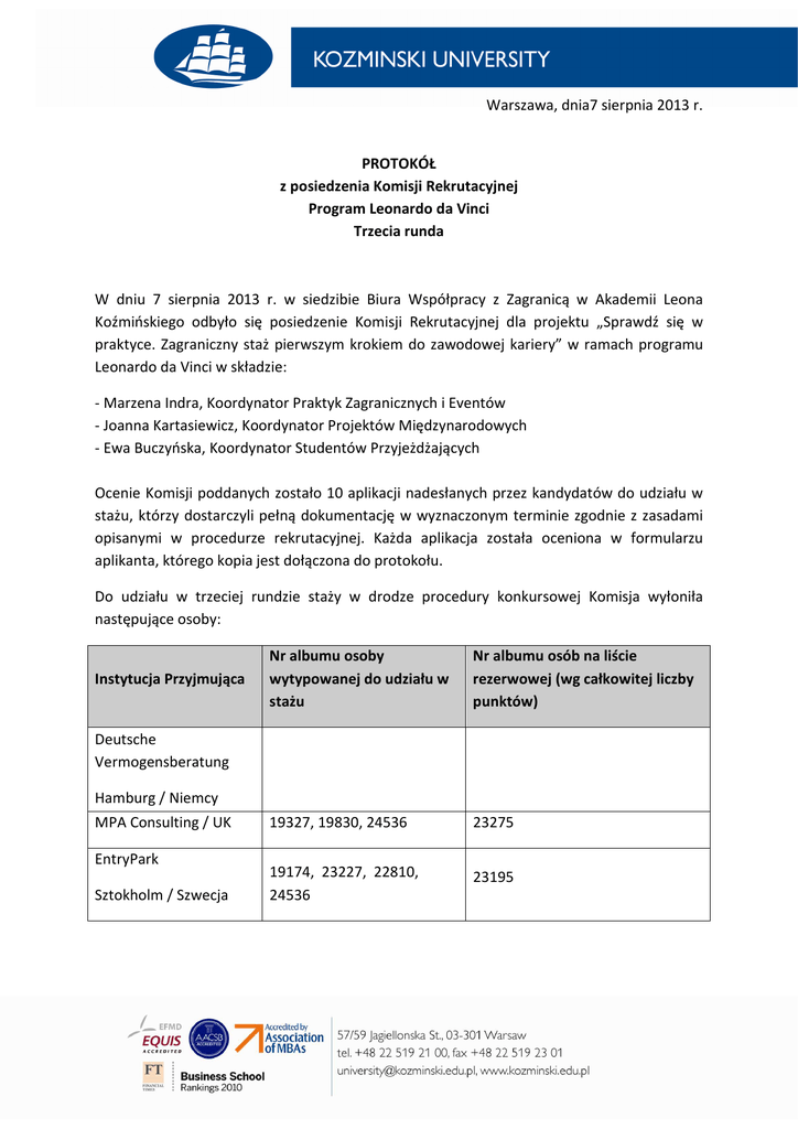 Warszawa, dnia7 sierpnia 2013 r. PROTOKÓŁ z posiedzenia Komisji Rekrutacyjnej Program Leonardo da Vinci Trzecia runda W dniu 7 sierpnia 2013 r. w siedzibie Biura Współpracy z Zagranicą w Akademii Leona Koźmińskiego odbyło się posiedzenie Komisji Rekrutacyjnej dla projektu „Sprawdź się w praktyce. Zagraniczny staż pierwszym krokiem do zawodowej kariery” w ramach programu Leonardo da Vinci w składzie: - Marzena Indra, Koordynator Praktyk Zagranicznych i Eventów - Joanna Kartasiewicz, Koordynator Projektów Międzynarodowych - Ewa Buczyńska, Koordynator Studentów Przyjeżdżających Ocenie Komisji poddanych zostało 10 aplikacji nadesłanych przez kandydatów do udziału w stażu, którzy dostarczyli pełną dokumentację w wyznaczonym terminie zgodnie z zasadami opisanymi w procedurze rekrutacyjnej. Każda aplikacja została oceniona w formularzu aplikanta, którego kopia jest dołączona do protokołu. Do udziału w trzeciej rundzie staży w drodze procedury konkursowej Komisja wyłoniła następujące osoby: Instytucja Przyjmująca Nr albumu osoby wytypowanej do udziału w stażu Nr albumu osób na liście rezerwowej (wg całkowitej liczby punktów) 19327, 19830, 24536 23275 19174, 23227, 22810, 24536 23195 Deutsche Vermogensberatung Hamburg / Niemcy MPA Consulting / UK EntryPark Sztokholm / Szwecja Aplikacje wytypowanych osób zostaną przekazane wybranym przez nie instytucjom przyjmującym. Ostateczna decyzja o przyjęciu na staż następuje po akceptacji kandydata przez partnerską instytucję przyjmującą, która w tym celu może wymagać udziału kandydata w rozmowie kwalifikacyjnej przeprowadzonej w drodze wideokonferencji w Akademii Leona Koźmińskiego. W przypadku odrzucenia przez instytucję oferującą staż kandydata wytypowanego w pierwszej kolejności, przekazane zostaną do oceny kandydatury osób z listy rezerwowej. Pełna lista rankingowa wraz z liczbą przyznanych punktów: Pozycja rankingowa Nr albumu Całkowita liczba punktów Instytucja przyjmująca wskazana w aplikacji 1 19174 90 Entrypark 2 23227 80 Entrypark 2 19830 80 MPA 2 19327 80 MPA + Entrypark 2 24536 80 MPA + Entrypark 3 23195 70 Entrypark 4 22803 60 Entrypark 4 23183 60 Entrypark 4 23275 60 Entrypark + MPA 19776 50 Instytucja przyjmująca nie została wskazana 5