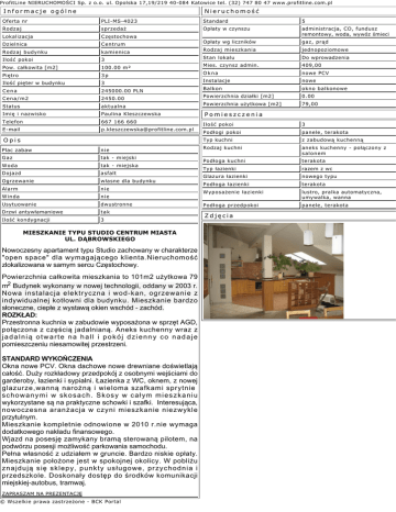 ProfitLine NIERUCHOMOŚCI Sp. z o.o. ul. Opolska 17,19/219 40-084 Katowice tel. (32) 747 80 47 www.profitline.com.pl Informacje ogólne Nieruchomość Oferta nr PLI-MS-4023 Standard 5 Rodzaj sprzedaż Opłaty w czynszu Lokalizacja Częstochowa administracja, CO, fundusz remontowy, woda, wywóz śmieci Dzielnica Centrum Opłaty wg liczników gaz, prąd Rodzaj budynku kamienica Rodzaj mieszkania jednopoziomowe 3 Stan lokalu Do wprowadzenia 100.00 m² Mies. czynsz admin. 409,00 3p Okna nowe PCV Ilość pięter w budynku 3 Instalacje nowe Cena 245000.00 PLN Balkon okno balkonowe 2450.00 Powierzchnia działki [m2] 0.00 Status aktualna Powierzchnia użytkowa [m2] 79,00 Imię i nazwisko Paulina Kleszczewska Pomieszczenia Telefon 667 166 660 E-mail [email protected] Ilość pokoi Pow. całkowita [m2] Piętro Cena/m2 Opis Plac zabaw nie Gaz tak - miejski Woda tak - miejska Dojazd asfalt Ogrzewanie własne dla budynku Alarm nie Winda nie Usytuowanie dwustronne Drzwi antywłamaniowe tak Ilość kondygnacji 3 MIESZKANIE TYPU STUDIO CENTRUM MIASTA UL. DĄBROWSKIEGO Nowoczesny apartament typu Studio zachowany w charakterze "open space" dla wymagającego klienta.Nieruchomość zlokalizowana w samym sercu Częstochowy. Powierzchnia całkowita mieszkania to 101m2 użytkowa 79 m2 Budynek wykonany w nowej technologii, oddany w 2003 r. Nowa instalacja elektryczna i wod-kan, ogrzewanie z indywidualnej kotłowni dla budynku. Mieszkanie bardzo słoneczne, ciepłe z wystawą okien wschód - zachód. ROZKŁAD: Przestronna kuchnia w zabudowie wyposażona w sprzęt AGD, połączona z częścią jadalnianą. Aneks kuchenny wraz z jadalnią otwarte na hall i pokój dzienny co nadaje pomieszczeniu niesamowitej przestrzeni. STANDARD WYKOŃCZENIA Okna nowe PCV. Okna dachowe nowe drewniane doświetlają całość. Duży rozkładowy przedpokój z osobnymi wejściami do garderoby, łazienki i sypialni. Łazienka z WC, oknem, z nowej glazurze,wanną narożną i wieloma szafkami sprytnie schowanymi w skosach. Skosy w całym mieszkaniu wykorzystane są na praktyczne schowki i szafki. Interesująca, nowoczesna aranżacja w czyni mieszkanie niezwykle przytulnym. Mieszkanie kompletnie odnowione w 2010 r.nie wymaga dodatkowego nakładu finansowego. Wjazd na posesję zamykany bramą sterowaną pilotem, na podwórzu posesji możliwość parkowania samochodu. Pełna własność z udziałem w gruncie. Bardzo niskie opłaty. Mieszkanie położone jest w spokojnej okolicy. W pobliżu znajdują się sklepy, punkty usługowe, przychodnia i przedszkole. Doskonały dostęp do środków komunikacji miejskiej-autobus, tramwaj. ZAPRASZAM NA PREZENTACJĘ © Wszelkie prawa zastrzeżone - BCK Portal Ilość pokoi 3 Podłogi pokoi panele, terakota Typ kuchni z zabudową kuchenną Rodzaj kuchni aneks kuchenny - połączony z salonem Podłoga kuchni terakota Typ łazienki razem z wc Glazura łazienki nowego typu Podłoga łazienki terakota Wyposażenie łazienki lustro, pralka automatyczna, umywalka, wanna Podłoga przedpokoi panele, terakota Zdjęcia