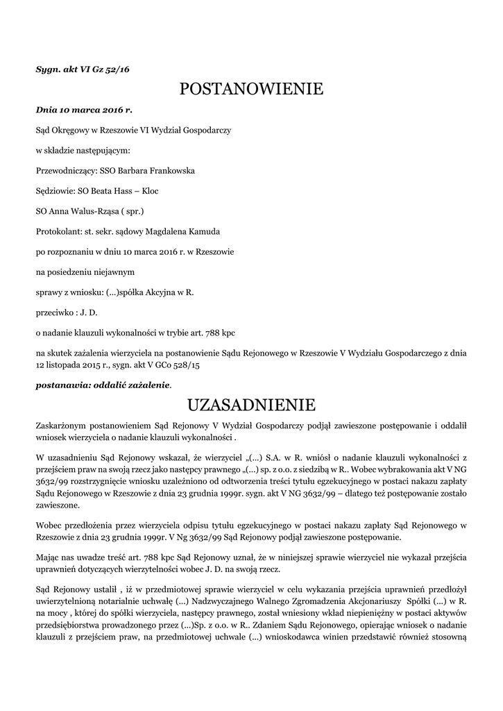 Sygn. akt VI Gz 52/16 POSTANOWIENIE Dnia 10 marca 2016 r. Sąd Okręgowy w Rzeszowie VI Wydział Gospodarczy w składzie następującym: Przewodniczący: SSO Barbara Frankowska Sędziowie: SO Beata Hass – Kloc SO Anna Walus-Rząsa ( spr.) Protokolant: st. sekr. sądowy Magdalena Kamuda po rozpoznaniu w dniu 10 marca 2016 r. w Rzeszowie na posiedzeniu niejawnym sprawy z wniosku: (...)spółka Akcyjna w R. przeciwko : J. D. o nadanie klauzuli wykonalności w trybie art. 788 kpc na skutek zażalenia wierzyciela na postanowienie Sądu Rejonowego w Rzeszowie V Wydziału Gospodarczego z dnia 12 listopada 2015 r., sygn. akt V GCo 528/15 postanawia: oddalić zażalenie. UZASADNIENIE Zaskarżonym postanowieniem Sąd Rejonowy V Wydział Gospodarczy podjął zawieszone postępowanie i oddalił wniosek wierzyciela o nadanie klauzuli wykonalności . W uzasadnieniu Sąd Rejonowy wskazał, że wierzyciel „(...) S.A. w R. wniósł o nadanie klauzuli wykonalności z przejściem praw na swoją rzecz jako następcy prawnego „(...) sp. z o.o. z siedzibą w R.. Wobec wybrakowania akt V NG 3632/99 rozstrzygnięcie wniosku uzależniono od odtworzenia treści tytułu egzekucyjnego w postaci nakazu zapłaty Sądu Rejonowego w Rzeszowie z dnia 23 grudnia 1999r. sygn. akt V NG 3632/99 – dlatego też postępowanie zostało zawieszone. Wobec przedłożenia przez wierzyciela odpisu tytułu egzekucyjnego w postaci nakazu zapłaty Sąd Rejonowego w Rzeszowie z dnia 23 grudnia 1999r. V Ng 3632/99 Sąd Rejonowy podjął zawieszone postępowanie. Mając nas uwadze treść art. 788 kpc Sąd Rejonowy uznał, że w niniejszej sprawie wierzyciel nie wykazał przejścia uprawnień dotyczących wierzytelności wobec J. D. na swoją rzecz. Sąd Rejonowy ustalił , iż w przedmiotowej sprawie wierzyciel w celu wykazania przejścia uprawnień przedłożył uwierzytelnioną notarialnie uchwałę (...) Nadzwyczajnego Walnego Zgromadzenia Akcjonariuszy Spółki (...) w R. na mocy , której do spółki wierzyciela, następcy prawnego, został wniesiony wkład niepieniężny w postaci aktywów przedsiębiorstwa prowadzonego przez (...)Sp. z o.o. w R.. Zdaniem Sądu Rejonowego, opierając wniosek o nadanie klauzuli z przejściem praw, na przedmiotowej uchwale (...) wnioskodawca winien przedstawić również stosowną umowę pomiędzy (...)sp. z o.o. w R. a (...) S.A. w R., wykazującą fakt przejścia aktywów wchodzących w skład przedsiębiorstwa – czego wnioskodawca nie uczynił. Sąd Rejonowy wskazał, że uchwała o podwyższeniu kapitału zakładowego w spółce akcyjnej nie przenosi własności wkładu, w tym przypadku aktywów wchodzących w skład przedmiotowego przedsiębiorstwa. Uchwała walnego zgromadzenia jest bowiem jedną z podstaw wpisu podwyższenia kapitału zakładowego jednak sama jako taka nie wywołuje skutku rozporządzającego. Oprócz uchwały konieczne jest zawsze zawarcie umowy pomiędzy wnoszącym wkład a spółką celem przeniesienia własności tego wkładu na rzecz spółki. Sąd Rejonowy wskazał, że przedłożona uchwała wspomina zaledwie o takich aktywach jak nieruchomości, majątek trwały i majątek obrotowy. Oznacza to, że wnioskodawca nie wykazał by w skład przedsiębiorstwa wchodziła wierzytelność wobec J. D.. Zażalenie na powyższe postanowienie złożył wierzyciel. Zaskarżając postanowienie w części dotyczącej pkt II wniósł o uchylenie zaskarżonego postanowienia w pkt II i nadanie klauzuli wykonalności nakazowi zapłaty wydanemu w postępowaniu nakazowym przez Sąd Rejonowy w Rzeszowie Sąd Gospodarczy w dniu 23 grudnia 1999r. sygn. akt V NG 3632/99 na rzecz wierzyciela – następcę prawnego „(...)S.A. w R.. Ponadto wniósł o zaopatrzenie w/w nakazu w klauzulę wykonalności i doręczenie wnioskodawcy, a także o zasądzenie kosztów postępowania klauzulowego. Mając na uwadze powyższe wierzyciel wskazał, że jego zdaniem załączona do wniosku uchwała jest dokumentem , który stwierdza przejście praw stosownie do art. 788 kpc. Ponadto oferta zawarta w uchwale nr (...) została przyjęta przez nabywcę akcji a zbywcę aportu tj. (...) spółka z o.o. w R., a fakt, że została zawarta stosowna umowa, potwierdza załączony do zażalenia wydruk komputerowy aktualnych informacji o podmiotach wpisanych do rejestru przedsiębiorców. W rubryce 4- informacje o statucie , pod poz. 2 widnieje wpis: „(...). rep. (...) notariusz D. M. , Kancelaria Notarialna w D. ul. (...), (...)-(...) D. - zmieniono : par. 6 ust. 1 , par.6 ust. 3, par. 6 ust. 4, par.10, ust. 1. par. 10 ust. 2 , par. 10 ust.5, dodano: par. 6 ust. 6, par.6 ust. 7”. Przedmiotowa uchwała złożona do sądu rejestrowego wraz z umową objęcia akcji i przekazania aportu nie mogła być więc z nią sprzeczna. Przedłożony wydruk, wg. art. 4 ust. 4 aa ustawy z dnia 30 sierpnia 1997 r., o Krajowym Rejestrze Sądowym ( Dz.U. 2007 r. nr 168 poz. 1186 z późn. zmn. ) ma moc dokumentu urzędowego , a więc zasadne jest posłużenie się nim jako dokumentem wykazującym przejście praw w rozumieniu art. 788 kpc. Sąd Okręgowy zważył, co następuje: Zażalenie nie zasługuje na uwzględnienie. Zgodnie z art. 788 § 1 kpc, jeżeli uprawnienie lub obowiązek po powstaniu tytułu egzekucyjnego lub w toku sprawy przed wydaniem tytułu przeszły na inną osobę , sąd nada klauzulę wykonalności na rzecz lub przeciwko tej osobie, gdy przejście to będzie wykazane dokumentem urzędowym lub prywatnym z podpisem urzędowo poświadczonym. W niniejszej sprawie wierzyciel celem wykazania przejścia uprawnień przedłożył uwierzytelnioną notarialnie uchwałę nr(...) Nadzwyczajnego Walnego Zgromadzenia Akcjonariuszy spółki (...) S.A. w R., z której wynika, że do spółki wierzyciela został wniesiony wkład niepieniężny w postaci aktywów przedsiębiorstwa (...) Sp. z o.o. w R.. W związku z powyższym został podwyższony kapitał zakładowy. Sąd Rejonowy wskazał, że sama uchwała o wniesieniu wk