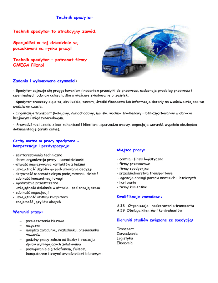 Technik spedytor Technik spedytor to atrakcyjny zawód. Specjaliści w tej dziedzinie są poszukiwani na rynku pracy! Technik spedytor – patronat firmy OMEGA Pilzno! Zadania i wykonywane czynności: - Spedytor zajmuje się przygotowaniem i nadaniem przesyłki do przewozu, nadzoruje przebieg przewozu i ewentualnych odpraw celnych, dba o właściwe składowanie przesyłek. - Spedytor troszczy się o to, aby ludzie, towary, środki finansowe lub informacje dotarły na właściwe miejsce we właściwym czasie. - Organizuje transport (kolejowy, samochodowy, morski, wodno- śródlądowy i lotniczy) towarów w obrocie krajowym i międzynarodowym. - Prowadzi rozliczenia z kontrahentami i klientami, sporządza umowy, negocjuje warunki, wypełnia niezbędną dokumentację (druki celne). Cechy ważne w pracy spedytora kompetencje i predyspozycje: - zainteresowania techniczne - dobra organizacja pracy i samodzielność - łatwość nawiązywania kontaktów z ludźmi - umiejętność szybkiego podejmowania decyzji - aktywność w samodzielnym podejmowaniu działań - zdolność koncentracji uwagi - wyobraźnia przestrzenna - umiejętność działania w stresie i pod presją czasu - zdolność negocjacji - umiejętność obsługi komputera - znajomość języków obcych Warunki pracy: pomieszczenia biurowe magazyn miejsca załadunku, rozładunku, przeładunku towarów godziny pracy zależą od liczby i rodzaju spraw wymagających załatwienia posługiwanie się telefonem, faksem, komputerem i innymi urządzeniami biurowymi Miejsca pracy: - centra i firmy logistyczne - firmy przewozowe - firmy spedycyjne - przedsiębiorstwa transportowe - agencje obsługi portów morskich i lotniczych - hurtownie - firmy kurierskie Kwalifikacje zawodowe: A.28 Organizacja i nadzorowanie transportu A.29 Obsługa klientów i kontrahentów Kierunki studiów związane ze spedycją: Transport Zarządzanie Logistyka Ekonomia