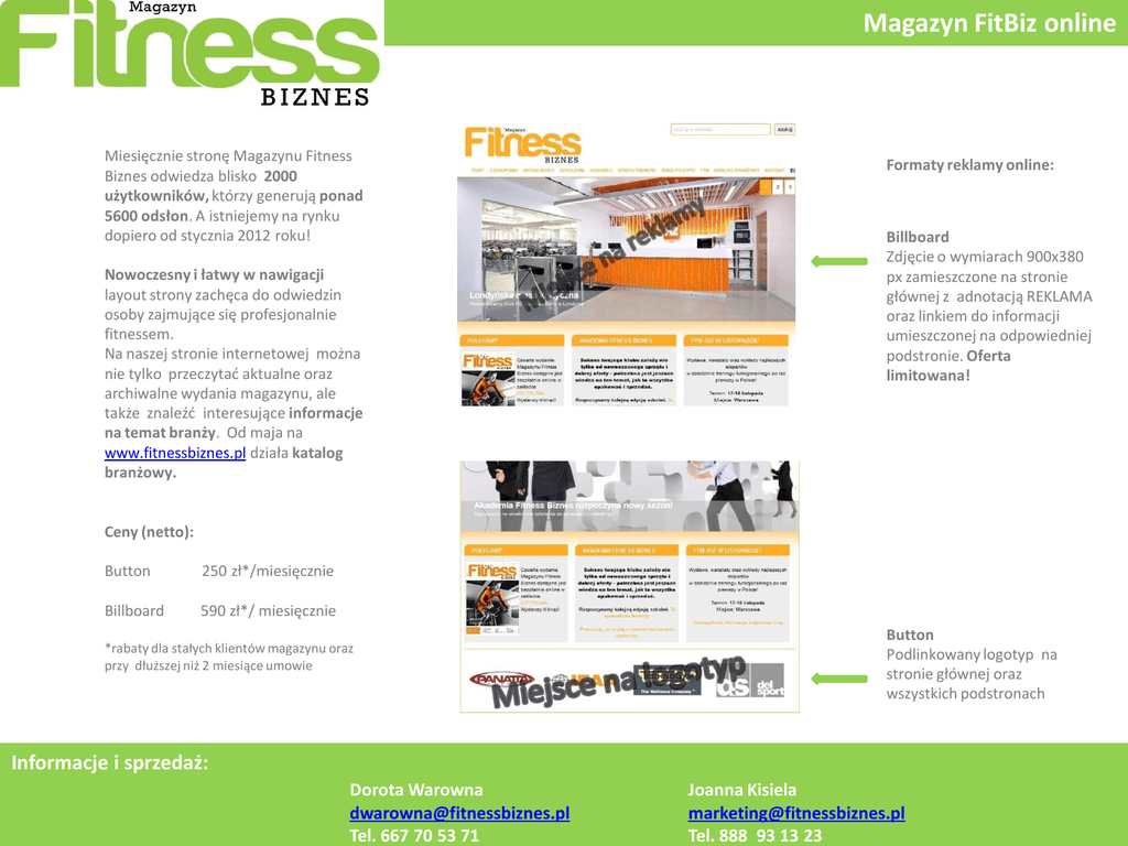 Magazyn FitBiz online Miesięcznie stronę Magazynu Fitness Biznes odwiedza blisko 2000 użytkowników, którzy generują ponad 5600 odsłon. A istniejemy na rynku dopiero od stycznia 2012 roku! Nowoczesny i łatwy w nawigacji layout strony zachęca do odwiedzin osoby zajmujące się profesjonalnie fitnessem. Na naszej stronie internetowej można nie tylko przeczytać aktualne oraz archiwalne wydania magazynu, ale także znaleźć interesujące informacje na temat branży. Od maja na www.fitnessbiznes.pl działa katalog branżowy. Formaty reklamy online: Billboard Zdjęcie o wymiarach 900x380 px zamieszczone na stronie głównej z adnotacją REKLAMA oraz linkiem do informacji umieszczonej na odpowiedniej podstronie. Oferta limitowana! Ceny (netto): Button 250 zł*/miesięcznie Billboard 590 zł*/ miesięcznie *rabaty dla stałych klientów magazynu oraz przy dłuższej niż 2 miesiące umowie Button Podlinkowany logotyp na stronie głównej oraz wszystkich podstronach Informacje i sprzedaż: Dorota Warowna [email protected] Tel. 667 70 53 71 Joanna Kisiela [email protected] Tel. 888 93 13 23