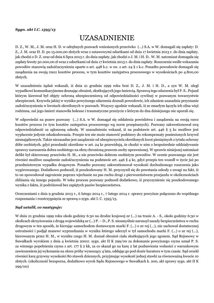 Sygn. akt I.C. 1595/13 UZASADNIENIE D. Z., W. M., J. M. oraz H. D. w odrębnych pozwach wniesionych przeciwko (...) S.A. w W. domagali się zapłaty: D. Z., J. M. oraz H. D. po 15.000,00 złotych wraz z ustawowymi odsetkami od dnia 17 kwietnia 2013 r. do dnia zapłaty, jak chodzi o D. Z. oraz od dnia 6 lipca 2013 r. do dnia zapłaty, jak chodzi o J. M. i H. D.. W. M. natomiast domagała się zapłaty kwoty 50.000,00 zł wraz z odsetkami od dnia 17 kwietnia 2013 r. do dnia zapłaty. Roszczenia wedle wskazania powodów stanowią zadośćuczynienia oparte o art. 448 k.c. w zw. z art. 24 § 1 k.c. Ponadto powodowie domagali się zasądzenia na swoją rzecz kosztów procesu, w tym kosztów zastępstwa procesowego w wysokościach po 4.800,00 złotych. W uzasadnieniu żądań wskazali, iż dnia 21 grudnia 1999 roku brat D. Z., J. M. i H. D., a syn W. M. uległ wypadkowi komunikacyjnemu doznając obrażeń, skutkujących jego śmiercią. Sprawcą tego zdarzenia był P. S.. Pojazd którym kierował był objęty ochroną ubezpieczeniową od odpowiedzialności cywilnej w pozwanym towarzystwie ubezpieczeń. Krzywda jakiej w wyniku powyższego zdarzenia doznali powodowie, ich zdaniem uzasadnia przyznanie zadośćuczynienia w kwotach określonych w pozwach. Wszyscy zgodnie wskazali, iż ze zmarłym łączyła ich silna więź rodzinna, zaś jego śmierć stanowiła bolesne i traumatyczne przeżycie z którym do dna dzisiejszego nie uporali się. W odpowiedzi na pozew pozwany (...) S.A. w W. domagał się oddalenia powództwa i zasądzenia na swoją rzecz kosztów procesu (w tym kosztów zastępstwa procesowego wg norm przepisanych). Pozwany zakwestionował swą odpowiedzialność za zgłoszoną szkodę. W uzasadnieniu wskazał, iż na podstawie art. 446 § 3 kc możliwe jest wypłacenie jedynie odszkodowania. Przepis ten nie może stanowić podstawy do rekompensaty poniesionych krzywd niemajątkowych. Także niezasadne jest zasądzenie od ubezpieczyciela określonych kwot pieniężnych z tytułu ochrony dóbr osobistych, gdyż przesłanki określone w art. 24 kc przewidują, że chodzi w nim o bezpośrednie oddziaływanie sprawcy naruszenia dobra osobistego na sferę chronioną prawem osoby uprawnionej. W sprawie niniejszej natomiast delikt był skierowany przeciwko H. M., a nie przeciwko dobrom osobistym powodów. W ocenie pozwanego nie jest również możliwe zasądzenie zadośćuczynienia na podstawie art. 446 § 4 kc, gdyż przepis ten wszedł w życie już po przedmiotowym wypadku drogowym. Ponadto pozwany zakwestionował wysokość dochodzonego roszczenia jako wygórowanego. Dodatkowo podnosił, iż poszkodowany H. M. przyczynił się do powstania szkody z uwagi na fakt, iż to on spowodował zagrożenie poprzez wjechanie na pas ruchu drogi z pierwszeństwem przejazdu w okolicznościach zbliżania się innego pojazdu. W toku procesu pozwany podnosił dodatkowo, iż przyczynienie się poszkodowanego wynika z faktu, iż podróżował bez zapiętych pasów bezpieczeństwa. Orzeczeniami z dnia 9 grudnia 2013 r., 6 lutego 2014 r., 7 lutego 2014 r. sprawy powyższe połączono do wspólnego rozpoznania i rozstrzygnięcia ze sprawą o sygn. akt I. C. 1595/13. Sąd ustalił, co następuje: W dniu 21 grudnia 1999 roku około godziny 6:30 na drodze krajowej nr (...) na trasie A. - S., około godziny 6:30 w okolicach skrzyżowania z drogą wojewódzką nr (...) P. – D., P. S. nieumyślnie naruszył zasady bezpieczeństwa w ruchu drogowym w ten sposób, że kierując samochodem dostawczym marki F. (...) o nr rej (...), nie zachował dostatecznej ostrożności i podjął manewr wyprzedzania w wyniku którego uderzył w tył samochodu marki F. (...) o nr rej (...), kierowanym przez H. M., w wyniku czego H. M. doznał obrażeń ciała skutkujących jego zgonem. Sąd Rejonowy w Suwałkach wyrokiem z dnia 4 kwietnia 2001r. sygn. akt II K 299/00 za dokonanie powyższego czynu uznał P. S. za winnego popełnienia czynu z art. 177 § 2 kk, za co skazał go na karę 2 lat pozbawienia wolności z warunkowym zawieszeniem jej wykonania na okres próby wynoszący 4 lata, oddając go pod dozór kuratora w tym czasie. Sąd orzekł również karę grzywny wysokości 80 stawek dziennych, przyjmując wysokość jednej stawki za równoważną kwocie 10 złotych. (okoliczność bezsporna, dodatkowo wyrok Sądu Rejonowego w Suwałkach k. 200, akt sprawy sygn. akt II K 299/00) Udział H. M. w zaistnieniu zdarzenia z dnia 21 grudnia 1999 r. sprowadzał się do roli osoby poszkodowanej w związku z nieprawidłową techniką i taktyką jazdy zastosowaną przez sprawcę zdarzenia tj. P. S., kierującego z nadmierną prędkością pojazdem F. (...). Do powstania przedmiotowego wypadku H. M. nie przyczynił się. Wyłączną przyczyną wypadku była nieprawidłowa technika (...). (dowód: opinia biegłego z zakresu techniki pojazdów samochodowych i maszyn, kalkulacji napraw pojazdów i maszyn, rekonstrukcji wypadków drogowych K. K. k. 341 – 367) H. M. w chwili wypadku nie miał zapiętych pasów bezpieczeństwa. Zapięcie pasa wyeliminowałoby ciężki uraz czaszkowo – mózgowy i pęknięcie śledziony. Pozostałe obrażenia ciała H. M., oprócz tych, które eliminowałoby prawidłowe zadziałanie pasów, najprawdopodobniej nie skutkowałby zgonem H. M.. (dowód: opinia Zakładu Medycyny Sądowej (...) w B. k. 431 – 434, k. 462-464) W momencie zdarzenia pojazd którym kierował sprawca kolizji F. (...) o nr rej (...) korzystał z ochrony ubezpieczeniowej w (...) S.A. w W.. (bezsporne dodatkowo akt szkody (...) k. 67 koperta, k. 252 koperta,) H. M., w dacie śmierci miał 40 lata (dowód: kopia odpisu aktu zgonu w aktach szkody). Przed wypadkiem pracował jako stolarz. Miał ukończony kurs nurkowania. Zmarł jako rozwiedziony. Z rodziny pozostawił po sobie m. in. matkę W. oraz rodzeństwo D. Z., J. M. oraz H. D.. H. M. był bardzo rodzinny i towarzyski. Wszyscy go lubili. (dowód: wyjaśnienia i zeznania stron k. 68 – 6