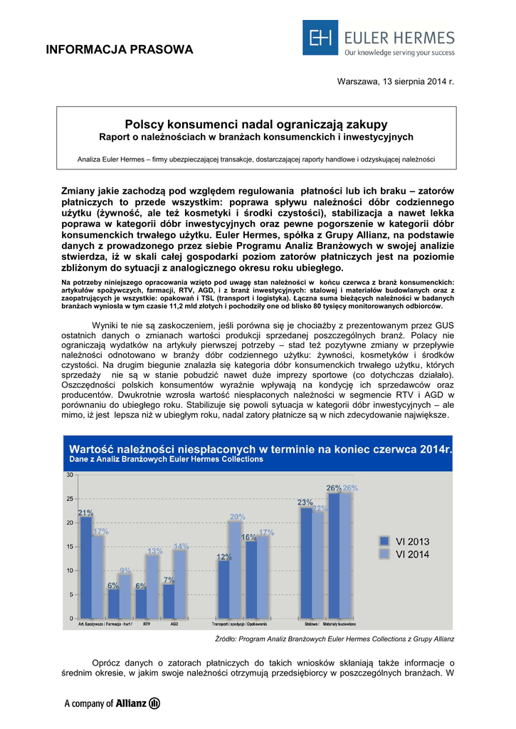 INFORMACJA PRASOWA Warszawa, 13 sierpnia 2014 r. Polscy konsumenci nadal ograniczają zakupy Raport o należnościach w branżach konsumenckich i inwestycyjnych Analiza Euler Hermes – firmy ubezpieczającej transakcje, dostarczającej raporty handlowe i odzyskującej należności Zmiany jakie zachodzą pod względem regulowania płatności lub ich braku – zatorów płatniczych to przede wszystkim: poprawa spływu należności dóbr codziennego użytku (żywność, ale też kosmetyki i środki czystości), stabilizacja a nawet lekka poprawa w kategorii dóbr inwestycyjnych oraz pewne pogorszenie w kategorii dóbr konsumenckich trwałego użytku. Euler Hermes, spółka z Grupy Allianz, na podstawie danych z prowadzonego przez siebie Programu Analiz Branżowych w swojej analizie stwierdza, iż w skali całej gospodarki poziom zatorów płatniczych jest na poziomie zbliżonym do sytuacji z analogicznego okresu roku ubiegłego. Na potrzeby niniejszego opracowania wzięto pod uwagę stan należności w końcu czerwca z branż konsumenckich: artykułów spożywczych, farmacji, RTV, AGD, i z branż inwestycyjnych: stalowej i materiałów budowlanych oraz z zaopatrujących je wszystkie: opakowań i TSL (transport i logistyka). Łączna suma bieżących należności w badanych branżach wyniosła w tym czasie 11,2 mld złotych i pochodziły one od blisko 80 tysięcy monitorowanych odbiorców. Wyniki te nie są zaskoczeniem, jeśli porówna się je chociażby z prezentowanym przez GUS ostatnich danych o zmianach wartości produkcji sprzedanej poszczególnych branż. Polacy nie ograniczają wydatków na artykuły pierwszej potrzeby – stad też pozytywne zmiany w przepływie należności odnotowano w branży dóbr codziennego użytku: żywności, kosmetyków i środków czystości. Na drugim biegunie znalazła się kategoria dóbr konsumenckich trwałego użytku, których sprzedaży nie są w stanie pobudzić nawet duże imprezy sportowe (co dotychczas działało). Oszczędności polskich konsumentów wyraźnie wpływają na kondycję ich sprzedawców oraz producentów. Dwukrotnie wzrosła wartość niespłaconych należności w segmencie RTV i AGD w porównaniu do ubiegłego roku. Stabilizuje się powoli sytuacja w kategorii dóbr inwestycyjnych – ale mimo, iż jest lepsza niż w ubiegłym roku, nadal zatory płatnicze są w nich zdecydowanie największe. Źródło: Program Analiz Branżowych Euler Hermes Collections z Grupy Allianz Oprócz danych o zatorach płatniczych do takich wniosków skłaniają także informacje o średnim okresie, w jakim swoje należności otrzymują przedsiębiorcy w poszczególnych branżach. W sektorze artykułów spożywczych przeciętny czas regulowanie płatności uległ nawet skróceniu w porównaniu do roku ubiegłego. Pewnym odstępstwem od tego w kategorii dóbr pierwszej potrzeby jest sytuacja w farmacji (prezentujemy kształtowanie się przepływów finansowych w relacji producenci – dystrybutorzy hurtowi) – tutaj o płatnościach, ich spowolnieniu decydują zmiany na rynku sprzedaży detalicznej, jej koncentracja (wypieranie z rynku aptek niezależnych przez apteki sieciowe, afiliowane m.in. przy hurtowniach farmaceutycznych) i specjalizacja aptek (leki refundowane vs. suplementy i specjalistyczne kosmetyki). Z tego powodu jeszcze bardziej w stosunku do ubiegłego roku spowolnił obieg należności na linii hurtownie-apteki. Wydłużenie średniego okresu spływu należności w miało miejsce także w branżach RTV, AGD, TSL oraz opakowań. Z kolei w branży materiałów budowlanych okres ten, chociaż nadal jeden z najdłuższych, uległ kilkudniowemu skróceniu. Źródło: Program Analiz Branżowych Euler Hermes Collections z Grupy Allianz „Popyt na artykuły codziennej potrzeby jest stały, a służą mu jeszcze niskie ceny, będące efektem zarówno spadającej inflacji, jak i walki cenowej towarzyszącej konkurencji różnych kanałów dystrybucji (supermarkety, dyskonty, mniejsze formaty osiedlowe, afiliowane sieci największych hurtowników), jak również skutkiem np. spadku cen mięsa i jego przetworów czy nabiału w wyniku ich nadprodukcji i ograniczeń w eksporcie” – ocenia Tomasz Starus, członek zarządu Euler Hermes, odpowiedzialny za ocenę ryzyka. Zwraca on również uwagę na fakt, iż w branży dóbr inwestycyjnych wartość produkcji sprzedanej w ostatnich dwóch miesiącach rośnie i jest lepsza nie tylko w porównaniu do miesięcy poprzednich, ale także w porównaniu do poziomu sprzed roku (+4% w czerwcu – dane za GUS). To efekt zarówno odradzających się inwestycji infrastrukturalnych, ale też mieszkaniowych oraz inwestycji przedsiębiorstw. Ponadto rynek wykonawców inwestycji – przede wszystkim firm budowlanych oczyścił się, stąd aktualnie wykonawcy nie są obciążeni w takim stopniu długami z przeszłości, jak miało to miejsce kilka kwartałów temu. W związku z tym regulują należności za materiały w przeciętnie krótszym niż jeszcze rok temu terminie. Pojawiły się też niestety gorsze informacje: w budownictwie widać kolejne problemy części deweloperów, co wraz z wcześniejszymi ich upadłościami (aż 23 przypadki w ciągu I półrocza) pociąga za sobą problemy firm budownictwa mieszkaniowego. Ponownie więc w lipcowej statystyce opublikowanych upadłości znalazły się firmy wykończeniowe (prace hydrauliczne, kanalizacyjne, elektryczne etc.). Dobra sprzedaż artykułów inwestycyjnych oznacza oczywiście zwiększenie obrotów ich producentów i dystrybutorów, ale z drugiej strony także potencjalne ryzyko w przyszłości – uzależnienie od tego, w jakim kierunku zmieniać się będzie koniunktura budowlana, a więc nawet od pogody w miesiącach zimowych – mówi Tomasz Starus. Sprzedaż ta odbywa się bowiem na zasadzie kredytu kupieckiego o długim, 2-3 miesięcznym terminie płatności – zwiększenie sprzedaży oznacza więc także zwiększenie ekspozycji na potencjalne ryz