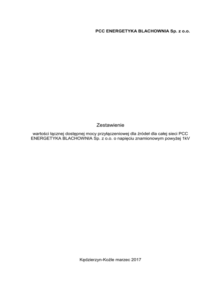 PCC ENERGETYKA BLACHOWNIA Sp. z o.o. Zestawienie wartości łącznej dostępnej mocy przyłączeniowej dla źródeł dla całej sieci PCC ENERGETYKA BLACHOWNIA Sp. z o.o. o napięciu znamionowym powyżej 1kV Kędzierzyn-Koźle marzec 2017 I. Wprowadzenie Zgodnie z nowelizacją ustawy Prawo energetyczne oraz niektórych innych ustaw (Dz. U. z 2011 r. Nr 205, poz. 1208), przedsiębiorstwa energetyczne zajmujące się dystrybucją energii elektrycznej obowiązane są publikować wartości łącznej dostępnej mocy przyłączeniowej dla źródeł, a także planowanych zmian tych wartości w okresie kolejnych 5 lat od dnia ich publikacji, dla całej sieci przedsiębiorstwa o napięciu znamionowym powyżej 1kV z podziałem na stacje elektroenergetyczne lub ich grupy wchodzące w skład sieci o napięciu znamionowym 110kV i wyższym; wartość łącznej mocy przyłączeniowej jest pomniejszana o moc wynikającą z wydanych i ważnych warunków przyłączenia źródeł do sieci elektroenergetycznej. Wielkości dostępnych mocy przyłączeniowych przedstawiono w formie tabelarycznej dla stacji wchodzących w skład sieci 6kV. II. Informacje dla inwestorów Prezentowane wielkości dostępnych mocy przyłączeniowych są wielkościami łącznymi dla sieci średniego napięcia na wskazanym obszarze. 2. Prezentowane wielkości dostępnych mocy przyłączeniowych w kolejnych latach są wielkościami dostępnymi w danym roku. W związku z tym planując inwestycję należy brać pod uwagę wielkość dostępnej mocy jaka została podana dla roku, w którym planuje się uruchomienie źródła wytwórczego. 3. Z uwagi na zachodzące zmiany warunków pracy sieci, związane z realizowanymi inwestycjami w sieci dystrybucyjnej (w tym przyłączeniami lub odłączeniami źródeł wytwórczych) prognozowane wielkości dostępnych mocy przyłączeniowych będą ulegały zmianie. Zgodnie z ustawą Prawo energetyczne informacje te będą aktualizowane co najmniej raz na kwartał. 4. Szczegółowe informacje w zakresie sposobu oraz miejsca przyłączenia źródła wytwórczego, PCC Energetyka Blachownia Sp. z o.o. określi w warunkach przyłączenia wydanych na podstawie wniosku o określenie warunków przyłączenia. Zestawienie wartości łącznej dostępnej mocy przyłączeniowej dla źródeł, dla całej sieci przedsiębiorstwa o napięciu znamionowym powyżej 1kV, z podziałem na stacje wchodzące w skład sieci o napięciu znamionowym 6kV w latach 2016-2021 (stan na dzień 28 lutego 2017 roku). 1. 2017 2018 2019 2020 MW MW MW MW 1 783 2,0 2,0 0,5 0,5 2 758 0,1 0,1 0,1 0,1 3 786 0,1 0,1 0,1 0,1 4 787 1,0 1,0 0,5 0,5 5 785 1,0 1,0 1,0 1,0 6 702 2,0 2,0 1,0 0,0 7 791 0,6 0,6 0,5 0,0 8 284 0,4 0,4 0,4 0,0 9 780 0,5 0,5 0,5 0,0 OSD nie posiada sieci o napięciu znamionowym 110kV. Lp. Stacja 2021 MW 0,1 0,1 0,1 0,5 1,0 0,0 0,0 0,0 0,0 2022 MW 0,1 0,1 0,1 0,5 1,0 0,0 0,0 0,0 0,0
