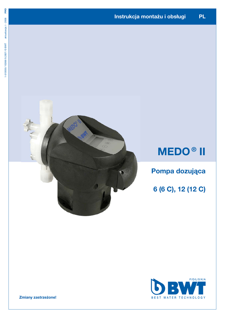 PRO PL 1-510055 / 10268 / 9.2007 / © BWT aktualizacja: I - 2008 Instrukcja montażu i obsługi MEDO ® II Pompa dozująca 6 (6 C), 12 (12 C) Zmiany zastrzeżone! PL ZAKRES DOSTAWY Pompka dozująca MEDO II: 1 2 3 4 5 6 7 8 9 - głowica dozująca śruba odpowietrzająca z przyłączem węża 4x6 cokół mocujący z otworami montażowymi do wodomierza przyłącze przewodu ssawnego przyłącze przewodu dozującego listwa przyłączeniowa z przyłączami zewnętrznego sygnału sterującego (np. wodomierza kontaktowego) lub zewnętrznego regulatora (ewent. zdalnego sterowania) oraz przyłącze do lancy ssawnej z włącznikiem panel sterujący z wyświetlaczem i przyciskami do ustawiania pompki (włączanie/wyłączanie) oraz programowania wskaźnik stanu pracy i częstotliwości dozowania (dioda zielona) wskaźnik pustego zbiornika i awarii (dioda czerwona) kabel 1,5 m z wtyczką sieciową WYPOSAŻENIE DODATKOWE - kabel do sygnalizacji zakłóceń nr zam.: 8-130046 - kabel przesyłu sygnału nr zam.: 8-130045 W naszym programie dostawy posiadamy także inne wyposażenie dodatkowe takie, jak m.in.: - środki chemiczne do dozowania, - zbiorniki dozujące z wyposażeniem, - inżektory, przewody ssawne i dozujące, - wodomierze kontaktowe, - zawory i lance ssawne, - czujniki poziomu, - elektryczne skrzynki przyłączeniowe, - wzmacniacz impulsów, - przewody meldunków zakłóceń, - przewody impulsowe. 6 zewn. sygnał 0 1 2 lanca ssaw- ZLT sieć sterowanie centralne WSKAZÓWKI BEZPIECZEŃSTWA PRZY DOZOWANIU CHEMIKALIÓW 9 8 7 UWAGA: Stosować należy wyłącznie oryginalne substancje i roztwory chemikaliów dostarczane przez BWT. W przeciwnym razie pompka może ulec uszkodzeniu i nie podlega gwarancji. Niedopuszczalne jest także mieszanie różnych typów substacji, gdyż może to spowodować poważne uszkodzenia urządzenia i całej instalacji. Zabrania się przelewania substancji przeznaczonych do dozowania do innych pojemników. Nie należy używać uszkodzonych zbiorników. Po otwarciu opakowania, chemikalia należy zużyć najpóźniej w ciągu 6 miesięcy (DIN 19635). Przestrzegać daty przydatności podanej na opakowaniu. Aby zapewnić bezawaryjną pracę pompek dozujących należy dozować roztwory o lepkości zbliżonej do wody (1,002 mPas). Kwas solny wytwarza opary kwasowe - należy możliwie zredukować stężenie roztworu ( ok. 1/3 kwasu na 2/3 wody) Należy pamiętać o kolejności wlewania substancji do zbiornika dozującego : zawsze najpierw WODA, a potem KWAS! W przeciwnym razie istnieje niebezpieczeństwo poważnego uszkodzenia ciała. Jeżeli pompka ustawiona jest na niską wydajność dozowania, możliwe jest wydzielanie gazu z roztworu chloru w pojemniku, co może doprowadzić do zakłóceń w pracy pompki (niebezpieczeństwo krystalizowania). W tym przypadku należy osadzić niżej niż zbiornik dozujący. UWAGA: Przestrzegac informacji podanych w kartach danych bezpieczeństwa substancji niebezpiecznych! Podczas pracy z substancjami niebezpiecznymi używać ubrań ochronnych 2 Podchloryn sodu żrący Kwas solny, 30% żrący Kwas siarkowy, 40% żrący Nadtlenek wodoru, 30% żrący Zasad sodowa, 40% żrący Węglan sodu drażniący Nadmanganian potasu, proszek przenoszący pożar, szkodliwy dla zdrowia, niebezpieczny dla środowiska Przed użyciem substancji stałych, np. proszku lub grubszych kryształów, należy najpierw napełnić zbiornik dozujący wodą (jeżeli to możliwie uzdatnioną - zmiękczoną), a następnie powoli dosypywać substancję, jednocześnie dokładnie mieszając mieszadłem ręcznym lub automatycznym. W przypadku dozowania ługów wybielających należy regularnie, przynajmniej co 4 tygodnie, dokładnie umyć w ciepłej wodzie i oczyścić zawór ssawny, przewody dozujące, lance ssawne oraz inżektory. UWAGA: w przypadku dozowania fosforanów woda do napełniania basenu musi być pobierana przed inżektorem fosforanów. Aby zapewnić stałą i prawidłową ochronę instalacji należy dozować niezmiennie jeden odpowienio dobrany środek chemiczny, zgodnie z analizą wody. Kontrolować zużycie środka i okresowo uzupełniać - najpóźniej wtedy, gdy sygnalizuje to lampka kontrolna (9) pustego zbiornika. ZASTOSOWANIE PL Pompki dozujące MEDO II przeznaczone są wyłącznie do dozowania roztworów substancji chemicznych produkcji BWT, stosowanych w różnych procesach uzdatniania wody pitnej i użytkowej zgodnie z wymogami norm DIN oraz przepisów DVGW, ÖVGW). Pompki można stosować także do dokładnego, ekonomicznego dozowania innych cieczy lub roztworów chemikaliów np. w przemyśle lub przy oczyszczaniu ścieków. Jednak w takim przypadku bezwzględnie konieczna jest pomoc i konsultacja techniczna z producentem (dostawcą towaru). SPOSÓB DZIAŁANIA Pompki dozujące MEDO II są energooszczędnymi pompami membranowymi z napędem silnikowym. W zależności od modelu oferują różne możliwości sterowania i załączania, a więc różne typy dozowania cieczy. WARUNKI WSTĘPNE MONTAŻU Przy montażu pompki MEDO II należy zwrócić uwagę na obowiązujące lokalnie przepisy dotyczące instalacji wodnych, ogólne wytyczne higieniczne oraz parametry techniczne urządzeń. *głowica dozująca obrócona o 90° (przyłącza muszą zawsze znajdować się w pozycji pionowej) 9 System dozujący musi być ustawiony w miejscu suchym, chronionym przed mrozem i zanieczyszczeniami (dopuszczalne temperatury zewnętrzne podane w danych technicznych). Należy unikać montażu w pobliżu źródeł ciepła lub powiewów gorącego powietrza. Należy zagwarantować ochronę urządzenia przed oparami rozpuszczalników, olejem opałowym, ługami myjącymi, wszystkimi rodzajami chemikaliów, promieniowaniem UV. Przy montażu i i eksploatacji pompki przestrzegać postanowienia normy DIN 1988 część 8. Pompę należy chronić przed dostępem osób nieupoważnionych. W tym celu przewidziana jest opcja kodowania ustawień pompki. Dla skutecznej pracy instalacji niezb