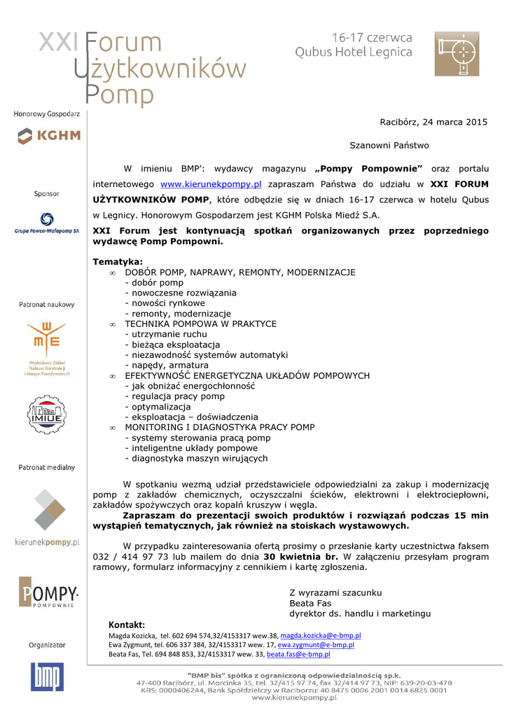 Racibórz, 24 marca 2015 Szanowni Państwo W imieniu BMP’: wydawcy magazynu „Pompy Pompownie” oraz portalu internetowego www.kierunekpompy.pl zapraszam Państwa do udziału w XXI FORUM UŻYTKOWNIKÓW POMP, które odbędzie się w dniach 16-17 czerwca w hotelu Qubus w Legnicy. Honorowym Gospodarzem jest KGHM Polska Miedź S.A. XXI Forum jest kontynuacją wydawcę Pomp Pompowni. spotkań organizowanych przez poprzedniego Tematyka: • DOBÓR POMP, NAPRAWY, REMONTY, MODERNIZACJE - dobór pomp - nowoczesne rozwiązania - nowości rynkowe - remonty, modernizacje • TECHNIKA POMPOWA W PRAKTYCE - utrzymanie ruchu - bieżąca eksploatacja - niezawodność systemów automatyki - napędy, armatura • EFEKTYWNOŚĆ ENERGETYCZNA UKŁADÓW POMPOWYCH - jak obniżać energochłonność - regulacja pracy pomp - optymalizacja - eksploatacja – doświadczenia • MONITORING I DIAGNOSTYKA PRACY POMP - systemy sterowania pracą pomp - inteligentne układy pompowe - diagnostyka maszyn wirujących W spotkaniu wezmą udział przedstawiciele odpowiedzialni za zakup i modernizację pomp z zakładów chemicznych, oczyszczalni ścieków, elektrowni i elektrociepłowni, zakładów spożywczych oraz kopalń kruszyw i węgla. Zapraszam do prezentacji swoich produktów i rozwiązań podczas 15 min wystąpień tematycznych, jak również na stoiskach wystawowych. W przypadku zainteresowania ofertą prosimy o przesłanie karty uczestnictwa faksem 032 / 414 97 73 lub mailem do dnia 30 kwietnia br. W załączeniu przesyłam program ramowy, formularz informacyjny z cennikiem i kartę zgłoszenia. Z wyrazami szacunku Beata Fas dyrektor ds. handlu i marketingu Kontakt: Magda Kozicka, tel. 602 694 574,32/4153317 wew.38, [email protected] Ewa Zygmunt, tel. 606 337 384, 32/4153317 wew. 17, [email protected] Beata Fas, Tel. 694 848 853, 32/4153317 wew. 33, [email protected] FORMULARZ INFORMACYJNY I. Sponsor – oferta obejmuje: 1. Przyznanie tytułu sponsora XXI Forum Użytkowników Pomp 2. Prezentację firmy do 15min 3. Pokrycie kosztów udziału dla 2 osób z firmy (wyżywienie, materiały konferencyjne, zakwaterowanie: 1 doba) 4. Wyeksponowanie na zaproszeniach, transparentach i pismach oraz w obiektach, w których będzie przebiegać impreza, nazwy firmy i logo jako sponsora konferencji. 5. Udostępnienie powierzchni wystawienniczej do 8m2 (zabudowa oktanorm, wyposażenie obejmuje: 3 ścianki pełne, stolik, 4 krzesła, oświetlenie, zasilanie 220V, wykładzinę, fryz z nazwą i logo wystawcy). 6. Reklama A4 w „Pompy Pompownie” 2/2015 7. Zamieszczenie informacji o firmie w materiałach konferencyjnych (1 strona, wersja czarno-biała). 8. Baner na stronie portalu www.kierunekpompy.pl przez 1 miesiąc. Koszt promocji: 19 000 zł netto II. Partner – oferta obejmuje: 1. Przyznanie tytułu partnera XXI Forum Użytkowników Pomp 2. Prezentację firmy do 15 min. 3. Pokrycie kosztów udziału dla 2 osób z firmy (wyżywienie, materiały, zakwaterowanie: 1 doba) 4. Wyeksponowanie na zaproszeniach, plakatach, transparentach i pismach oraz w obiektach, w których będzie przebiegać impreza, nazwy firmy i logo jako partnera. 5. Udostępnienie powierzchni wystawienniczej do 4m2 (zabudowa oktanorm, wyposażenie obejmuje: 3 ścianki pełne, stolik, 4 krzesła, oświetlenie, zasilanie 220V, wykładzinę, fryz z nazwą i logo wystawcy). 6. Reklama A4 w „Pompy Pompownie” 2/2015 7. Zamieszczenie informacji o firmie w materiałach konferencyjnych (1 strona, wersja czarno-biała). 8. Baner na stronie portalu www.kierunekpompy.pl przez 1 miesiąc. Koszt promocji: 15 000 zł netto III. Inne formy promocji: a) PAKIET I (stoisko 4 m2 + prezentacja + reklama): 1. Powierzchnia wystawiennicza 4 m2 (zabudowa oktanorm, wyposażenie obejmuje: 3 ścianki pełne, stolik, 2 krzesła, oświetlenie, zasilanie 220V, wykładzinę, fryz z nazwą i logo wystawcy). 2. Prezentacja firmy do 15 min. 3. Reklama A4 w „Pompy Pompownie” 2/2015 4. Zamieszczenie informacji o firmie w materiałach konferencyjnych (1 strona, wersja czarno-biała). Koszt: 8 500 zł netto b) PAKIET II (stoisko 2 m2 + prezentacja + reklama): 1. Powierzchnia wystawiennicza 2m2 (zabudowa oktanorm, wyposażenie obejmuje: 3 ścianki pełne, stolik, 2 krzesła, oświetlenie, zasilanie 220V, wykładzinę, fryz z nazwą i logo wystawcy). 2. Prezentacja firmy do 15 min. 3. Reklama A4 w „Pompy Pompownie” 2/2015 4. Zamieszczenie informacji o firmie w materiałach konferencyjnych (1 strona, wersja czarno-biała). Koszt: 7 500 zł netto b) PAKIET III (prezentacja + reklama): 1. Prezentacja firmy do 15 min. 2. Zamieszczenie informacji o firmie w materiałach konferencyjnych (1 strona, wersja czarno-biała). 3. Reklama A4 w „Pompy Pompownie” 2/2015 Koszt: 5 300 zł netto c) PAKIET IV (prezentacja): 1. Prezentacja firmy do 15 min. 2. Zamieszczenie informacji o firmie w materiałach konferencyjnych (1 strona, wersja czarno-biała). Koszt: 2 900 zł netto d) PAKIET V (stoisko 4 m2): 1. Powierzchnia wystawiennicza 4m2 (zabudowa oktanorm, wyposażenie obejmuje: 3 ścianki pełne, stolik, 2 krzesła, oświetlenie, zasilanie 220V, wykładzinę, fryz z nazwą i logo wystawcy). 2. Zamieszczenie informacji o firmie w materiałach konferencyjnych (1 strona, wersja czarno-biała). Koszt: 3 400 zł netto e) PAKIET VI (stoisko 2 m2): 1. Powierzchnia wystawiennicza 2m2 (zabudowa oktanorm, wyposażenie obejmuje: 3 ścianki pełne, stolik, 2 krzesła, oświetlenie, zasilanie 220V, wykładzinę, fryz z nazwą i logo wystawcy). 2. Zamieszczenie informacji o firmie w materiałach konferencyjnych (1 strona, wersja czarno-biała). Koszt: 2 400 zł netto f) PAKIET VII (baner): 1. Powierzchnia na wystawienie banera reklamowego w części wystawienniczej (organizator zapewnia powierzchnię wystawienniczą – szerokość do 1,5 m). 2. Zamieszczenie informacji o firmie w materiałach konferencyjnych (1 strona, wersja czarno-biała). Koszt: 1 500 zł netto IV. Promocja w materiałach konferencyjnych: a) 