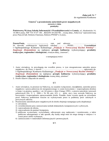 Załącznik Nr 7 do regulaminu Konkursu Umowa1 o przeniesieniu autorskich praw majątkowych zawarta w dniu pomiędzy Państwową Wyższą Szkołą Informatyki i Przedsiębiorczości w Łomży, ul. Akademicka 14, 18-400 Łomża, NIP 718 19 47 148: , REGON 451202740: , zwaną dalej „Nabywcą” reprezentowaną przez Pana dr hab. Roberta Charmasa, Rektora PWSIiP w Łomży, a Panem/Panią …………………………, Nr dowodu osobistego/nr legitymacji zam. pod adresem: ……………………………, szkolnej……………/PESEL…………, Uczestnikiem I Ogólnopolskiego Konkursu Kulinarnego „Tradycja w Nowoczesnej Kuchni Polskiej” Inspiracje Ziemniakiem na najlepszy przepis kulinarny wykorzystujący produkty tradycyjne, regionalne i ekologiczne, zwanym dalej „Autorem”, o następującej treści: § 1. 1. Autor oświadcza, że przysługują mu wszelkie prawa, w tym nieograniczone autorskie prawa majątkowe, do Pracy o nazwie : ….………………………………………………., zgłoszonej do, I Ogólnopolskiego Konkursu Kulinarnego „Tradycja w Nowoczesnej Kuchni Polskiej” Inspiracje Ziemniakiem na najlepszy przepis kulinarny wykorzystujący produkty tradycyjne, regionalne i ekologiczne zwanej dalej „dziełem”. 2. Dzieło stanowi załącznik do umowy. § 2. 1. Autor oświadcza, że przenosi na Nabywcę, na zasadzie wyłączności, nieodpłatnie, autorskie prawa majątkowe i prawa pokrewne do nieograniczonego w czasie korzystania i rozporządzania dziełem w kraju i za granicą, zgodnie z art. 64 ustawy z dnia 4 lutego 1994 r. o prawie autorskim i prawach pokrewnych (Dz. U. z 2006 r. Nr 90, poz. 631, z późn. zm.), oraz zezwala Nabywcy na korzystanie i rozporządzanie opracowaniami dzieła. Ponadto Autor wyraża zgodę na zezwalanie przez Nabywcę podmiotom trzecim na wykonywanie przez te podmioty praw zależnych w powyższym zakresie. 2. Przeniesienie autorskich praw majątkowych do dzieła obejmuje następujące pola eksploatacji: 1) utrwalenie, 2) zwielokrotnienie przy zastosowaniu technik drukarskich, komputerowych i cyfrowych, 3) wprowadzenie do obrotu, 4) wprowadzenie do pamięci komputera, 5) publiczne wystawianie, wyświetlanie, odtwarzanie oraz nadawanie i reemitowanie, a także publiczne udostępnianie w taki sposób, aby każdy mógł mieć do niego dostęp w miejscu i w czasie przez siebie wybranym, 6) zamieszczanie w materiałach informacyjnych i promocyjnych. § 3. 1. Autor jest odpowiedzialny względem Nabywcy za ewentualne roszczenia osób trzecich wynikające z naruszenia praw własności intelektualnej w związku z wykonaniem dzieła, w tym za nieprzestrzeganie przepisów ustawy z dnia 4 lutego 1994 r. o prawie autorskim i prawach pokrewnych. 2. W przypadku wystąpienia przeciwko Nabywcy przez osobę trzecią z roszczeniami wynikającymi z naruszenia jej praw, Autor dzieła zobowiązany jest do ich zaspokojenia i zwolnienia Nabywcy od obowiązku świadczeń z tego tytułu. § 4. Wszelkie zmiany niniejszej umowy wymagają formy pisemnej pod rygorem nieważności. § 5. W sprawach nieuregulowanych niniejszą umową mają zastosowanie przepisy z dnia 4 lutego 1994 r. o prawie autorskim i prawach pokrewnych oraz Kodeksu cywilnego. § 6. Spory wynikłe w związku z realizacją niniejszej umowy rozstrzygane będą przez sąd właściwy dla siedziby Nabywcy. § 7. Umowę sporządzono w dwóch jednobrzmiących egzemplarzach, w tym jeden dla Nabywcy i jeden dla Autora. NABYWCA 1 AUTOR Niniejszą umowę podpisuje każdy ze zgłoszonych w konkursie członków zespołu wraz z opiekunem w dwóch jednobrzmiących egzemplarzach i wysyła na adres Instytutu Technologii Żywności PWSIiP w Łomży pocztą.