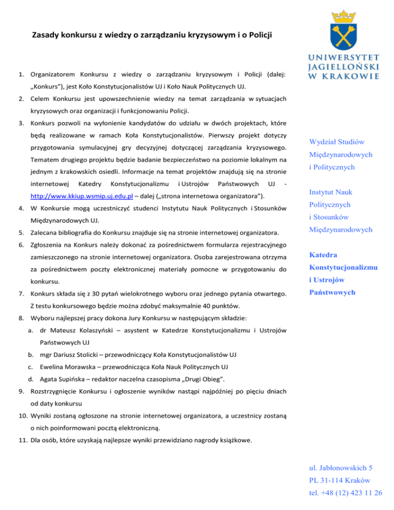 Zasady konkursu z wiedzy o zarządzaniu kryzysowym i o Policji 1. Organizatorem Konkursu z wiedzy o zarządzaniu kryzysowym i Policji (dalej: „Konkurs”), jest Koło Konstytucjonalistów UJ i Koło Nauk Politycznych UJ. 2. Celem Konkursu jest upowszechnienie wiedzy na temat zarządzania w sytuacjach kryzysowych oraz organizacji i funkcjonowaniu Policji. 3. Konkurs pozwoli na wyłonienie kandydatów do udziału w dwóch projektach, które będą realizowane w ramach Koła Konstytucjonalistów. Pierwszy projekt dotyczy przygotowania symulacyjnej gry decyzyjnej dotyczącej zarządzania kryzysowego. Tematem drugiego projektu będzie badanie bezpieczeństwo na poziomie lokalnym na jednym z krakowskich osiedli. Informacje na temat projektów znajdują się na stronie internetowej Katedry Konstytucjonalizmu i Ustrojów Państwowych http://www.kkiup.wsmip.uj.edu.pl – dalej („strona internetowa organizatora”). UJ - 4. W Konkursie mogą uczestniczyć studenci Instytutu Nauk Politycznych i Stosunków Międzynarodowych UJ. 5. Zalecana bibliografia do Konkursu znajduje się na stronie internetowej organizatora. 6. Zgłoszenia na Konkurs należy dokonać za pośrednictwem formularza rejestracyjnego Wydział Studiów Międzynarodowych i Politycznych Instytut Nauk Politycznych i Stosunków Międzynarodowych zamieszczonego na stronie internetowej organizatora. Osoba zarejestrowana otrzyma Katedra konkursu. i Ustrojów za pośrednictwem poczty elektronicznej materiały pomocne w przygotowaniu do 7. Konkurs składa się z 30 pytań wielokrotnego wyboru oraz jednego pytania otwartego. Z testu konkursowego będzie można zdobyć maksymalnie 40 punktów. Konstytucjonalizmu Państwowych 8. Wyboru najlepszej pracy dokona Jury Konkursu w następującym składzie: a. dr Mateusz Kolaszyński – asystent w Katedrze Konstytucjonalizmu i Ustrojów Państwowych UJ b. mgr Dariusz Stolicki – przewodniczący Koła Konstytucjonalistów UJ c. Ewelina Morawska – przewodnicząca Koła Nauk Politycznych UJ d. Agata Supińska – redaktor naczelna czasopisma „Drugi Obieg”. 9. Rozstrzygnięcie Konkursu i ogłoszenie wyników nastąpi najpóźniej po pięciu dniach od daty konkursu 10. Wyniki zostaną ogłoszone na stronie internetowej organizatora, a uczestnicy zostaną o nich poinformowani pocztą elektroniczną. 11. Dla osób, które uzyskają najlepsze wyniki przewidziano nagrody książkowe. ul. Jabłonowskich 5 PL 31-114 Kraków tel. +48 (12) 423 11 26