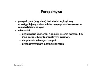 Perspektywa • perspektywa (ang. view) jest strukturą logiczną udostępniającą wybrane informacje przechowywane w relacjach bazy danych • własności – definiowana w oparciu o relacje (relacje bazowe) lub inne perspektywy (perspektywy bazowe), – nie posiada własnych danych – przechowywana w postaci zapytania Perspektywy 1 Perspektywa cd. • cel stosowania – ograniczenie dostępu do danych - zabezpieczenie przed nieautoryzowanym dostępem – uproszczenie schematu bazy danych -> uproszczenie zapytań – uniezależnienie aplikacji od zmian w strukturze bazy danych – prezentowanie danych w inny sposób niż dane w relacjach i perspektywach bazowych (m.in. zmiana nazw atrybutów, formaty danych) Perspektywy 2 Rodzaje perspektyw • proste – jedna relacja bazowa – brak funkcji – brak grupowania • złożone – oparte o wiele relacji bazowych – wykorzystują operatory zbiorowe, funkcje, grupowanie Perspektywy 3 Tworzenie perspektywy CREATE CREATE[OR [ORREPLACE] REPLACE]VIEW VIEWnazwa_perspektywy nazwa_perspektywy [([(atrybut1, atrybut1,atrybut2...)] atrybut2...)] AS AS SELECT SELECTciało_polecenia_SELECT ciało_polecenia_SELECT [WITH [WITHREAD READONLY] ONLY] [WITH ogr]]; [WITHCHECK CHECKOPTION OPTION[CONSTRAINT [CONSTRAINTnazwa_ nazwa_ogr]]; CREATE zesp CREATEOR ORREPLACE REPLACEVIEW VIEWprac_ prac_zesp AS AS SELECT _pod, p.id_ zesp, nazwa SELECTid_prac, id_prac,nazwisko, nazwisko,etat, etat,placa placa_pod, p.id_zesp, nazwa FROM FROMpracownicy pracownicyp, p,zespoly zespolyzz WHERE zesp=z.id_zesp; WHEREp.id_ p.id_zesp=z.id_zesp; Perspektywy 4 Tworzenie perspektywy cd. CREATE _pod, etat) CREATEVIEW VIEWwysokie_place wysokie_place(nazwisko, (nazwisko,placa placa_pod, etat) AS AS SELECT _pod, etat SELECTnazwisko, nazwisko,placa placa_pod, etat FROM FROMpracownicy pracownicy WHERE _pod >>1000 WHEREplaca placa_pod 1000 WITH _powyzej_1000; WITHCHECK CHECKOPTION OPTIONCONSTRAINT CONSTRAINTplaca placa_powyzej_1000; Perspektywy 5 Tworzenie perspektywy cd. • jeśli ciało polecenia SELECT wykorzystuje: – operatory zbiorowe, – funkcje grupowe, – klauzule GROUP BY, – operator DISTINCT, to do perspektywy można kierować tylko polecenie SELECT; • ciało polecenia SELECT nie może zawierać klauzuli: – ORDER BY Perspektywy 6 Perspektywa oparta o kilka relacji bazowych wykonanie wykonaniepolecenia polecenia SELECT SELECT UPDATE UPDATE DELETE DELETE INSERT INSERT Perspektywy zawsze zawsze tylko tylko dla dla jednej jednej zz relacji relacji bazowych bazowych zawierającej zawierającejklucz kluczobcy obcy tylko tylkodla dlajednej jednejzzrelacji relacjibazowych bazowych zawierającej zawierającejklucz kluczobcy obcy iiperspektywa perspektywamusi musiudostępniać udostępniać wszystkie wszystkieatrybuty atrybutyobowiązkowe obowiązkowetej tej relacji relacji 7 Kompilowanie perspektywy ALTER ALTERVIEW VIEWnazwa_perspektywy nazwa_perspektywyCOMPILE; COMPILE; Usuwanie perspektywy DROP DROPVIEW VIEWnazwa_perspektywy; nazwa_perspektywy; Słownik bazy danych • opis zdefiniowanych perspektyw – USER_VIEWS • informacje o możliwości uaktualniania danych dostępnych przez perspektywę – USER_UPDATABLE_COLUMNS Perspektywy 8