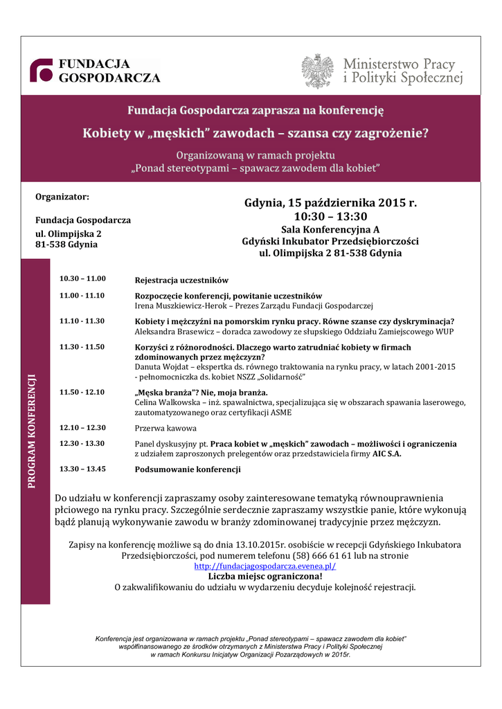 Organizator: Gdynia, 15 października 2015 r. 10:30 – 13:30 PROGRAM KONFERENCJI Fundacja Gospodarcza ul. Olimpijska 2 81-538 Gdynia Sala Konferencyjna A Gdyński Inkubator Przedsiębiorczości ul. Olimpijska 2 81-538 Gdynia 10.30 – 11.00 Rejestracja uczestników 11.00 - 11.10 Rozpoczęcie konferencji, powitanie uczestników Irena Muszkiewicz-Herok – Prezes Zarządu Fundacji Gospodarczej 11.10 - 11.30 Kobiety i mężczyźni na pomorskim rynku pracy. Równe szanse czy dyskryminacja? Aleksandra Brasewicz – doradca zawodowy ze słupskiego Oddziału Zamiejscowego WUP 11.30 - 11.50 Korzyści z różnorodności. Dlaczego warto zatrudniać kobiety w firmach zdominowanych przez mężczyzn? Danuta Wojdat – ekspertka ds. równego traktowania na rynku pracy, w latach 2001-2015 - pełnomocniczka ds. kobiet NSZZ „Solidarność” 11.50 - 12.10 „Męska branża”? Nie, moja branża. Celina Walkowska – inż. spawalnictwa, specjalizująca się w obszarach spawania laserowego, zautomatyzowanego oraz certyfikacji ASME 12.10 – 12.30 Przerwa kawowa 12.30 - 13.30 Panel dyskusyjny pt. Praca kobiet w „męskich” zawodach – możliwości i ograniczenia z udziałem zaproszonych prelegentów oraz przedstawiciela firmy AIC S.A. 13.30 – 13.45 Podsumowanie konferencji Do udziału w konferencji zapraszamy osoby zainteresowane tematyką równouprawnienia płciowego na rynku pracy. Szczególnie serdecznie zapraszamy wszystkie panie, które wykonują bądź planują wykonywanie zawodu w branży zdominowanej tradycyjnie przez mężczyzn. Zapisy na konferencję możliwe są do dnia 13.10.2015r. osobiście w recepcji Gdyńskiego Inkubatora Przedsiębiorczości, pod numerem telefonu (58) 666 61 61 lub na stronie http://fundacjagospodarcza.evenea.pl/ Liczba miejsc ograniczona! O zakwalifikowaniu do udziału w wydarzeniu decyduje kolejność rejestracji. Konferencja jest organizowana w ramach projektu „Ponad stereotypami – spawacz zawodem dla kobiet” współfinansowanego ze środków otrzymanych z Ministerstwa Pracy i Polityki Społecznej w ramach Konkursu Inicjatyw Organizacji Pozarządowych w 2015r.