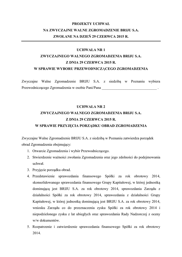 PROJEKTY UCHWAŁ NA ZWYCZAJNE WALNE ZGROMADZENIE BRIJU S.A. ZWOŁANE NA DZIEŃ 29 CZERWCA 2015 R. UCHWAŁA NR 1 ZWYCZAJNEGO WALNEGO ZGROMADZENIA BRIJU S.A. Z DNIA 29 CZERWCA 2015 R. W SPRAWIE WYBORU PRZEWODNICZĄCEGO ZGROMADZENIA Zwyczajne Walne BRIJU Zgromadzenie S.A. z siedzibą w Poznaniu wybiera Przewodniczącego Zgromadzenia w osobie Pani/Pana ______________________________ . UCHWAŁA NR 2 ZWYCZAJNEGO WALNEGO ZGROMADZENIA BRIJU S.A. Z DNIA 29 CZERWCA 2015 R. W SPRAWIE PRZYJĘCIA PORZĄDKU OBRAD ZGROMADZENIA Zwyczajne Walne Zgromadzenie BRIJU S.A. z siedzibą w Poznaniu zatwierdza porządek obrad Zgromadzenia obejmujący: 1. Otwarcie Zgromadzenia i wybór Przewodniczącego. 2. Stwierdzenie ważności zwołania Zgromadzenia oraz jego zdolności do podejmowania uchwał. 3. Przyjęcie porządku obrad. 4. Przedstawienie sprawozdania finansowego Spółki za rok obrotowy 2014, skonsolidowanego sprawozdania finansowego Grupy Kapitałowej, w której jednostką dominującą jest BRIJU S.A. za rok obrotowy 2014, sprawozdania Zarządu z działalności Spółki za rok obrotowy 2014, sprawozdania z działalności Grupy Kapitałowej, w której jednostką dominującą jest BRIJU S.A. za rok obrotowy 2014, wniosku Zarządu co do przeznaczenia zysku Spółki za rok obrotowy 2014 i niepodzielonego zysku z lat ubiegłych oraz sprawozdania Rady Nadzorczej z oceny w/w dokumentów. 5. Rozpatrzenie i zatwierdzenie sprawozdania finansowego Spółki za rok obrotowy 2014. 6. Rozpatrzenie i zatwierdzenie skonsolidowanego sprawozdania finansowego Grupy Kapitałowej, w której jednostką dominującą jest BRIJU S.A. za rok obrotowy 2014. 7. Rozpatrzenie i zatwierdzenie sprawozdania Zarządu z działalności Spółki za rok obrotowy 2014. 8. Rozpatrzenie i zatwierdzenie sprawozdania z działalności Grupy Kapitałowej, w której jednostką dominującą jest BRIJU S.A. za rok obrotowy 2014. 9. Podjęcie uchwały w zakresie przeznaczenia zysku Spółki za rok obrotowy 2014 i niepodzielonego zysku z lat ubiegłych. 10. Udzielenie członkom Zarządu absolutorium z wykonania obowiązków w roku 2014. 11. Udzielenie członkom Rady Nadzorczej absolutorium z wykonania obowiązków w roku 2014. 12. Podjęcie uchwały w sprawie zmiany Statutu. 13. Wolne wnioski. 14. Zamknięcie obrad Zgromadzenia. UCHWAŁA NR 3 ZWYCZAJNEGO WALNEGO ZGROMADZENIA BRIJU S.A. Z DNIA 29 CZERWCA 2015 R. W SPRAWIE ZATWIERDZENIA SPRAWOZDANIA FINANSOWEGO SPÓŁKI ZA ROK OBROTOWY 2014 Działając na podstawie art. 395 § 2 pkt 1 Kodeksu spółek handlowych oraz § 16 ust. 4 pkt 1 Statutu Spółki, Zwyczajne Walne Zgromadzenie BRIJU S.A. z siedzibą w Poznaniu, po zapoznaniu się z opinią i raportem biegłego rewidenta, niniejszym zatwierdza sprawozdanie finansowe Spółki za rok 2014, obejmujące: 1. wprowadzenie do sprawozdania finansowego, 2. bilans sporządzony na dzień 31 grudnia 2014 r., który po stronie aktywów i pasywów zamyka się sumą 78.008.082,00 zł. 3. rachunek zysków i strat za rok obrotowy od dnia 01 stycznia 2014 r. do dnia 31 grudnia 31 grudnia 2014 r., wykazujące zwiększenie kapitału własnego o kwotę 4.646.309,00 zł, Strona 4. zestawienie zmian w kapitale własnym za rok obrotowy od dnia 01 stycznia 2014 r. do dnia 2 2014 r. wykazujący zysk netto w wysokości 4.058.644,00 zł, 5. rachunek przepływów pieniężnych za rok obrotowy od dnia 01 stycznia 2014 r. do dnia 31 grudnia 2014 r. wykazujący zwiększenie stanu środków pieniężnych o kwotę 18.141.930,00 zł, 6. dodatkowe informacje i objaśnienia. UCHWAŁA NR 4 ZWYCZAJNEGO WALNEGO ZGROMADZENIA BRIJU S.A. Z DNIA 29 CZERWCA 2015 R. W SPRAWIE ZATWIERDZENIA SKONSOLIDOWANEGO SPRAWOZDANIA FINANSOWEGO GRUPY KAPITAŁOWEJ, W KTÓREJ JEDNOSTKĄ DOMINUJĄCĄ JEST BRIJU S.A. ZA ROK OBROTOWY 2014 Działając na podstawie art. 395 § 5 Kodeksu spółek handlowych, Zwyczajne Walne Zgromadzenie BRIJU S.A. z siedzibą w Poznaniu, po zapoznaniu się z opinią i raportem biegłego rewidenta, niniejszym zatwierdza skonsolidowane sprawozdanie finansowe Grupy Kapitałowej, w której jednostką dominującą jest BRIJU S.A. za rok obrotowy 2014, obejmujące: 1. wprowadzenie do skonsolidowanego sprawozdania finansowego, 2. skonsolidowany bilans sporządzony na dzień 31 grudnia 2014 r., który po stronie aktywów i pasywów zamyka się sumą 80.435.091,00 zł, 3. skonsolidowany rachunek zysków i strat za rok obrotowy od dnia 01 stycznia 2014 r. do dnia 31 grudnia 2014 r. wykazujący zysk netto w wysokości 12.575.758,00 zł, 4. zestawienie zmian w skonsolidowanym kapitale (funduszu) własnym za rok obrotowy od dnia 01 stycznia 2014 r. do dnia 31 grudnia 2014 r., wykazujące zwiększenie kapitału własnego o kwotę 13.169.689,00 zł, 5. skonsolidowany rachunek przepływów pieniężnych za rok obrotowy od dnia 01 stycznia 2014 r. do dnia 31 grudnia 2014 r. wykazujący zwiększenie stanu środków pieniężnych o kwotę 10.502.365,00 zł, Strona 3 6. dodatkowe informacje i objaśnienia. UCHWAŁA NR 5 ZWYCZAJNEGO WALNEGO ZGROMADZENIA BRIJU S.A. Z DNIA 29 CZERWCA 2015 R. W SPRAWIE ZATWIERDZENIA SPRAWOZDANIA ZARZĄDU Z DZIAŁALNOŚCI SPÓŁKI ZA ROK OBROTOWY 2014 Działając na podstawie art. 395 § 2 pkt 1 Kodeksu spółek handlowych oraz § 16 ust. 4 pkt 1 Statutu Spółki, Zwyczajne Walne Zgromadzenie spółki BRIJU S.A. zatwierdza Sprawozdanie Zarządu z działalności Spółki w 2014 roku. UCHWAŁA NR 6 ZWYCZAJNEGO WALNEGO ZGROMADZENIA BRIJU S.A. Z DNIA 29 CZERWCA 2015 R. W SPRAWIE ZATWIERDZENIA SPRAWOZDANIA Z DZIAŁALNOŚCI GRUPY KAPITAŁOWEJ, W KTÓREJ JEDNOSTKĄ DOMINUJĄCĄ JEST BRIJU S.A. ZA ROK OBROTOWY 2014 Działając na podstawie art. 395 § 2 pkt 1 w zw. z art. 395 § 5 Kodeksu spółek handlowych, Zwyczajne Walne Zgromadzenie spółki BRIJU S.A. zatwierdza Sprawozdanie z działalności Grupy Kapitałowej, w której jednostką dominującą jest BRIJU S.A. za rok obrotowy 2014. UCHWAŁA NR 7 ZWYCZAJNEGO WALNEGO ZGROMADZENIA BRIJU S.A. Z DNIA 29 CZERWCA 2015 R. W SPRAWIE PRZE