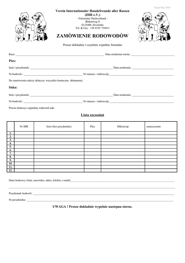 Stand Mai 2010 Verein Internationaler Hundefreunde aller Rassen (IHR e.V.) - Nationaler Dachverband – Birkenweg 8 D-25486 Alveslohe Tel. & Fax: +49 4193 754911 ZAMÒWIENIE RODOWODÒW Prosze dokladnie i czytelnie wypelnic formulaz Rasa: _______________________________________________________________ Data orudzenia miotu: _______________________________ Pies: Imie i przydomek: ___________________________________________________________ Data urodzenia: ______________________________ Nr hodowli.: __________________________________________ Nr tatuazu / mikroczip:______________________________________________ Do zamòwienia nalezy dolaczyc wszystkie konieczne dokumenty Suka: Imie i przydomek: ___________________________________________________________ Data urodzenia: ______________________________ Nr hodowli.: __________________________________________ Nr tatuazu / mikroczip:______________________________________________ Prosze dolaczyc orginalny rodowòd suki Lista szczeniat Nr IHR Imie (bez przydomku) Plec Mikroczip umaszczenie 1. 2. 3. 4. 5. 6. 7. 8. 9. 10. 11. 12. Dane hodowcy (imie, nazwisko, adres, telefon, e-mail):__________________________________________________________________________ _______________________________________________________________________________________________________________________ Przydomek hodowli: _____________________________________________________________________________________________________ Nr przydomku: _________________________________________________________________________________________________________ UWAGA ! Prosze dokladnie wypelnic nastepna storne.