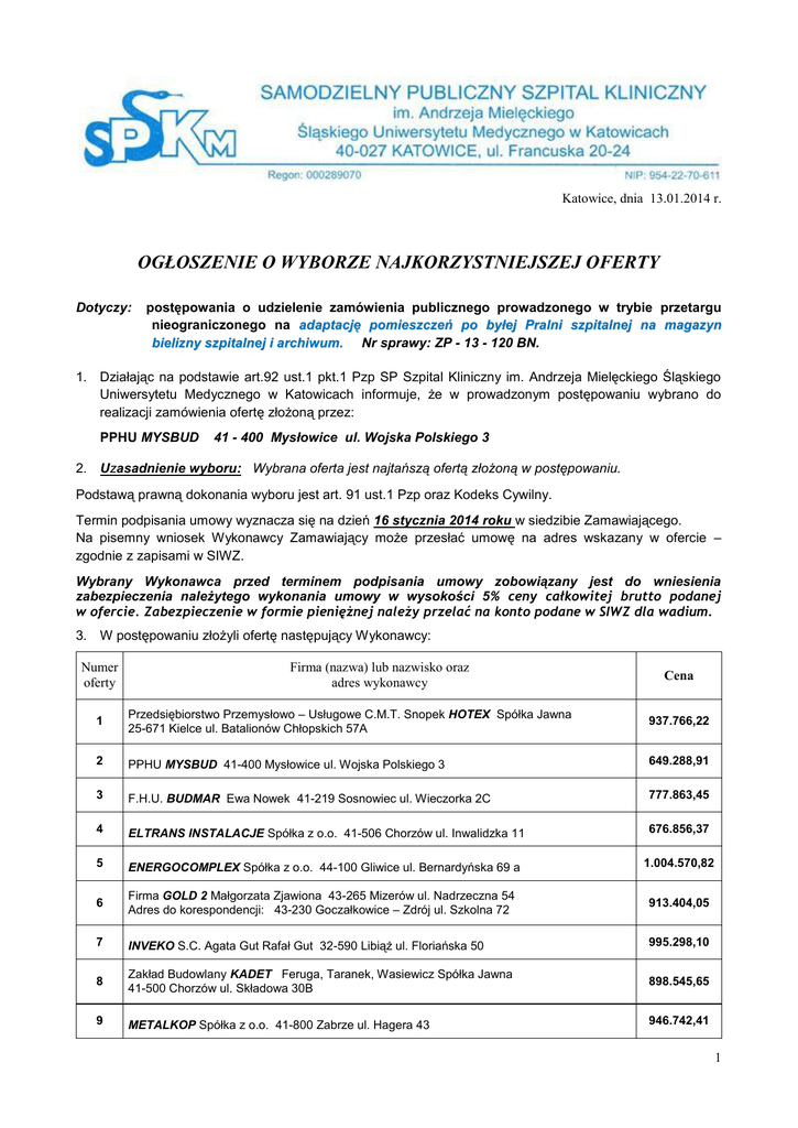 Katowice, dnia 13.01.2014 r. OGŁOSZENIE O WYBORZE NAJKORZYSTNIEJSZEJ OFERTY Dotyczy: postępowania o udzielenie zamówienia publicznego prowadzonego w trybie przetargu nieograniczonego na adaptację pomieszczeń po byłej Pralni szpitalnej na magazyn bielizny szpitalnej i archiwum. Nr sprawy: ZP - 13 - 120 BN. 1. Działając na podstawie art.92 ust.1 pkt.1 Pzp SP Szpital Kliniczny im. Andrzeja Mielęckiego Śląskiego Uniwersytetu Medycznego w Katowicach informuje, że w prowadzonym postępowaniu wybrano do realizacji zamówienia ofertę złożoną przez: PPHU MYSBUD 41 - 400 Mysłowice ul. Wojska Polskiego 3 2. Uzasadnienie wyboru: Wybrana oferta jest najtańszą ofertą złożoną w postępowaniu. Podstawą prawną dokonania wyboru jest art. 91 ust.1 Pzp oraz Kodeks Cywilny. Termin podpisania umowy wyznacza się na dzień 16 stycznia 2014 roku w siedzibie Zamawiającego. Na pisemny wniosek Wykonawcy Zamawiający może przesłać umowę na adres wskazany w ofercie – zgodnie z zapisami w SIWZ. Wybrany Wykonawca przed terminem podpisania umowy zobowiązany jest do wniesienia zabezpieczenia należytego wykonania umowy w wysokości 5% ceny całkowitej brutto podanej w ofercie. Zabezpieczenie w formie pieniężnej należy przelać na konto podane w SIWZ dla wadium. 3. W postępowaniu złożyli ofertę następujący Wykonawcy: Numer oferty Firma (nazwa) lub nazwisko oraz adres wykonawcy Cena 1 Przedsiębiorstwo Przemysłowo – Usługowe C.M.T. Snopek HOTEX Spółka Jawna 25-671 Kielce ul. Batalionów Chłopskich 57A 937.766,22 2 PPHU MYSBUD 41-400 Mysłowice ul. Wojska Polskiego 3 649.288,91 3 F.H.U. BUDMAR Ewa Nowek 41-219 Sosnowiec ul. Wieczorka 2C 777.863,45 4 ELTRANS INSTALACJE Spółka z o.o. 41-506 Chorzów ul. Inwalidzka 11 676.856,37 5 ENERGOCOMPLEX Spółka z o.o. 44-100 Gliwice ul. Bernardyńska 69 a 1.004.570,82 6 Firma GOLD 2 Małgorzata Zjawiona 43-265 Mizerów ul. Nadrzeczna 54 Adres do korespondencji: 43-230 Goczałkowice – Zdrój ul. Szkolna 72 913.404,05 7 INVEKO S.C. Agata Gut Rafał Gut 32-590 Libiąż ul. Floriańska 50 995.298,10 8 Zakład Budowlany KADET Feruga, Taranek, Wasiewicz Spółka Jawna 41-500 Chorzów ul. Składowa 30B 898.545,65 9 METALKOP Spółka z o.o. 41-800 Zabrze ul. Hagera 43 946.742,41 1 10 Zakład Remontowo – Budowlany Zygmunt Laskowski 41-500 Chorzów ul. 11-go Listopada 36 981.994,98 11 EFEKT Spółka z o.o. 41-103 Siemianowice Śląskie ul. Orzeszkowej 4 659.050,05 12 Zakład Usług Remontowo – Budowlanych BAS – BUD Stefan Basak 41-200 Sosnowiec ul. Żeromskiego 1 726.839,75 13 P.W. KANBEX Spółka z o.o. 41-400 Mysłowice ul. Karola Miarki 36 696.889,76 14 WODPOL Spółka z o.o. 34-300 Żywiec ul. Ks. Pr. St. Słonki 24 666.506,24 15 Konsorcjum firm: Lider: Przedsiębiorstwo Produkcyjno – Usługowe PROBUDREM Kazimierz Lipiński Spółka Jawna 42-440 Ogrodzieniec ul. Słowackiego 28 679.923,72 Partner: Przedsiębiorstwo Produkcyjno – Usługowe PROBUDREM Kazimierz Lipiński 42-440 Ogrodzieniec ul. Słowackiego 28 16 Górnośląskie Przedsiębiorstwo usługowo – Prod. – Handlowe RUDEX Spółka Jawna 41-710 Ruda Śląska ul. 1 Maja 241 743.168,16 17 Przedsiębiorstwo Budowlane DERMEX Spółka z o.o. 32-660 Chełmek Plac Kilińskiego 1 673.298,45 18 KARBON 2 Spółka z o.o. 40-142 Katowice ul. Modelarska 11a 693.994,25 19 TERMOBUDOSTAL Spółka z o.o. 41-219 Sosnowiec ul. Lenartowicza 43 768.575,85 4. Działając na podstawie art.92 ust.1 pkt.2 Pzp Zamawiający informuje, że w prowadzonym postępowaniu nie odrzucono żadnej oferty. 5. Działając na podstawie art.92 ust.1 pkt.3 Pzp Zamawiający informuje, że w prowadzonym postępowaniu nie wykluczono żadnego Wykonawcy. Ogłoszenie podpisał w dnia 13 .01.2014 r. Dyrektor SPSKM Dr n. med. Włodzimierz Dziubdziela 2