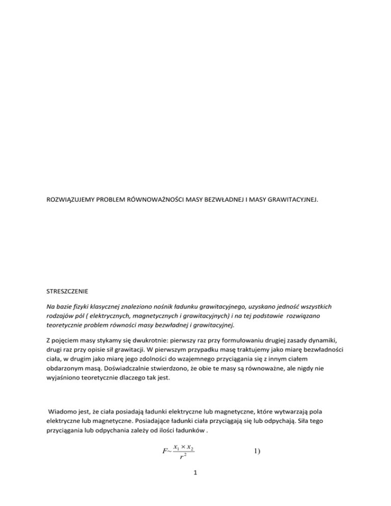 ROZWIĄZUJEMY PROBLEM RÓWNOWAŻNOŚCI MASY BEZWŁADNEJ I MASY GRAWITACYJNEJ. STRESZCZENIE Na bazie fizyki klasycznej znaleziono nośnik ładunku grawitacyjnego, uzyskano jedność wszystkich rodzajów pól ( elektrycznych, magnetycznych i grawitacyjnych) i na tej podstawie rozwiązano teoretycznie problem równości masy bezwładnej i grawitacyjnej. Z pojęciem masy stykamy się dwukrotnie: pierwszy raz przy formułowaniu drugiej zasady dynamiki, drugi raz przy opisie sił grawitacji. W pierwszym przypadku masę traktujemy jako miarę bezwładności ciała, w drugim jako miarę jego zdolności do wzajemnego przyciągania się z innym ciałem obdarzonym masą. Doświadczalnie stwierdzono, że obie te masy są równoważne, ale nigdy nie wyjaśniono teoretycznie dlaczego tak jest. Wiadomo jest, że ciała posiadają ładunki elektryczne lub magnetyczne, które wytwarzają pola elektryczne lub magnetyczne. Posiadające ładunki ciała przyciągają się lub odpychają. Siła tego przyciągania lub odpychania zależy od ilości ładunków . F~ x1 x2 r2 1) 1 F - siła oddziaływania, x - ilość nośników ładunków wywołujących oddziaływania, r - odległość ładunków wywołujących oddziaływania. Trzeci rodzaj pola, pole grawitacyjne różni się istotnie od pól wymienionych wyżej. Siła oddziaływania grawitacyjnego zamiast zależeć od ilości ładunków grawitacyjnych ciała, zależy od masy ciała. 𝐹~ 𝑚1 × 𝑚2 𝑟2 F – siła oddziaływania, m – masy ciał, r – odległość ciał Gołym okiem widać, że coś tu jest nie w porządku. Logika podpowiada, że oddziaływania elektrostatyczne, magnetyczne i grawitacyjne podlegające tym samym zależnościom, powinny być wolne od takich anomalii. Inaczej mówiąc, trzeba znaleźć nośniki ładunku grawitacyjnego w ciele masowym, a wtedy wszystko stanie się jasne, proste i logiczne. W opracowaniu „Krok po kroku do Modelu 31” pokazano jak powstaje grawitacja. Końcowym wnioskiem tego rozumowania jest, że nośnikiem elementarnego ładunku grawitacyjnego jest proton. Ten prosty wniosek powoduje, że natychmiast znika wyżej wzmiankowana różnica między oddziaływaniami elektrycznymi i magnetycznymi oraz grawitacyjnymi. Dla pola elektrostatycznego do wzoru 1) za x podstawiamy ilości elektronów lub pozytonów, wytwarzających ładunki elektrostatyczne w poszczególnych ciałach. Dla pola grawitacyjnego do wzoru 1) za x podstawiamy ilości protonów, wytwarzających ładunki grawitacyjne w poszczególnych ciałach. Pozostaje tylko do wyjaśnienia, dlaczego podstawienie masy ciał do wzoru na siłę grawitacyjną, również spełnia zależność przedstawioną we wzorze 1. W wyjaśnieniu tego pomocne będą wywody dotyczące budowy atomu zawarte w opracowaniu „Krok po kroku do Modelu 31”. Atom zbudowany jest z jądra i elektronów. Jądra atomowe zbudowane są z neutronów i protonów. Neutrony są to protony, których ładunki elektrostatyczne zostały zobojętnione elektronami umieszczonymi bardzo blisko tych protonów i w jednakowej od nich odległości. Ładunki elektrostatyczne pozostałych protonów zostały zobojętnione elektronami umieszczonymi w różnej odległości od tych protonów. Poniżej przedstawiono przykładowy atom argonu na którym widać w/w dwa rodzaje zobojętnionych protonów. 2 3 Wartości liczbowe przy każdym elektronie są to odległości od jądra atomu wyliczone na podstawie klasycznego osiemnastowiecznego wzoru Coulomba. ke 2 Ep r E p = energia potencjalna danego elektronu w atomie (wyznaczona doświadczalnie), Nm 2 k = 9 10 – przenikalność dielektryczna próżni, C2 e = 1,6021765 1019 C – ładunek elementarny elektronu, 9 r – odległość elektronu od jądra. Z powyższego otrzymujemy: 𝑟= 𝑘𝑒 2 𝐸𝑝 Do tej pory było wiadomo, że każdy atom zbudowany jest z protonów, neutronów i elektronów.Teraz powyższe możemy uprościć stwierdzając, że: każdy atom we wszechświecie zbudowany jest ze zobojętnionych protonów i każdy z tych zobojętnionych protonów jest nośnikem elementarnego ładunku grawitacyjnego. Ponieważ każde ciało zbudowane jest z atomów, więc wszystkie ciała we wszechświecie zbudowane są ze zobojętnionych protonów, czyli wszystkie ciała są nośnikami ładunków grawitacyjnych. Powstaje pytanie dlaczego są to protony zobojętnione? Według Modelu 31 proton będąc elementarnym ładunkiem grawitacyjnym jest jednocześnie nośnikiem elementarnego, dodatniego ładunku elektrostatycznego. Siła oddziaływania ładunku elektrostatycznego jest o kilkadziesiąt rzędów wielkości większa od siły oddziaływania grawitacyjnego. Żeby więc oddziaływanie grawitacyjne protonu mogło się ujawnić, jego ładunek elektrostatyczny musi zostać zneutralizowany. Realizuje się to przez zobojętnienie dodatniego ładunku pozytonu ujemnym ładunkiem elektronu. W świetle powyższego, poprawnie powinniśmy napisać tak. Dla pola elektrostatycznego do wzoru 1) za x1 i x2 podstawiamy ilości elektronów lub pozytonów, wytwarzających ładunki elektrostatyczne w poszczególnych ciałach. Dla pola grawitacyjnego do wzoru 1) za x1 i x2 podstawiamy ilości protonów zobojętnionych, wytwarzających ładunki grawitacyjne w poszczególnych ciałach. Ponieważ suma mas protonów zobojętnionych w atomie stanowi dokładnie masę tego atomu, więc możemy przyjąć, że zobojętniony proton jest jednocześnie elementarną jednostką masy. 4 W przedstawiony wyżej sposób uzyskano jedność trzech rodzajów pól (grawitacyjnego, elektrycznego i magnetycznego), której do tej pory nie było. Ponadto wyjaśniony został teoretycznie, istniejący od trzystu lat problem równoważności dwóch mas we wzorach Newtona: masy bezwładnej we wzorze 𝐹 =𝑚×𝑎 masy grawitacyjnej we wzorze 𝐹=𝐺 𝑚1 × 𝑚2 𝑟2 Masa grawitacyjna i masa bezwładna są równoważne dlatego, że zobojętniony proton będąc elementarnym ładunkiem grawitacji jest j