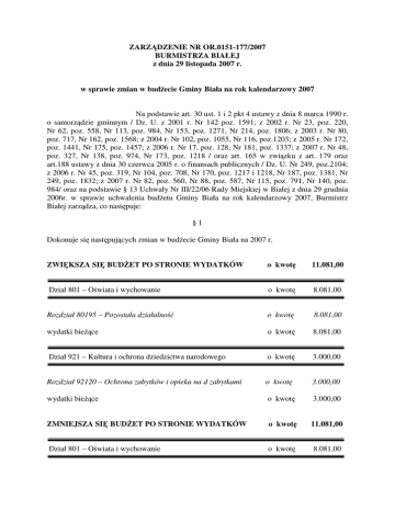 ZARZĄDZENIE NR OR.0151-177/2007 BURMISTRZA BIAŁEJ z dnia 29 listopada 2007 r. w sprawie zmian w budżecie Gminy Biała na rok kalendarzowy 2007 Na podstawie art. 30 ust. 1 i 2 pkt 4 ustawy z dnia 8 marca 1990 r. o samorządzie gminnym / Dz. U. z 2001 r. Nr 142 poz. 1591; z 2002 r. Nr 23, poz. 220, Nr 62, poz. 558, Nr 113, poz. 984, Nr 153, poz. 1271, Nr 214, poz. 1806; z 2003 r. Nr 80, poz. 717, Nr 162, poz. 1568; z 2004 r. Nr 102, poz. 1055, Nr 116, poz.1203; z 2005 r. Nr 172, poz. 1441, Nr 175, poz. 1457; z 2006 r. Nr 17, poz. 128, Nr 181, poz. 1337; z 2007 r. Nr 48, poz. 327, Nr 138, poz. 974, Nr 173, poz. 1218 / oraz art. 165 w związku z art. 179 oraz art.188 ustawy z dnia 30 czerwca 2005 r. o finansach publicznych / Dz. U. Nr 249, poz.2104; z 2006 r. Nr 45, poz. 319, Nr 104, poz. 708, Nr 170, poz. 1217 i 1218, Nr 187, poz. 1381, Nr 249, poz. 1832; z 2007 r. Nr 82, poz. 560, Nr 88, poz. 587, Nr 115, poz. 791, Nr 140, poz. 984/ oraz na podstawie § 13 Uchwały Nr III/22/06 Rady Miejskiej w Białej z dnia 29 grudnia 2006r. w sprawie uchwalenia budżetu Gminy Biała na rok kalendarzowy 2007, Burmistrz Białej zarządza, co następuje: §1 Dokonuje się następujących zmian w budżecie Gminy Biała na 2007 r. ZWIĘKSZA SIĘ BUDŻET PO STRONIE WYDATKÓW o kwotę 11.081,00 Dział 801 – Oświata i wychowanie o kwotę 8.081,00 Rozdział 80195 – Pozostała działalność o kwotę 8.081,00 wydatki bieżące o kwotę 8.081,00 Dział 921 – Kultura i ochrona dziedzictwa narodowego o kwotę 3.000,00 Rozdział 92120 – Ochrona zabytków i opieka na d zabytkami o kwotę 3.000,00 wydatki bieżące o kwotę 3.000,00 ZMNIEJSZA SIĘ BUDŻET PO STRONIE WYDATKÓW o kwotę 11.081,00 Dział 801 – Oświata i wychowanie o kwotę 8.081,00 -2Rozdział 80101 – Szkoły podstawowe o kwotę 8.081,00 wydatki bieżące o kwotę 5.600,00 wydatki majątkowe o kwotę 2.481,00 Dział 921 – Kultura i ochrona dziedzictwa narodowego o kwotę 3.000,00 Rozdział 92120 – Ochrona zabytków i opieka na d zabytkami o kwotę 3.000,00 wydatki majątkowe o kwotę §2 Wielkość budżetu po wprowadzonych zmianach budżet nie ulega zmianie. §3 Zarządzenie niniejsze wchodzi w życie z dniem podjęcia. Burmistrz Białej Arnold Hindera 3.000,00