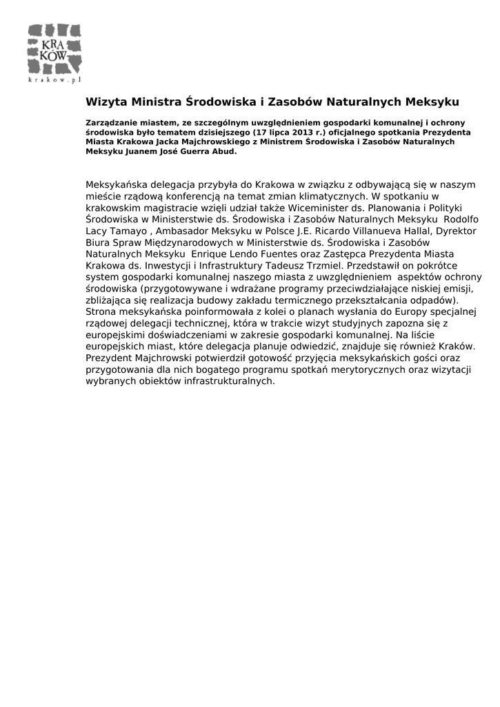 Wizyta Ministra Środowiska i Zasobów Naturalnych Meksyku Zarządzanie miastem, ze szczególnym uwzględnieniem gospodarki komunalnej i ochrony środowiska było tematem dzisiejszego (17 lipca 2013 r.) oficjalnego spotkania Prezydenta Miasta Krakowa Jacka Majchrowskiego z Ministrem Środowiska i Zasobów Naturalnych Meksyku Juanem José Guerra Abud. Meksykańska delegacja przybyła do Krakowa w związku z odbywającą się w naszym mieście rządową konferencją na temat zmian klimatycznych. W spotkaniu w krakowskim magistracie wzięli udział także Wiceminister ds. Planowania i Polityki Środowiska w Ministerstwie ds. Środowiska i Zasobów Naturalnych Meksyku Rodolfo Lacy Tamayo , Ambasador Meksyku w Polsce J.E. Ricardo Villanueva Hallal, Dyrektor Biura Spraw Międzynarodowych w Ministerstwie ds. Środowiska i Zasobów Naturalnych Meksyku Enrique Lendo Fuentes oraz Zastępca Prezydenta Miasta Krakowa ds. Inwestycji i Infrastruktury Tadeusz Trzmiel. Przedstawił on pokrótce system gospodarki komunalnej naszego miasta z uwzględnieniem aspektów ochrony środowiska (przygotowywane i wdrażane programy przeciwdziałające niskiej emisji, zbliżająca się realizacja budowy zakładu termicznego przekształcania odpadów). Strona meksykańska poinformowała z kolei o planach wysłania do Europy specjalnej rządowej delegacji technicznej, która w trakcie wizyt studyjnych zapozna się z europejskimi doświadczeniami w zakresie gospodarki komunalnej. Na liście europejskich miast, które delegacja planuje odwiedzić, znajduje się również Kraków. Prezydent Majchrowski potwierdził gotowość przyjęcia meksykańskich gości oraz przygotowania dla nich bogatego programu spotkań merytorycznych oraz wizytacji wybranych obiektów infrastrukturalnych. Powered by TCPDF (www.tcpdf.org)