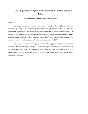 Odpady przemysłowe jako źródło paliwa RDF. Analiza podaży w Polsce Michał Górnik, Tomasz Hada, Armin Reinert Abstrakt Analizując rozwiązania prawne wprowadzane przez Unię Europejską nietrudno jest zauważyć, jak silny nacisk kładziony jest na efektywne wykorzystanie odpadów. Jednym z elementów tego zjawiska jest przekształcanie ich termicznie w celu otrzymania energii. W Polsce można spodziewać się postępującego przechodzenia na ten typ gospodarki. Praca zawiera krótką definicję paliwa alternatywnego RDF, opis metodologii badania oraz analizę struktury podaży na rynku odpadów służących za źródło RDF. Artykuł jest podsumowaniem pracy sześcioosobowej grupy projektowej pracującej w ramach Koła Naukowego Analityki Gospodarczej przy Uniwersytecie Ekonomicznym we Wrocławiu dla jednej z czołowych firm energetycznych operujących w Polsce. Opracowanie zawiera wszystkie istotne aspekty pracy grupy, które nie zostały objęte tajemnicą biznesową. 1