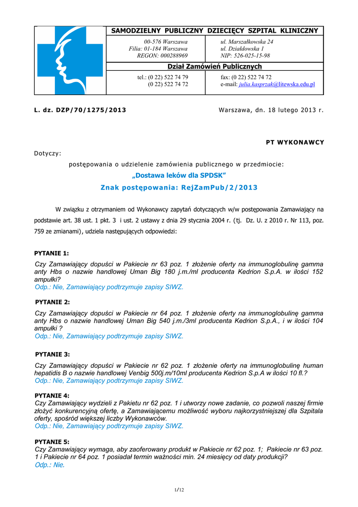 SAMODZIELNY PUBLICZNY DZIECIĘCY SZPITAL KLINICZNY 00-576 Warszawa Filia: 01-184 Warszawa REGON: 000288969 ul. Marszałkowska 24 ul. Działdowska 1 NIP: 526-025-15-98 Dział Zamówień Publicznych tel.: (0 22) 522 74 79 (0 22) 522 74 72 L. dz . D ZP /7 0 /1 2 75 / 2 01 3 fax: (0 22) 522 74 72 e-mail: [email protected] Wars zaw a, dn . 1 8 l u te go 20 13 r. P T W YK ONAW C Y D oty czy : pos tę powan i a o u dzi e l e ni e zamówi e n i a pu bl i czn e go w prze dmi oci e : „Dostawa leków dla SPDSK” Znak postępowania: RejZamPub/2 /2013 W związku z otrzymaniem od Wykonawcy zapytań dotyczących w/w postępowania Zamawiający na podstawie art. 38 ust. 1 pkt. 3 i ust. 2 ustawy z dnia 29 stycznia 2004 r. (tj. Dz. U. z 2010 r. Nr 113, poz. 759 ze zmianami) , udziela następujących odpowiedzi: PYTANIE 1: Czy Zamawiający dopuści w Pakiecie nr 63 poz. 1 złożenie oferty na immunoglobulinę gamma anty Hbs o nazwie handlowej Uman Big 180 j.m./ml producenta Kedrion S.p.A. w ilości 152 ampułki? Odp.: Nie, Zamawiający podtrzymuje zapisy SIWZ. PYTANIE 2: Czy Zamawiający dopuści w Pakiecie nr 64 poz. 1 złożenie oferty na immunoglobulinę gamma anty Hbs o nazwie handlowej Uman Big 540 j.m./3ml producenta Kedrion S.p.A., i w ilości 104 ampułki ? Odp.: Nie, Zamawiający podtrzymuje zapisy SIWZ. PYTANIE 3: Czy Zamawiający dopuści w Pakiecie nr 62 poz. 1 złożenie oferty na immunoglobulinę human hepatidis B o nazwie handlowej Venbig 500j.m/10ml producenta Kedrion S.p.A w ilości 10 fl.? Odp.: Nie, Zamawiający podtrzymuje zapisy SIWZ. PYTANIE 4: Czy Zamawiający wydzieli z Pakietu nr 62 poz. 1 i utworzy nowe zadanie, co pozwoli naszej firmie złożyć konkurencyjną ofertę, a Zamawiającemu możliwość wyboru najkorzystniejszej dla Szpitala oferty, spośród większej liczby Wykonawców. Odp.: Nie, Zamawiający podtrzymuje zapisy SIWZ. PYTANIE 5: Czy Zamawiający wymaga, aby zaoferowany produkt w Pakiecie nr 62 poz. 1; Pakiecie nr 63 poz. 1 i Pakiecie nr 64 poz. 1 posiadał termin ważności min. 24 miesięcy od daty produkcji? Odp.: Nie. 1/12 PYTANIE 6: Czy Zamawiający wymaga, w trosce o dobro pacjentów, aby preparaty immunoglobulin, w Pakiecie nr 62 poz. 1; Pakiecie nr 63 poz. 1 i Pakiecie nr 64 poz. 1 posiadały certyfikat jakości plazmy QSEAL – Quality Standard of Excellence, Assurance and Leadership, tj.: międzynarodowy dobrowolny certyfikat jakości plazmy, wydawany przez PPTA (Plasma Protein Therapeustics Association) potwierdzający wysoką jakość i bezpieczeństwo produktu, a także stwierdzający, iż centra poboru plazmy posiadają wdrożone najwyższej jakości procedury. Certyfikat ten posiada większość producentów leków krwiopochodnych na świecie. Odp.: Nie. PYTANIE 7: Czy Zamawiający wyraża zgodę na zamianę postaci form doustnych, tj. wycenę: zamiast tabletek – tabletki powlekane, kapsułki (w tym twarde i elastyczne) lub drażetki? zamiast tabletek powlekanych –tabletki, kapsułki (w tym twarde i elastyczne) lub drażetki? zamiast kapsułek (w tym twardych i elastycznych)-tabletki powlekane, tabletki, lub drażetki? Zamiast drażetek – kapsułki, tabletki lub tabletki powlekane? Zamiast: (tabletek , tabletek powlekanych lub kapsułek –twardych, elastycznych) o powolnym uwalnianiu –(tabletki, tabletki powl. lub kapsułki twarde, elastyczne) o zmodyfikowanym uwalnianiu? Celem zaoferowania korzystniejszej oferty cenowej. Odp.: Zamawiający prosi o zadawanie tego typu pytań w odniesieniu do konkretnej pozycji. Nie możemy wyrazić zgody bez przeanalizowania konkretnych leków. Część leków musi być w postaci zwykłych tabletek ponieważ musimy je dzielić na dawki indywidualne. Zamiana z postaci zwykłej na tabletki powlekane lub drażetki może też zmieniać własności leku itp. PYTANIE 8: Czy Zamawiający wyraża zgodę na zamianę postaci form iniekcyjnych: ampułek zamiast fiolek i odwrotnie? Celem zaoferowania korzystniejszej oferty cenowej. Odp.: Jako zasada nie, często z fiolki można pobierać lek kilkukrotnie a ampułka jest do zużycia po jednorazowym otwarciu, trzeba przeanalizować każde zapytanie osobno (w odniesieniu do konkretnego leku). PYTANIE 9: Czy w formularzu cenowym Zamawiający wyrazi zgodę na podanie ceny jednostkowej netto za opakowanie handlowe (kol.8)? Odp.: Tak. PYTANIE 10: Czy Zamawiający wyrazi zgodę na umieszczenie pod pakietem adnotacji o brakach dostępności, zakończonych produkcjach, problemach z dostępnością preparatów, które to problemy mogą pojawić się na etapie przygotowywania oferty? Odp.: Zamawiający wyraża zgodę na adnotację , jednak nie rodzi to konsekwencji w postaci zgody na nie wycenianie lub wykreślenie danej pozycji / leku, chyba, że Zmawiający wyraził na to zgodę wcześniej. PYTANIE 11: Czy w pakiecie 1 poz. 15 Acidum acetylosalicylicum tabl powl dojel 75mg – Zamawiający dopuści preparat w postaci tabletek dojelitowych 75mg? Celem zaoferowania korzystniejszej oferty cenowej. Odp.: Tak. PYTANIE 12: Proszę Zamawiającego o sprecyzowanie: w pakiecie 1 poz. 17 Acidum adcorbicum+chlorhexidinum tabl do ssania – Zamawiający wymaga wyceny preparatu w dawce Acidum ascorbicum 0,05g + chlorhexidinum 0,005g? Odp.: Tak. 2/12 PYTANIE 13: Czy w pakiecie 1 poz. 18 Acidum boricum 3% 200ml – Zamawiający dopuści wycenę preparatu w dawce 3% (30mg/g) 200g – w ilości 500 opakowań? Pojemność 200ml nie występuje. Odp.: Tak. PYTANIE 14: Czy w pakiecie 1 poz. 19 Acidum boricum 3% 500ml – Zamawiający dopuści wycenę preparatu w dawce 3% (30mg/g) 500g – w ilości 100 opakowań? Pojemność 500ml nie wsytępuje. Odp.: Tak. PYTANIE 15: Czy Zamawiający wyrazi zgodę na wykreślenie z pakietu 1 poz. 21 Acidum acetylsalicylicum+Flumetasonum maść – ze względu na problemy produkcyjne i brak zamiennika? Odp.: Nie. PYTANIE 16: Czy w pakiecie 1 poz. 23 Acidum ursodeoxycholicum kaps 250mg – Zamawiający dopuści wycenę preparatu w postaci tabletek? Celem zaoferowania 