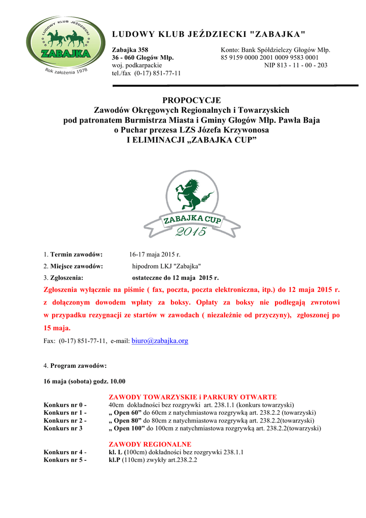 LUDOWY KLUB JEŹDZIECKI "ZABAJKA" Zabajka 358 36 - 060 Głogów Młp. woj. podkarpackie tel./fax (0-17) 851-77-11 Konto: Bank Spółdzielczy Głogów Młp. 85 9159 0000 2001 0009 9583 0001 NIP 813 - 11 - 00 - 203 PROPOCYCJE Zawodów Okręgowych Regionalnych i Towarzyskich pod patronatem Burmistrza Miasta i Gminy Głogów Młp. Pawła Baja o Puchar prezesa LZS Józefa Krzywonosa I ELIMINACJI „ZABAJKA CUP” 1. Termin zawodów: 16-17 maja 2015 r. 2. Miejsce zawodów: hipodrom LKJ "Zabajka" 3. Zgłoszenia: ostateczne do 12 maja 2015 r. Zgłoszenia wyłącznie na piśmie ( fax, poczta, poczta elektroniczna, itp.) do 12 maja 2015 r. z dołączonym dowodem wpłaty za boksy. Opłaty za boksy nie podlegają zwrotowi w przypadku rezygnacji ze startów w zawodach ( niezależnie od przyczyny), zgłoszonej po 15 maja. Fax: (0-17) 851-77-11, e-mail: [email protected] 4. Program zawodów: 16 maja (sobota) godz. 10.00 Konkurs nr 0 Konkurs nr 1 Konkurs nr 2 Konkurs nr 3 ZAWODY TOWARZYSKIE i PARKURY OTWARTE 40cm dokładności bez rozgrywki art. 238.1.1 (konkurs towarzyski) „ Open 60” do 60cm z natychmiastowa rozgrywką art. 238.2.2 (towarzyski) „ Open 80” do 80cm z natychmiastowa rozgrywką art. 238.2.2(towarzyski) „ Open 100” do 100cm z natychmiastowa rozgrywką art. 238.2.2(towarzyski) Konkurs nr 4 Konkurs nr 5 - ZAWODY REGIONALNE kl. L (100cm) dokładności bez rozgrywki 238.1.1 kl.P (110cm) zwykły art.238.2.2 Konkurs nr 6 - kl. N (120cm) dwufazowy art. 274.5.3. 17 maja (niedziela) godz.9,30 ZAWODY TOWARZYSKIE i PARKURY OTWARTE Konkurs nr 0 40cm dokładności bez rozgrywki art. 238.1.1 (konkurs towarzyski) Konkurs nr 7 „ Open 60” do 60cm z natychmiastowa rozgrywką art. 238.2.2 (towarzyski) Konkurs nr 8 „ Open 80” do 80cm z natychmiastowa rozgrywką art. 238.2.2( towarzyski) Konkurs nr 9 „ Open 100” do 100cm z natychmiastowa rozgrywką art. 238.2.2( towarzyski) Konkurs nr 10 Konkurs nr 11 Konkurs nr 12 - ZAWODY REGIONALNE kl. L (100cm) dokładności bez rozgrywki 238.1.1 kl.P (110cm) dwufazowy art. 274.5.3. kl. N (120cm) zwykły z rozgrywką art.238.2.2 MEMORIAŁ MARKA MISAKIEWICZA IIIIII- 500zł 300zł 200zł KONKURSY 1,2,3,7,8,9 zaliczane do I eliminacji „ZABAJKA CUP” Pozostałe konkursy to zawody regionalne Sobota GODZINA 20.00 OGNISKO DLA WSZYSTKICH ZAWODNIKÓW, TRENERÓW, LUZAKÓW, SZEFÓW EKIP, WŁAŚCICIELI KONI 6. OPŁATY Opłaty za start - tylko w „ZABJKA CUP” opłata od zawodnika 100zł + boks 50zł od konia za całe zawody - „ZABAJKACUP” + PARKURY OTWARTE+ ZAWODY REGIONALNE opłata od zawodnika 150zł + boks 50zł od konia za całe zawody - ZAWODY REGIONALNE opłata od zawodnika 150zł + boks 50zł od konia za całe zawody - tylko PARKURY OTWARTE opłata za zawodnika 80zł + boks 50zł od konia za całe zawody - start za 1 dzień zawodów ( „ZABAJKA CUP” lub PARKURY OTWARTE lub „ZABAJKA CUP” + PARKURY OTWARTE + ZAWODY REGIONALNE ) 100zł od zawodnika (w tym boks) Boksy przygotowane 15 MAJA 2015r., godz. 16.00. Wpłaty można przelać na konto Bank Spółdzielczy Głogów Młp. 85 9159 0000 2001 0009 9583 0001 Opłata organizacyjna musi być uregulowana na godzinę przed rozpoczęciem pierwszego konkursu. W przypadku nieuregulowania opłat, do startu nie zostanie dopuszczona cała ekipa. - cisza nocna w stajni od godz. 22.00 – 6.00 - prosimy o przestrzeganie przepisów BHP i p.poż. 7. Zakwaterowanie: Zawodnicy, szefowie ekip, trenerzy, luzacy – noclegi na własny koszt. Można dokonać rezerwacji w LKJ „Zabajka”: -stare domki 2- osobowe: cena 25 zł od osoby z własnymi śpiworami; -nowe domki 2-osobowe: cena 35 zł od osoby. -w 6 pokojach gościnnych po 45zł/os. - Hotel „Trzy Korony” Rudna Mała 2c, 36-060 Głogów Młp.; tel. (17) 7411214 - Hotel „Lider” Głogów Młp. ul. Piekarska 2; tel. (0-17) 851-70-25 - "Oaza" Głogów Młp.; tel. (017) 8517273 Wyżywienie: We własnym zakresie w Barze MUSTANG na terenie zawodów. 8. Warunki techniczne: zawody odbywać się będą na terenie otwartym tor konkursowy, wymiary: 70 x 80 [m]– podłoże piaszczysto-trawiaste rozprężania, wymiary: 35 x 70 [m] – podłoże piaszczyste 9. Klasyfikacja ogólna: - flots dla 25% startujących w konkursie, - po każdym konkursie odbędzie się dekoracja zwycięzców. 10. Zebranie techniczne: nie przewiduje się zebrania technicznego Sprawdzanie dokumentów koni i zawodników odbędzie się w biurze zawodów w dniu 16maja 2014 r. ( sobota). 11. Uczestnictwo: W „ZABAJKA CUP”: Zgodnie z Regulaminem http://www.zabajka.org/wp-content/uploads/2014/03/zabajka_cup_2014.pdf W PARKURACH OTWARTYCH: Mogą startować zawodnicy / konie posiadające aktualne szczepienia oraz ważne badania sportowe zawodników, ubezpieczenie NNW, dla niepełnoletnich zgoda rodziców. 12. Osoby oficjalne: Komisja sędziowska: Przewodniczący WZJ: Komisarz: E.Brodecka A.Kloc B.Galuba III: B.Winiarska, A.Podolak Gospodarz toru A. Galuba Lekarz weterynarii dr Jacek Sołtyski, Tel.: 500 049 955 13. Informacje ogólne: Odpowiedzialność: Organizatorzy nie ponoszą odpowiedzialności z tytułu wypadków i zachorowań trenerów, zawodników, luzaków i koni, jak również w przypadku kradzieży, zniszczeń, pożarów i innych wydarzeń wynikłych w czasie transportu i trwania zawodów. Organizacja zawodów: W nadzwyczajnych okolicznościach nieprzewidzianych przepisami, organizator zastrzega sobie prawo do odwołania zwodów. Ubezpieczenie: Przypominamy o obowiązkowym ubezpieczeniu NNW zawodników oraz aktualnych badaniach zawodników. Wstęp do stajni: Poza osobami oficjalnymi, prawo wstępu do stajni mają tylko: szefowie ekip, trenerzy, zawodnicy, luzacy, właściciele koni. 14. Listy startowe: Dokonanie zmian na listach startowych (po ich wywieszeniu) za zgodą Sędziego Głównego – 0 zł. 15. Protesty i skargi (art. 65 i art.66 Przepisów ogólnych PZJ) Każdy protest i skarga, ażeby były ważne, muszą być zgłoszone na piśmie z dołączeniem kaucji w wysokości 20