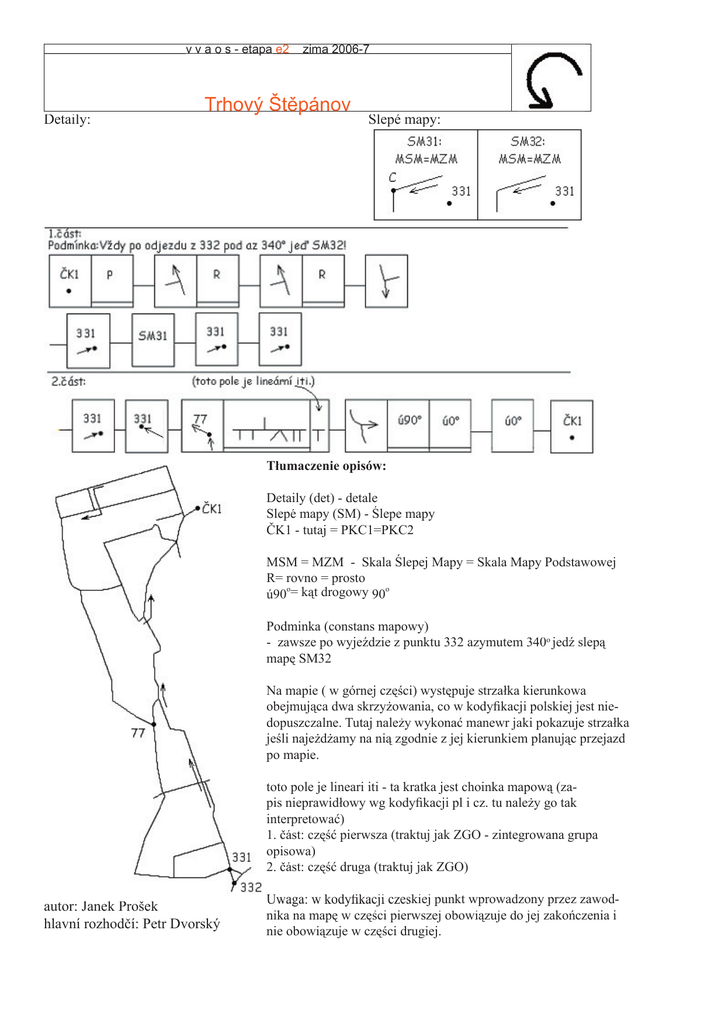 v v a o s - etapa e2 Detaily: zima 2006-7 Trhovýý Š Štěpánov p Slepé mapy: Tłumaczenie opisów: Detaily (det) - detale Slepé mapy (SM) - Ślepe mapy ČK1 - tutaj = PKC1=PKC2 MSM = MZM - Skala Ślepej Mapy = Skala Mapy Podstawowej R= rovno = prosto o o ú90 = kąt drogowy 90 Podminka (constans mapowy) - zawsze po wyjeździe z punktu 332 azymutem 340o jedź slepą mapę SM32 Na mapie ( w górnej części) występuje strzałka kierunkowa obejmująca dwa skrzyżowania, co w kodyfikacji polskiej jest niedopuszczalne. Tutaj należy wykonać manewr jaki pokazuje strzałka jeśli najeżdżamy na nią zgodnie z jej kierunkiem planując przejazd po mapie. toto pole je lineari iti - ta kratka jest choinka mapową (zapis nieprawidłowy wg kodyfikacji pl i cz. tu należy go tak interpretować) 1. část: część pierwsza (traktuj jak ZGO - zintegrowana grupa opisowa) 2. část: część druga (traktuj jak ZGO) autor: Janek Prošek hlavní rozhodčí: Petr Dvorský Uwaga: w kodyfikacji czeskiej punkt wprowadzony przez zawodnika na mapę w części pierwszej obowiązuje do jej zakończenia i nie obowiązuje w części drugiej.