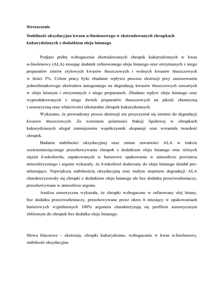 Streszczenie Stabilność oksydacyjna kwasu α-linolenowego w ekstrudowanych chrupkach kukurydzianych z dodatkiem oleju lnianego Podjęto próbę wzbogacenia ekstrudowanych chrupek kukurydzianych w kwas α-linolenowy (ALA) stosując dodatek rafinowanego oleju lnianego oraz otrzymanych z niego preparatów estrów etylowych kwasów tłuszczowych i wolnych kwasów tłuszczowych w ilości 5%. Celem pracy było zbadanie wpływu procesu ekstruzji przy zastosowaniu jednoślimakowego ekstrudera autogennego na degradację kwasów tłuszczowych zawartych w oleju lnianym i otrzymanych z niego preparatach. Zbadano wpływ oleju lnianego oraz wyprodukowanych z niego dwóch preparatów tłuszczowych na jakość chemiczną i sensoryczną oraz właściwości teksturalne chrupek kukurydzianych. Wykazano, że prowadzony proces ekstruzji nie przyczyniał się istotnie do degradacji kwasów tłuszczowych. Ze wzrostem polarności frakcji lipidowej w chrupkach kukurydzianych ulegał zmniejszeniu współczynnik ekspansji oraz wzrastała twardość chrupek. Badania stabilności oksydacyjnej oraz zmian zawartości ALA w trakcie sześciomiesięcznego przechowywania chrupek z dodatkiem oleju lnianego oraz różnych stężeń δ-tokoferolu, zapakowanych w barierowe opakowania w atmosferze powietrza atmosferycznego i argonu wykazały, że δ-tokoferol dodawany do oleju lnianego działał proutleniająco. Największą stabilnością oksydacyjną oraz małym stopniem degradacji ALA charakteryzowały się chrupki z dodatkiem oleju lnianego ale bez dodatku przeciwutleniaczy, przechowywane w atmosferze argonu. Analiza sensoryczna wykazała, że chrupki wzbogacone w rafinowany olej lniany, bez dodatku przeciwutleniaczy, przechowywane przez okres 6 miesięcy w opakowaniach barierowych wypełnionych 100% argonem charakteryzują się profilem sensorycznym zbliżonym do chrupek bez dodatku oleju lnianego. Słowa kluczowe – ekstruzja, chrupki kukurydziane, wzbogacanie w kwas α-linolenowy, stabilność oksydacyjna Abstract Oxidative Stability of α-Linolenic Acid in Corn Chips Enriched with Linseed Oil An attempt was made to enrich extruded corn crisps with α-linolenic acid (ALA) through the addition of refined linseed oil and some preparations obtained from the linseed oil such as ethyl ester and free fatty acids at an amount of 5 %. The aim of this work was to investigate: the influence of the corn crisp extrusion process using a single-screw autogenous extruder on the degradation of fatty acids in linseed oil and preparations obtained from it, their influence on the chemical quality, sensory characteristic and textural properties of corn crisps. The extrusion process did not degrade the fatty acids significantly. Expansion ratio decreased, the hardness of the crisps increased, increased with rising polarity of the lipid fraction. The following were tested: oxidative stability, and changes to the content of ALA during 6-month storage of crisps with the addition of linseed oil and various concentrations of δ-tocopherol. The crisps were packed in barrier film packages, using either atmospheric air of argon for the packaging process. The study showed that with each applied concentration of δ-tocopherol added to the linseed oil, it had a strong pro-oxidant effect. The crisps with the addition of linseed oil but with no antioxidants added, stored under an argon atmosphere, exhibited the highest oxidative stability and a low degradation degree of ALA. Sensory analysis revealed, that ALA-enriched crisps without the addition of antioxidants maintain the original sensory profile similar to the profile of crisps without the addition of linseed oil after 6 months of storage if they are packed in barrier packaging filled 100 % with argon. Keywords - Extrusion, Corn crisps, Alpha linolenic acid enrichment, Oxidative stability
