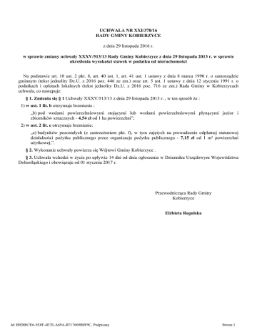 UCHWAŁA NR XXI/378/16 RADY GMINY KOBIERZYCE z dnia 29 listopada 2016 r. w sprawie zmiany uchwały XXXV/513/13 Rady Gminy Kobierzyce z dnia 29 listopada 2013 r. w sprawie określenia wysokości stawek w podatku od nieruchomości Na podstawie art. 18 ust. 2 pkt. 8, art. 40 ust. 1, art. 41 ust. 1 ustawy z dnia 8 marca 1990 r. o samorządzie gminnym (tekst jednolity Dz.U. z 2016 poz. 446 ze zm.) oraz art. 5 ust. 1 ustawy z dnia 12 stycznia 1991 r. o podatkach i opłatach lokalnych (tekst jednolity Dz.U. z 2016 poz. 716 ze zm.) Rada Gminy w Kobierzycach uchwala, co następuje: § 1. Zmienia się § 1 Uchwały XXXV/513/13 z dnia 29 listopada 2013 r. , w ten sposób że : 1) w ust. 1 lit. b otrzymuje brzmienie : „b) pod wodami powierzchniowymi stojącymi lub wodami powierzchniowymi płynącymi jezior i zbiorników sztucznych - 4,54 zł od 1 ha powierzchni”; 2) w ust. 2 lit. e otrzymuje brzmienie: „e) budynków pozostałych (z zastrzeżeniem pkt. f), w tym zajętych na prowadzenie odpłatnej statutowej działalności pożytku publicznego przez organizacje pożytku publicznego - 7,15 zł od 1 m² powierzchni użytkowej,”. § 2. Wykonanie uchwały powierza się Wójtowi Gminy Kobierzyce . § 3. Uchwała wchodzi w życie po upływie 14 dni od dnia ogłoszenia w Dzienniku Urzędowym Województwa Dolnośląskiego i obowiązuje od 01 stycznia 2017 r. Przewodnicząca Rady Gminy Kobierzyce Elżbieta Regulska Id: B9DB67E6-5E8F-4E7E-A69A-B717669B0F9C. Podpisany Strona 1 UZASADNIENIE Zgodnie z art. 5 ust1 ustawy z dnia 12 stycznia 1991 r. o podatkach i opłatach lokalnych ( tekst jednolity z 2016 r. poz. 716 ze zm. ) Rada Gminy prowadząc politykę fiskalna na terenie objętym jej działaniem, może określić niższe stawki od opublikowanych przez ministra finansów . W obwieszczeniu z dnia 28 lipca 2016 r minister finansów określił górne stawki podatków i opłat w 2017r. W związku z powyższym rada gminy, w celu urealnienia dochodów Gminy , ma prawo podjąć decyzję o zwiększeniu stawek podatków i opłat lokalnych. W projekcie Uchwały przyjęto niższe stawki od publikowanych przez ministra finansów, pozwalające jednak na zapewnienie wzrostu dochodów z tytułu podatku od nieruchomości. W proponowanym projekcie zmianie ulegnie stawka podatku od nieruchomości : a) od gruntów : - pod wodami powierzchniowymi stojącymi lub wodami powierzchniowymi płynącymi jezior i zbiorników sztucznych w wysokości maksymalnej ogłoszonej stawki. Usuwa się z opisu stawki podatkowej budynków pozostałych (ust.1 lit. b) nazwę "garaże wieostanowiskowe„ - brak nazewnictwa w w/w ustawie. Górne granice stawek obowiązujące w danym roku ulegają corocznie zmianie na następny rok podatkowy w stopniu odpowiadającymi wskaźnikowi cen towarów i usług konsumpcyjnych w okresie pierwszego półrocza roku, w którym stawki ulegają zmianie, w stosunku do analogicznego okresu roku poprzedniego. Z uwagi na fakt iż obowiązujące stawki w podatku od nieruchomości w Gminie Kobierzyce są niższe niż ogłoszone w obwieszczeniu, zastosowano zmianę stawek podatkowych, aby zminimalizować rozbieżności pomiędzy nimi i utrzymać wzrostową tendencję dochodów. Id: B9DB67E6-5E8F-4E7E-A69A-B717669B0F9C. Podpisany Strona 1