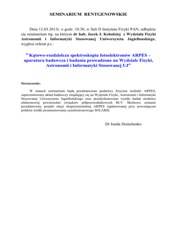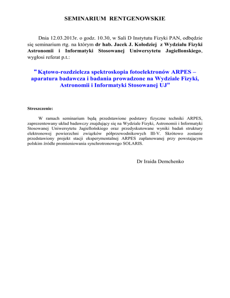 SEMINARIUM RENTGENOWSKIE Dnia 12.03.2013r. o godz. 10.30, w Sali D Instytutu Fizyki PAN, odbędzie się seminarium rtg. na którym dr hab. Jacek J. Kołodziej z Wydziału Fizyki Astronomii i Informatyki Stosowanej Uniwersytetu Jagiellonskiego, wygłosi referat p.t.: " Kątowo-rozdzielcza spektroskopia fotoelektronów ARPES – aparatura badawcza i badania prowadzone na Wydziale Fizyki, Astronomii i Informatyki Stosowanej UJ” Streszczenie: W ramach seminarium będą przedstawione podstawy fizyczne techniki ARPES, zaprezentowany układ badawczy znajdujący się na Wydziale Fizyki, Astronomii i Informatyki Stosowanej Uniwersytetu Jagiellońskiego oraz przedyskutowane wyniki badań struktury elektronowej powierzchni związków półprzewodnikowych III-V. Skrótowo zostanie przedstawiony projekt stacji eksperymentalnej ARPES zaplanowanej przy powstającym polskim źródle promieniowania synchrotronowego SOLARIS. Dr Iraida Demchenko