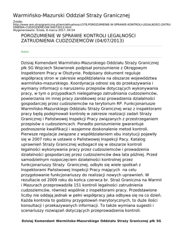 Warmińsko-Mazurski Oddział Straży Granicznej Źródło: http://www.wm.strazgraniczna.pl/wm/aktualnosci/378,POROZUMIENIE-W-SPRAWIE-KONTROLI-LEGALNOSCI-ZATRU DNIENIA-CUDZOZIEMCOW-04072013.html Wygenerowano: Środa, 8 marca 2017, 04:54 POROZUMIENIE W SPRAWIE KONTROLI LEGALNOŚCI ZATRUDNIENIA CUDZOZIEMCÓW (04/07/2013) Autor: Dzisiaj Komendant Warmińsko-Mazurskiego Oddziału Straży Granicznej płk SG Wojciech Skowronek podpisał porozumienie z Okręgowym Inspektorem Pracy w Olsztynie. Podpisany dokument reguluje współpracę stron w zakresie współdziałania na obszarze województwa warmińsko-mazurskiego. Koordynacja odnosi się do przekazywania i wymiany informacji o naruszeniu przepisów dotyczących wykonywania pracy, w tym o przypadkach nielegalnego zatrudniania cudzoziemców, powierzania im innej pracy zarobkowej oraz prowadzenia działalności gospodarczej przez cudzoziemców na terytorium RP. Funkcjonariusze Warmińsko-Mazurskiego Oddziału Straży Granicznej wraz z inspektorami pracy będą podejmowali kontrolę w zakresie realizacji zadań Straży Granicznej i Państwowej Inspekcji Pracy związanych z przestrzeganiem przepisów o cudzoziemcach. Ponadto porozumienie gwarantuje podnoszenie kwalifikacji i wzajemne doskonalenie metod kontroli. Pierwsze regulacje związane z współdziałaniem obu instytucji pojawiły się w 2007 roku w ustawie o Państwowej Inspekcji Pacy. Katalog uprawnień Straży Granicznej wzbogacił się w obszarze kontroli legalności wykonywania pracy przez cudzoziemców i prowadzenia działalności gospodarczej przez cudzoziemców dwa lata później. Przed samodzielnym rozpoczęciem działalności kontrolnej przez funkcjonariuszy Straży Granicznej, odbyło się wiele spotkań z Inspektorami Państwowej Inspekcji Pracy mających na celu przygotowanie funkcjonariuszy do realizacji nowych uprawnień. W rezultacie od 2009 roku do końca czerwca br. Straż Graniczna na Warmii i Mazurach przeprowadziła 151 kontroli legalności zatrudnienia cudzoziemców, również wspólnie z inspektorami pracy. Przedstawione liczby nie oddają jednak w pełni współpracy jaka odbywa się na co dzień. Każda kontrola to godziny przygotowań merytorycznych, to duże ilości konsultacji i przekazywanych informacji. To także wymiana sugestii i scenariuszy rozwiązań dotyczących przeprowadzenia kontroli. Dzisiaj Komendant Warmińsko-Mazurskiego Oddziału Straży Granicznej płk SG Wojciech Skowronek podpisał porozumienie z Okręgowym Inspektorem Pracy w Olsztynie. Podpisany dokument reguluje współpracę stron w zakresie współdziałania na obszarze województwa warmińsko-mazurskiego. Koordynacja odnosi się do przekazywania i wymiany informacji o naruszeniu przepisów dotyczących wykonywania pracy, w tym o przypadkach nielegalnego zatrudniania cudzoziemców, powierzania im innej pracy zarobkowej oraz prowadzenia działalności gospodarczej przez cudzoziemców na terytorium RP. Funkcjonariusze Warmińsko-Mazurskiego Oddziału Straży Granicznej wraz z inspektorami pracy będą podejmowali kontrolę w zakresie realizacji zadań Straży Granicznej i Państwowej Inspekcji Pracy związanych z przestrzeganiem przepisów o cudzoziemcach. Ponadto porozumienie gwarantuje podnoszenie kwalifikacji i wzajemne doskonalenie metod kontroli. Pierwsze regulacje związane z współdziałaniem obu instytucji pojawiły się w 2007 roku w ustawie o Państwowej Inspekcji Pacy. Katalog uprawnień Straży Granicznej wzbogacił się w obszarze kontroli legalności wykonywania pracy przez cudzoziemców i prowadzenia działalności gospodarczej przez cudzoziemców dwa lata później. Przed samodzielnym rozpoczęciem działalności kontrolnej przez funkcjonariuszy Straży Granicznej, odbyło się wiele spotkań z Inspektorami Państwowej Inspekcji Pracy mających na celu przygotowanie funkcjonariuszy do realizacji nowych uprawnień. W rezultacie od 2009 roku do końca czerwca br. Straż Graniczna na Warmii i Mazurach przeprowadziła 151 kontroli legalności zatrudnienia cudzoziemców, również wspólnie z inspektorami pracy. Przedstawione liczby nie oddają jednak w pełni współpracy jaka odbywa się na co dzień. Każda kontrola to godziny przygotowań merytorycznych, to duże ilości konsultacji i przekazywanych informacji. To także wymiana sugestii i scenariuszy rozwiązań dotyczących przeprowadzenia kontroli.